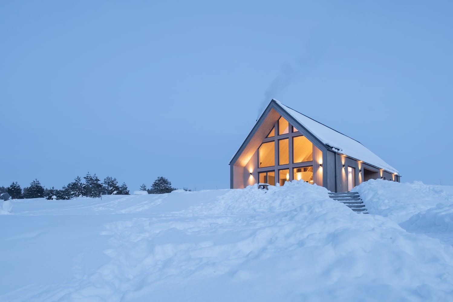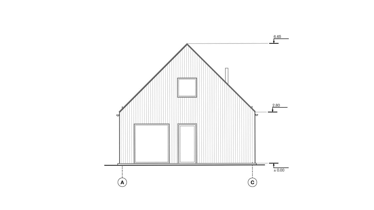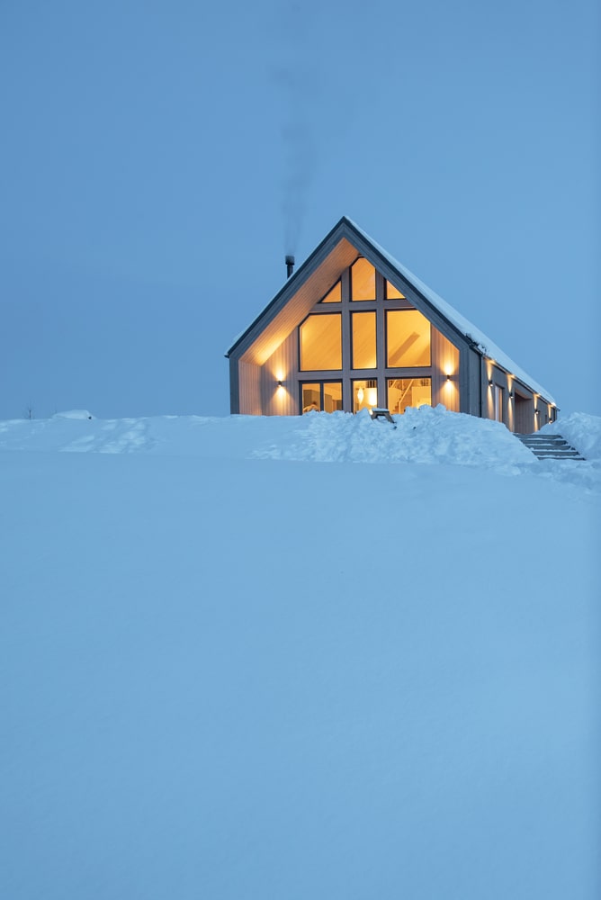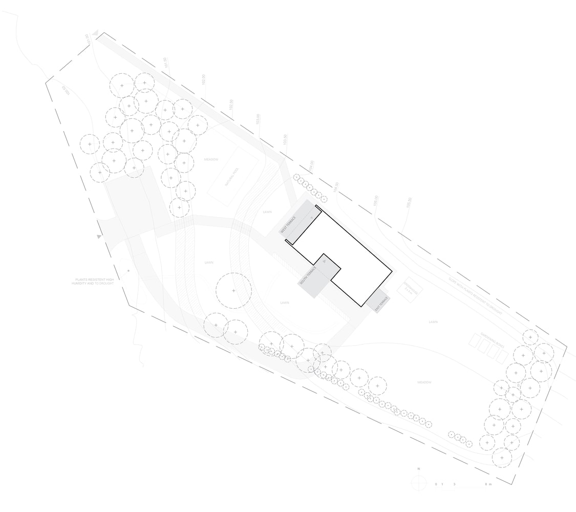 Z uwagi na ścisłe regulacje budowlane, projekt musiał spełniać określone wymagania dotyczące konstrukcji, wysokości oraz kąta nachylenia dachu. Jednak kluczowym aspektem było harmonijne wkomponowanie budynku w naturalne otoczenie. Architekci szczegółowo przeanalizowali ścieżkę słońca, by maksymalnie wykorzystać światło dzienne i stworzyć optymalne warunki do życia. Dom o powierzchni 145 m² usytuowano na szczycie wzgórza, co pozwoliło otworzyć wnętrze na panoramiczne widoki lasu. Cała działka została funkcjonalnie podzielona na strefy. Od strony zachodniej powstała przestrzeń rekreacyjna, natomiast od wschodu zlokalizowano prywatną szklarnię oraz ogród warzywny, wpisujące się w ideę ekologicznego życia.