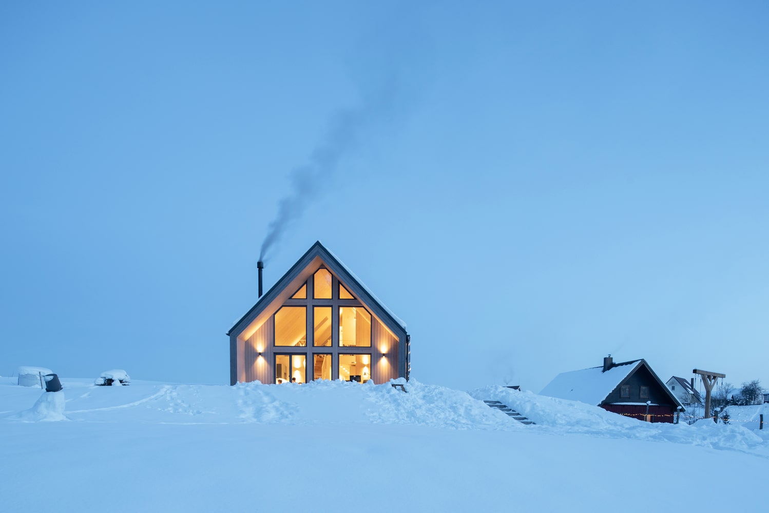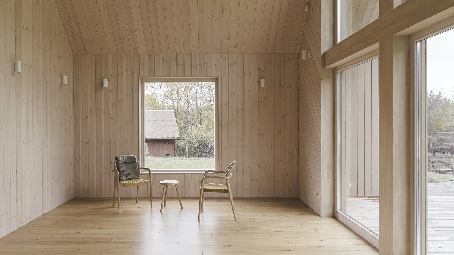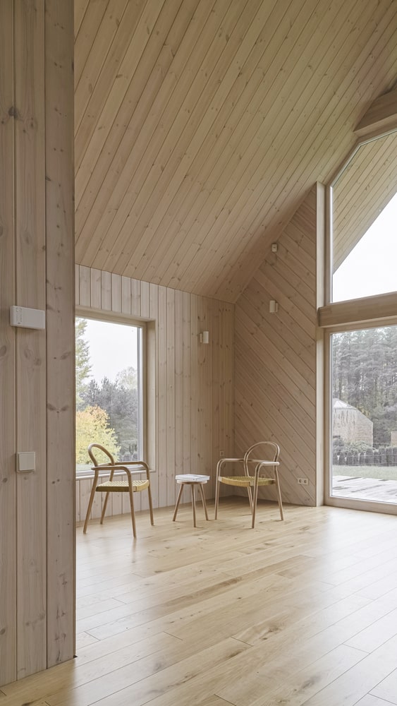 Duże przeszklenia sprawiają, że granica między wnętrzem a otoczeniem niemal zanika. Dom otwiera się na krajobraz poprzez trzy tarasy, które umożliwiają mieszkańcom podążanie za słońcem przez cały dzień. Poranna kawa na wschodnim tarasie, relaks w południowym słońcu i wieczorny odpoczynek na zachodnim tarasie z widokiem na las – to naturalny rytm życia w tym wyjątkowym miejscu. Główny taras od strony zachodniej prowadzi do naturalnego basenu kąpielowego, który dodatkowo podkreśla związek domu z przyrodą.