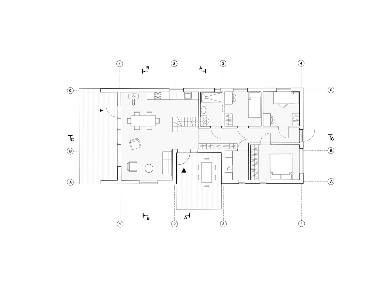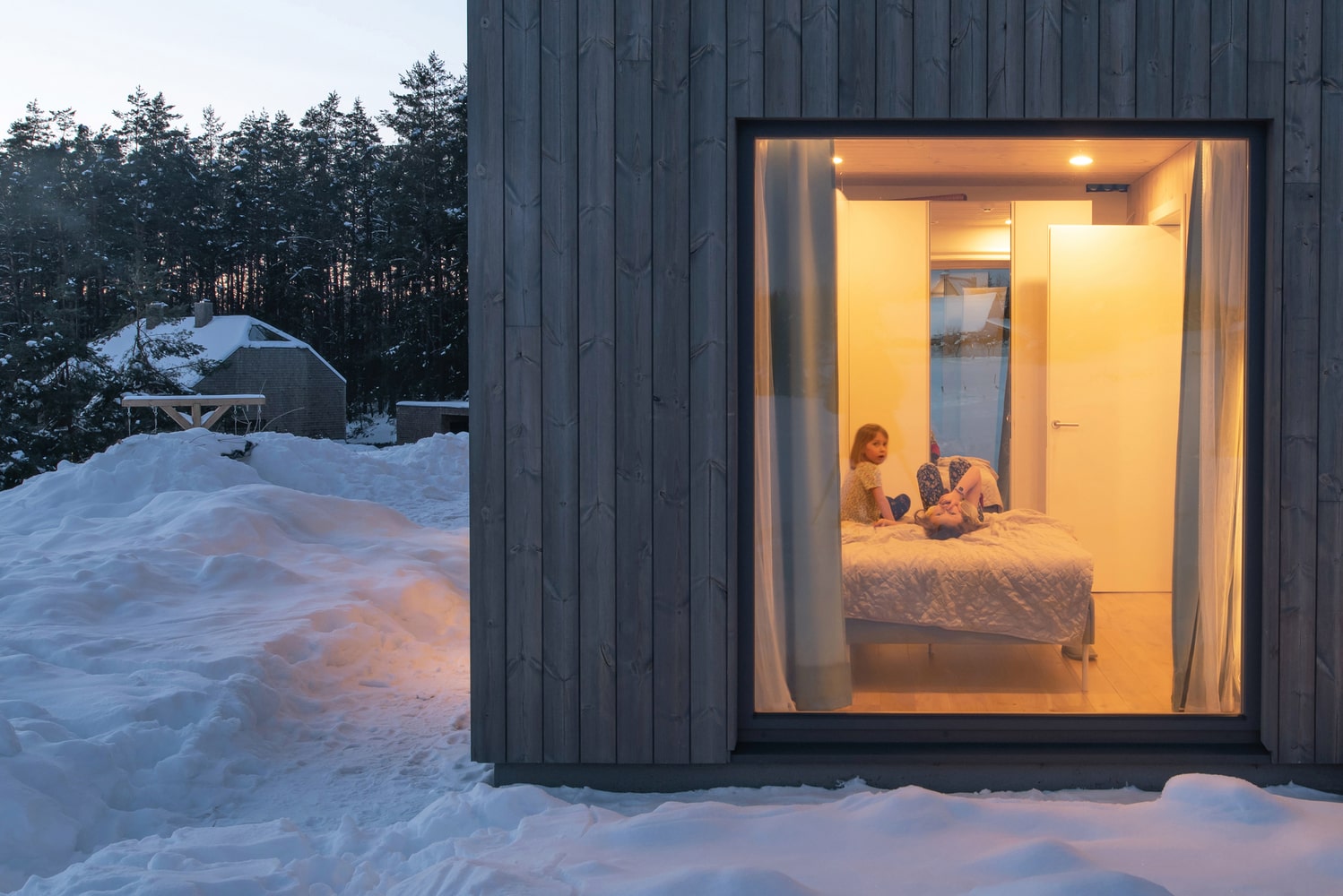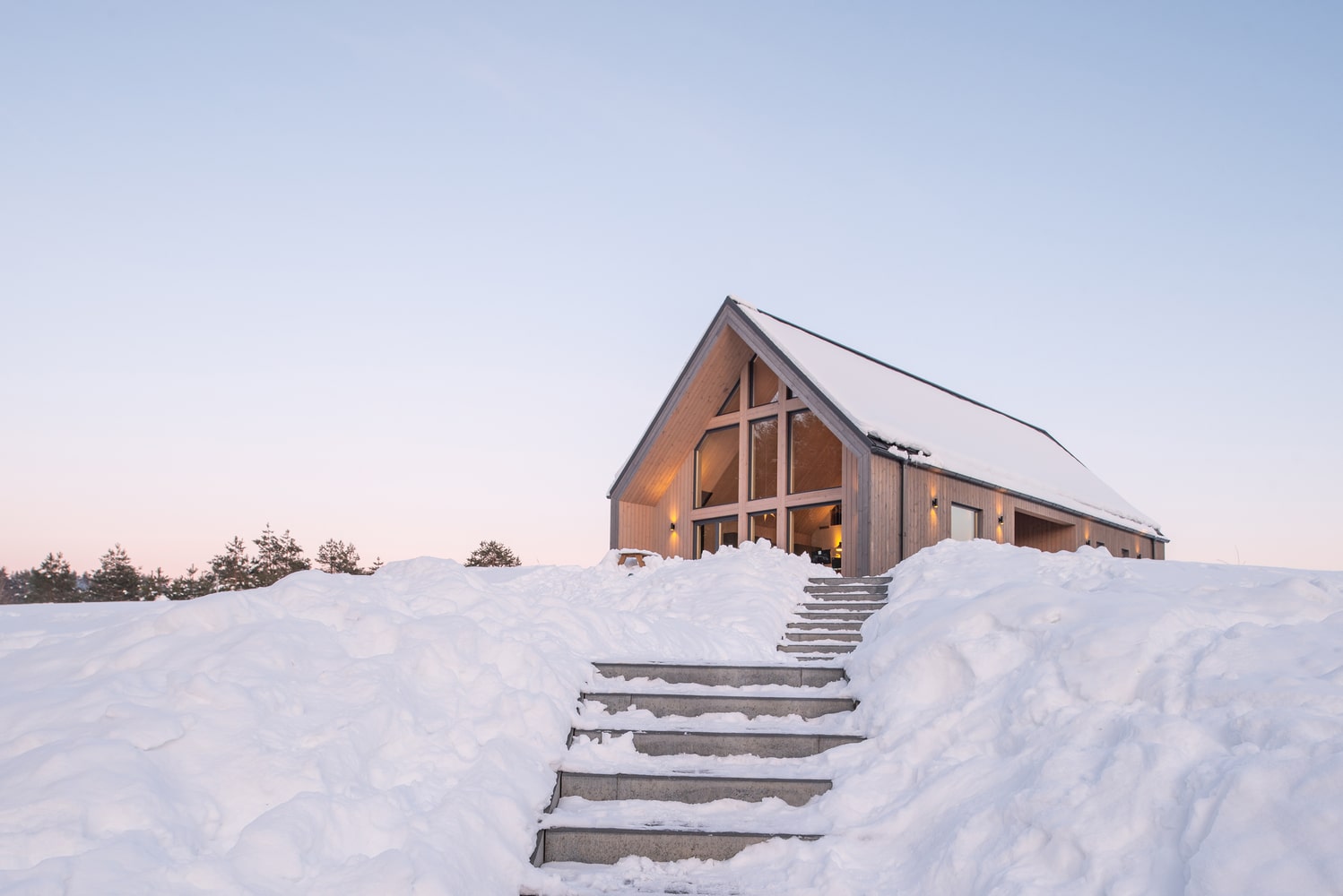 Duże przeszklenia sprawiają, że granica między wnętrzem a otoczeniem niemal zanika. Dom otwiera się na krajobraz poprzez trzy tarasy, które umożliwiają mieszkańcom podążanie za słońcem przez cały dzień. Poranna kawa na wschodnim tarasie, relaks w południowym słońcu i wieczorny odpoczynek na zachodnim tarasie z widokiem na las – to naturalny rytm życia w tym wyjątkowym miejscu. Główny taras od strony zachodniej prowadzi do naturalnego basenu kąpielowego, który dodatkowo podkreśla związek domu z przyrodą.