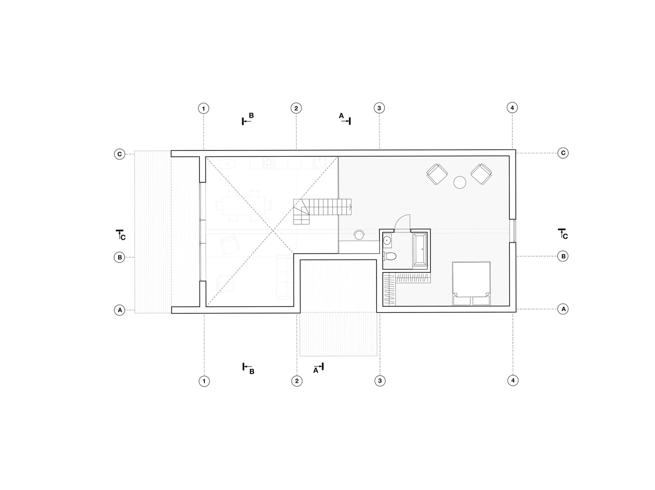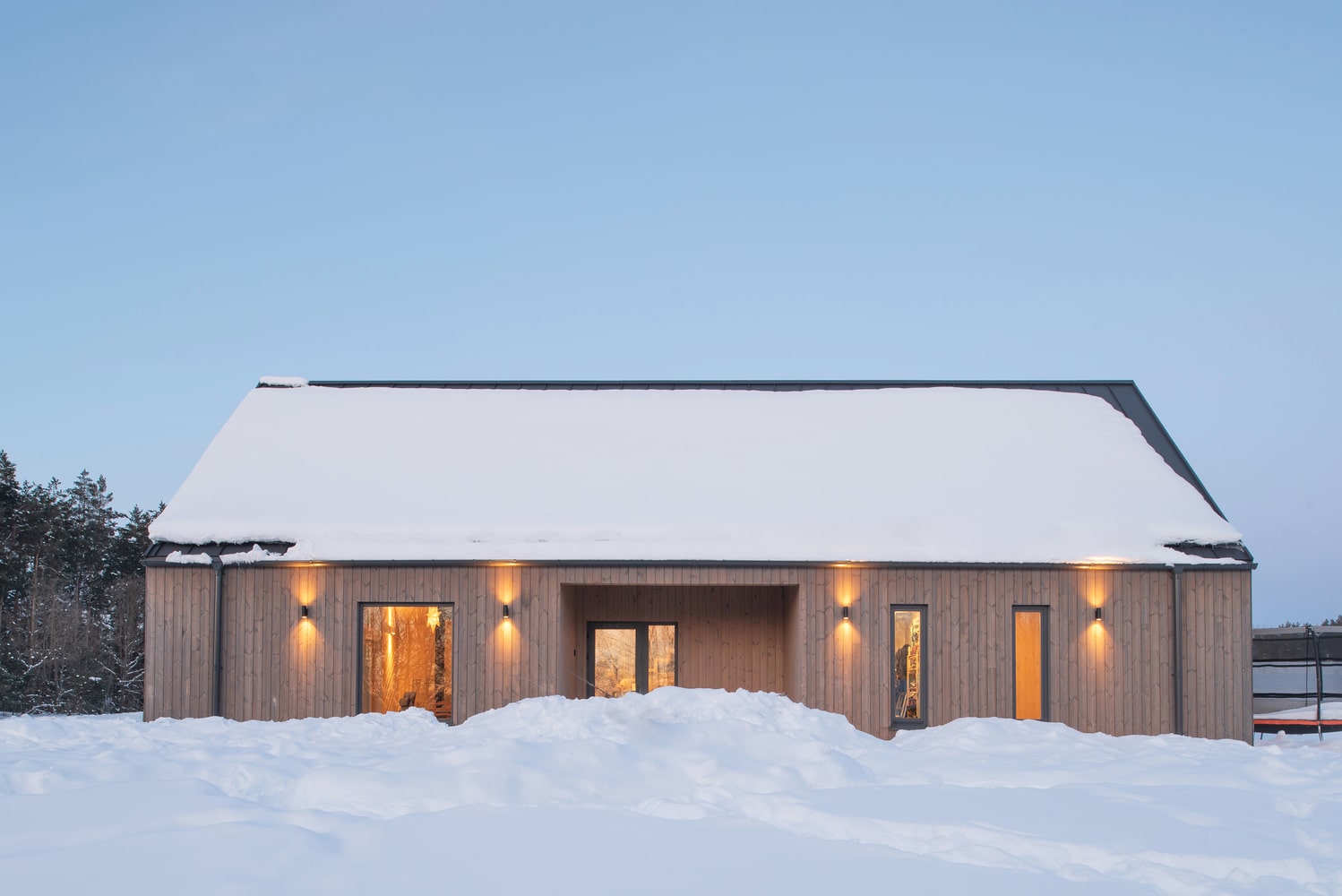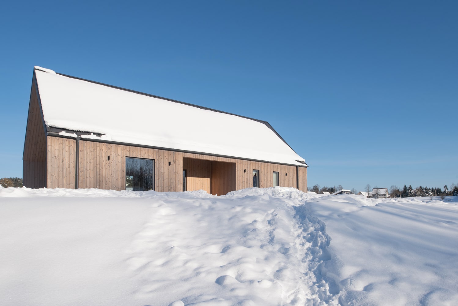 W projekcie nie ma zbędnych elementów – zarówno w architekturze, jak i wyposażeniu. Każdy detal wnętrza podporządkowany jest funkcjonalności i prostocie, co wpisuje się w filozofię nowoczesnej stodoły. Dzięki temu przestrzeń domu harmonijnie współgra z otaczającą go przyrodą, a wnętrze może być wypełnione ciepłem domowego życia i radością dziecięcych zabaw.