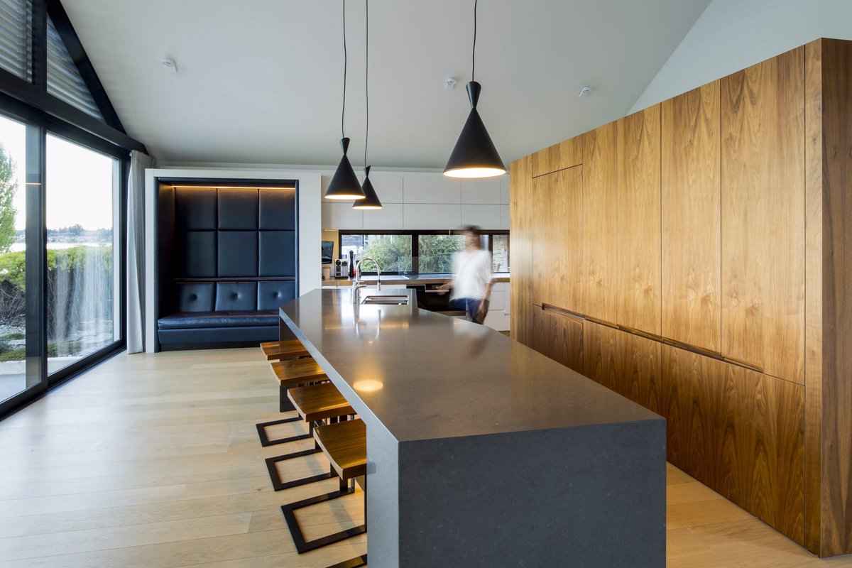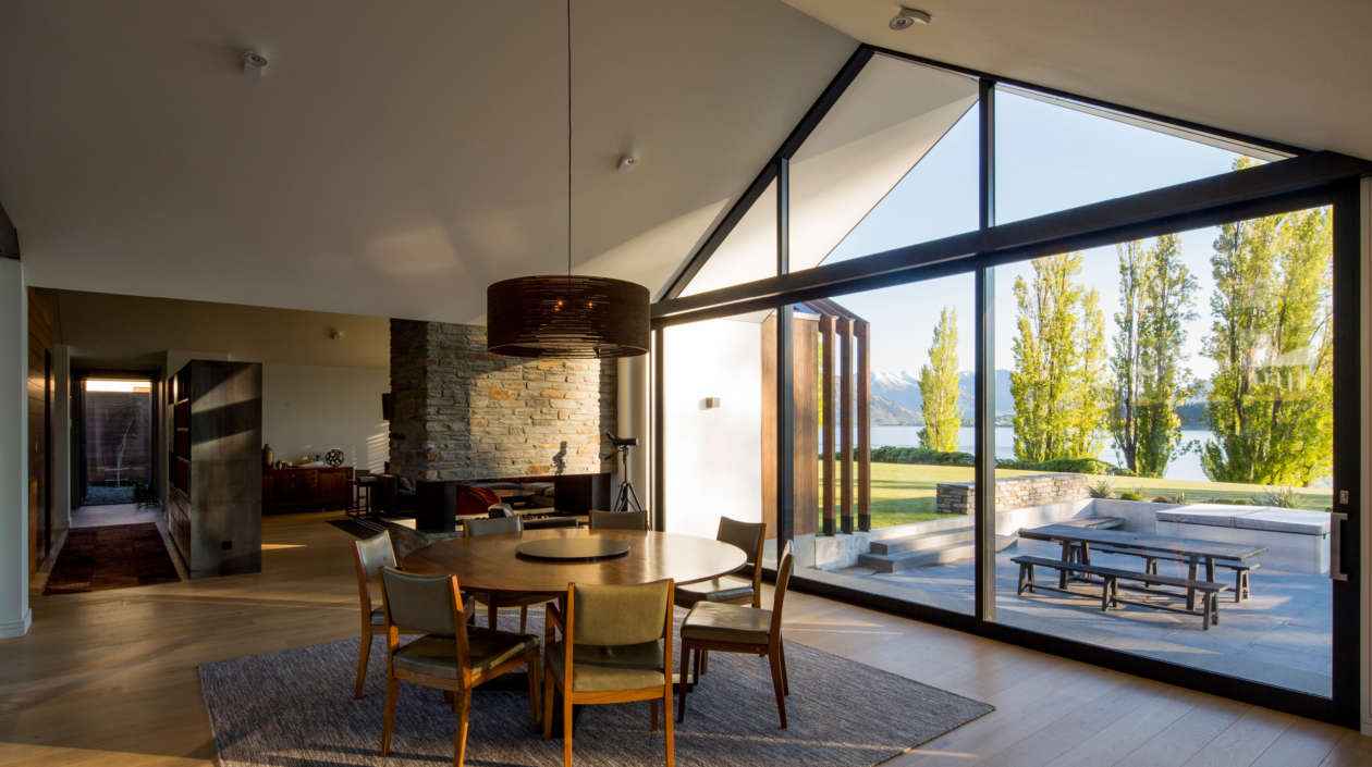 Wnętrze Sunrise Bay House zostało zaprojektowane z myślą o maksymalnym wykorzystaniu światła i widoków. Jasne ściany, białe podbicia dachów i dopracowana stolarka harmonizują z zewnętrzną formą budynku, podkreślając lekkość i spokojny charakter przestrzeni. Otwarty układ funkcjonalny, zastosowanie naturalnych materiałów oraz autorskie meble wzmacniają minimalistyczną, a jednocześnie ciepłą estetykę. Centralny dziedziniec otwiera się na jezioro i góry, tworząc przestrzeń do wypoczynku i spotkań z przyjaciółmi – prywatne sanktuarium pozwalające celebrować piękno krajobrazu Wanaki.