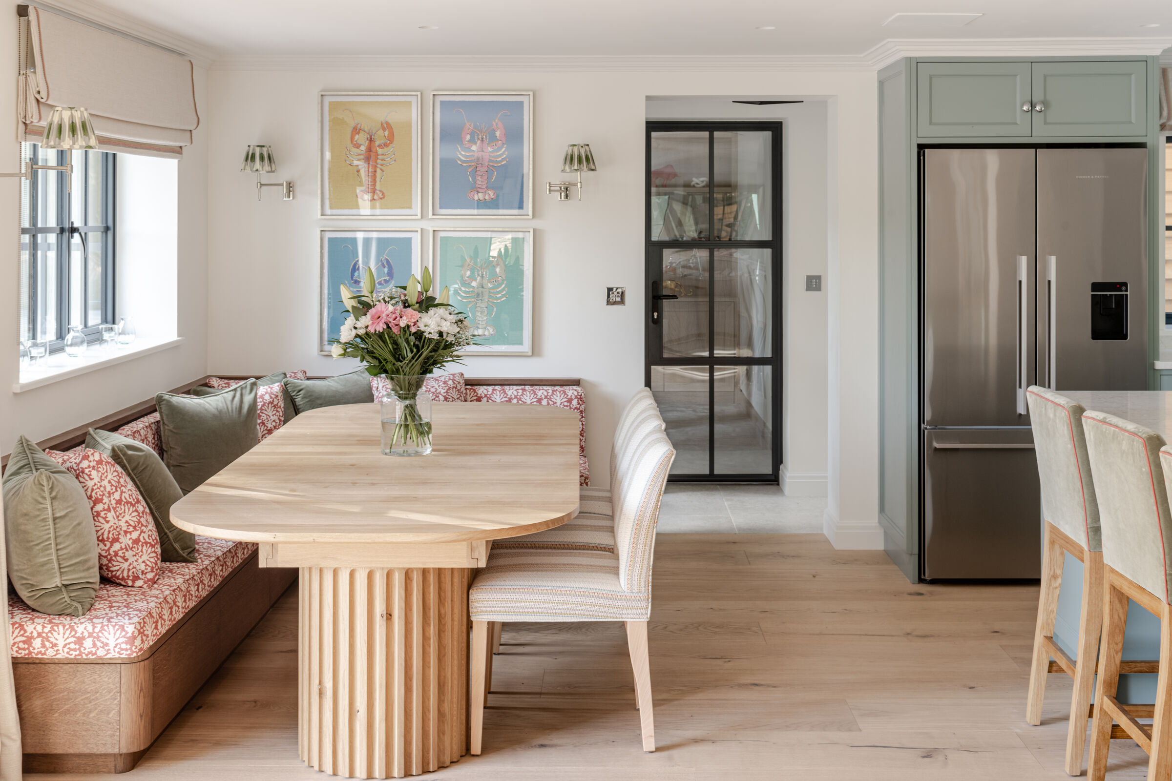 Wnętrze przebudowanego domku emanuje przytulnym ciepłem, zachowując jednocześnie świeży, współczesny klimat. Na parterze projekt kuchni uzupełnia nowoczesną estetykę. Druga strona zawiera stół jadalny i pięknie wykonaną ławę. Główna przestrzeń mieszkalna może pochwalić się dużą, wykonaną na zamówienie sofą w kształcie litery L, ustawioną obok kominka z telewizorem nad nim. Rozległe drzwi tarasowe dopełniają przestrzeń.