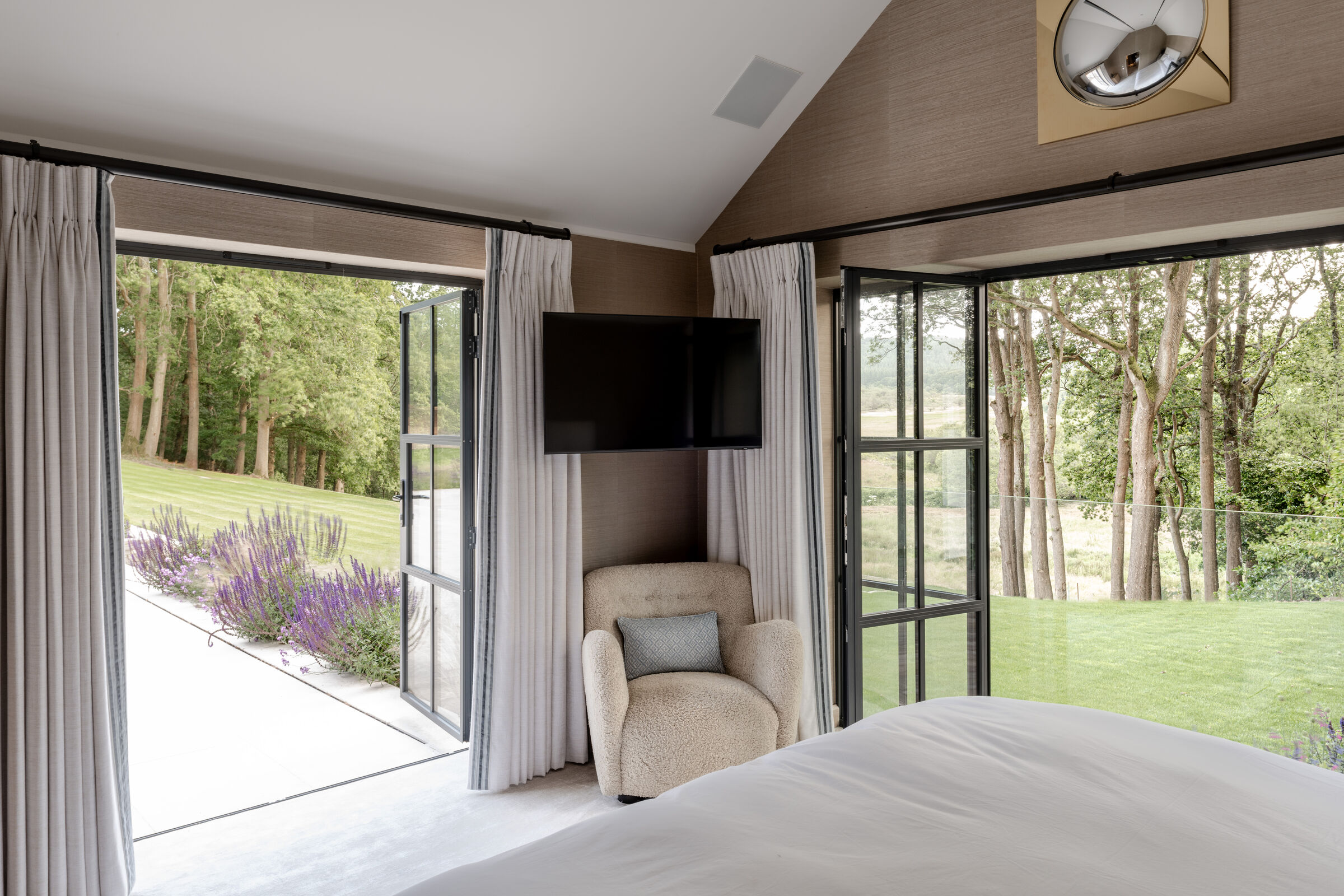 Przybudówka mieści domowe biuro i apartament główny, który klient chciał mieć bardziej współczesny styl niż oryginalny dom. Osiągnięto to dzięki uderzającemu projektowi oświetlenia oraz minimalistycznym stolarkom i panelom ściennym.