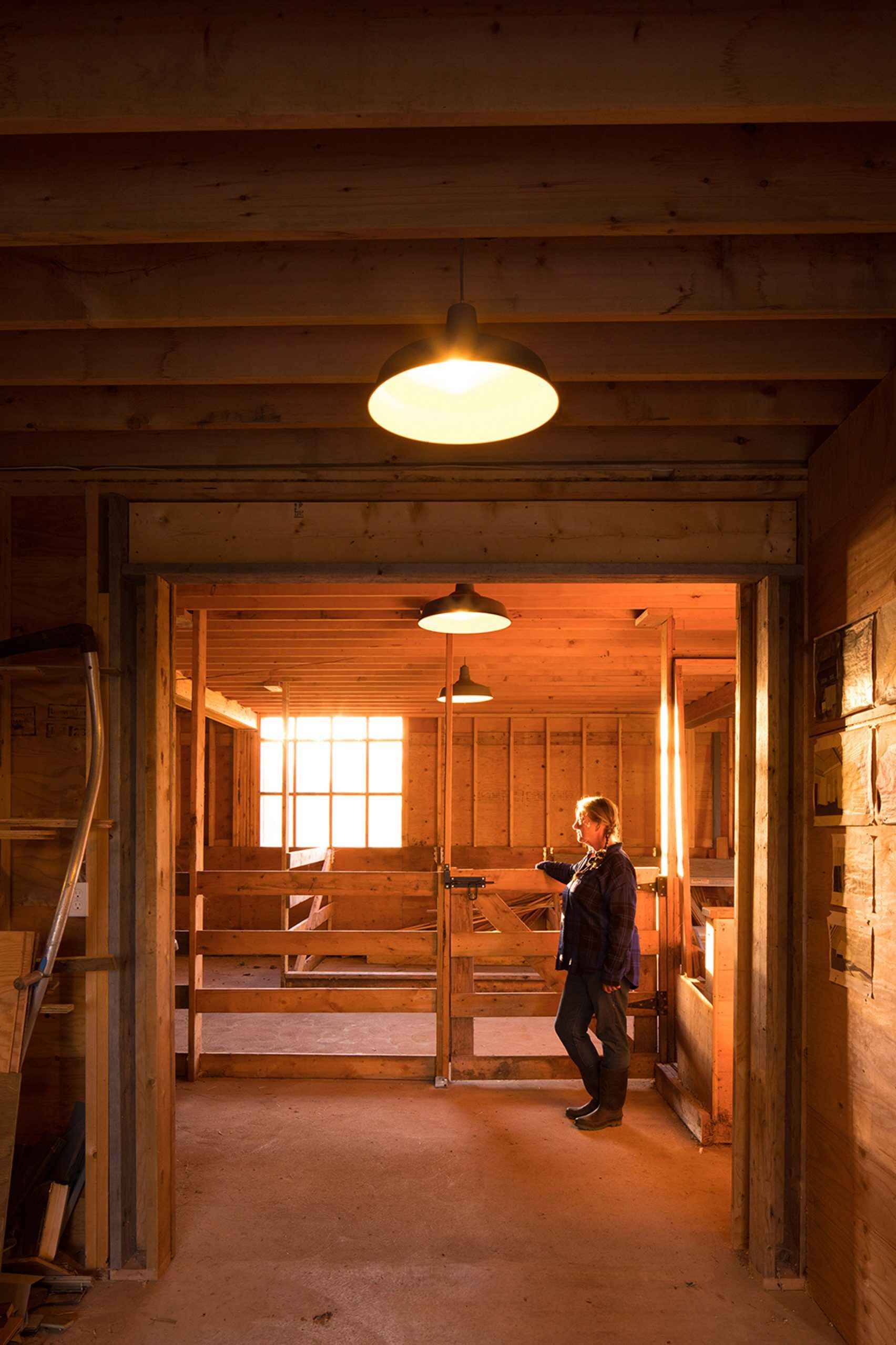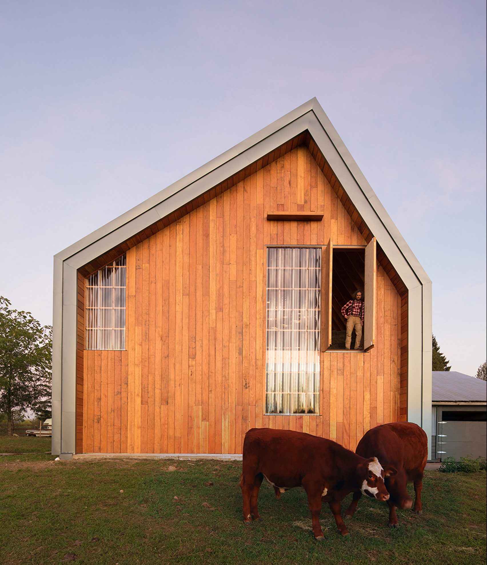 Elewacje frontowe i tylne pokryto pionowo ułożonymi deskami z daglezji zielonej, wcześniej wykorzystanymi jako szalunek betonowy – co stanowi ukłon w stronę recyklingu i praktycznego wykorzystania dostępnych materiałów. Wąskie okna wpuszczają delikatne światło, a przestronny parter z licznymi wejściami i alejkami został zaprojektowany z myślą o swobodnym przemieszczaniu zwierząt i sprzętu rolniczego. Na wyższym poziomie widoczne są odsłonięte, laminowane belki oraz strych na siano, który pełni również funkcję wspólnej przestrzeni dostępnej przez warsztat. Całość tworzy harmonijny przykład współczesnej interpretacji tradycyjnej architektury wiejskiej.