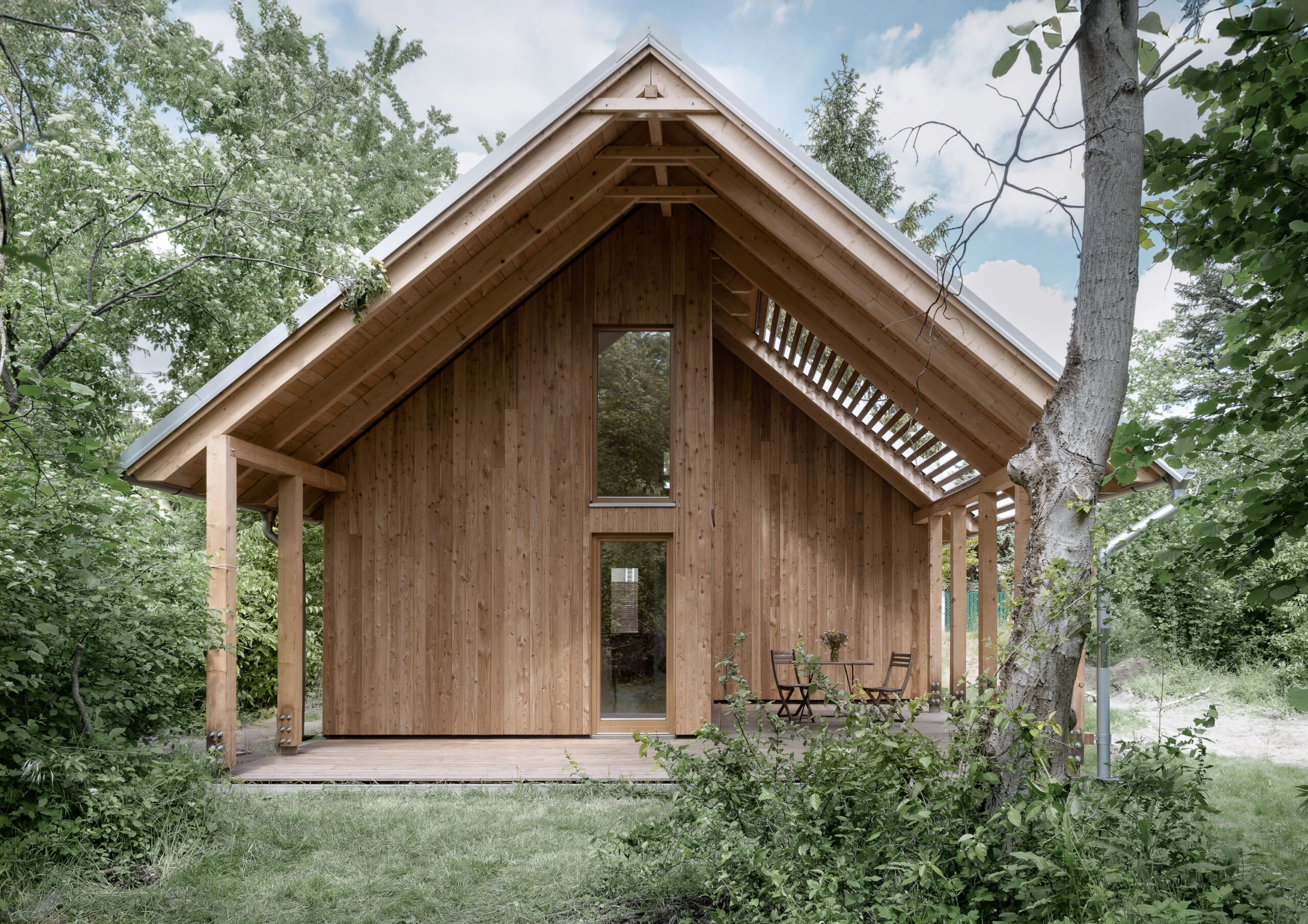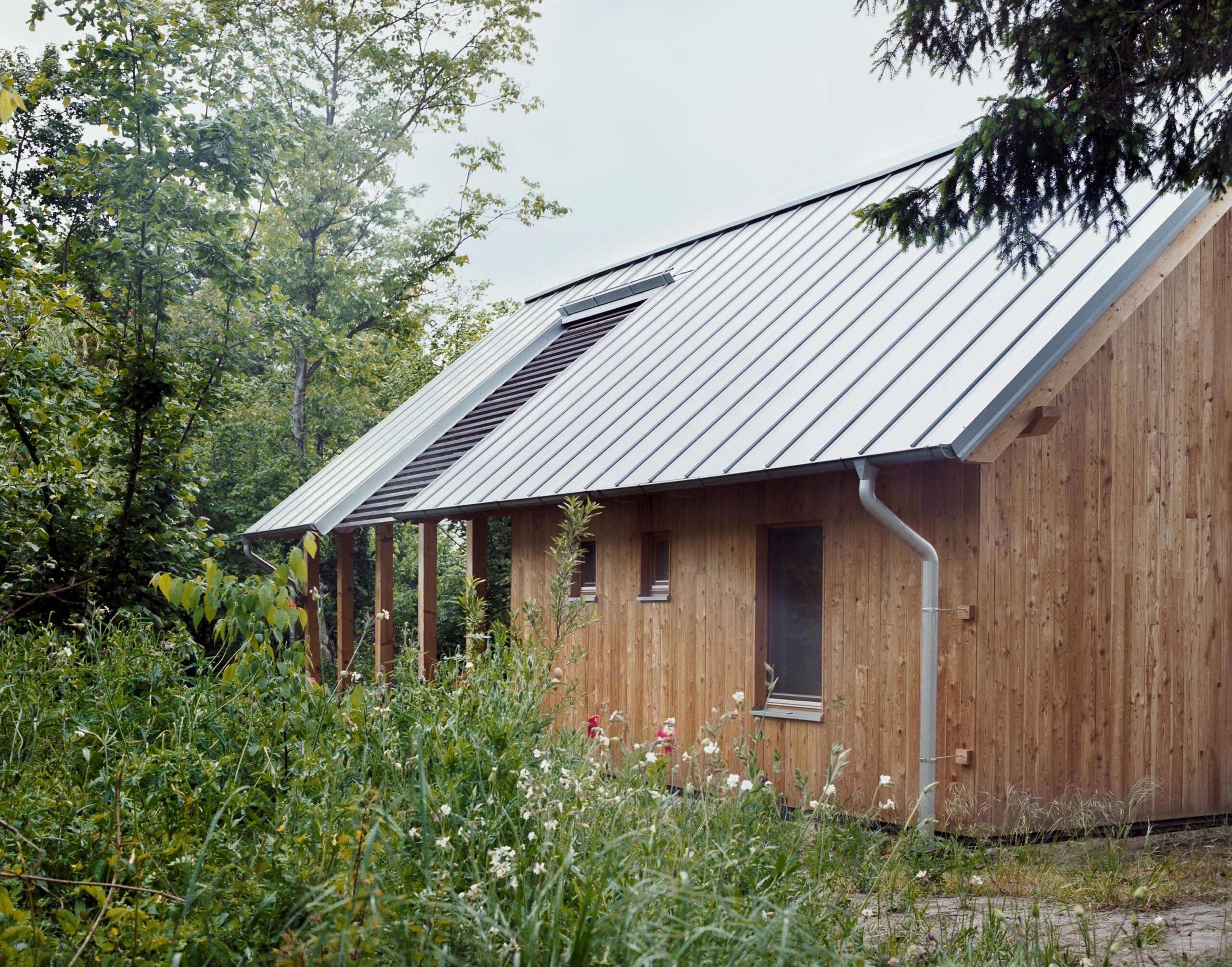 Projekt wyróżnia się także podejściem konstrukcyjnym. Dom powstaje w oparciu o prefabrykowany system Equinox™, który wykorzystuje drewnianą konstrukcję szkieletową przygotowywaną wcześniej przez zespół projektowy. Dach wykonywany jest natomiast tradycyjnymi metodami ciesielskimi, co tworzy ciekawy dialog między nowoczesną technologią a rzemiosłem.