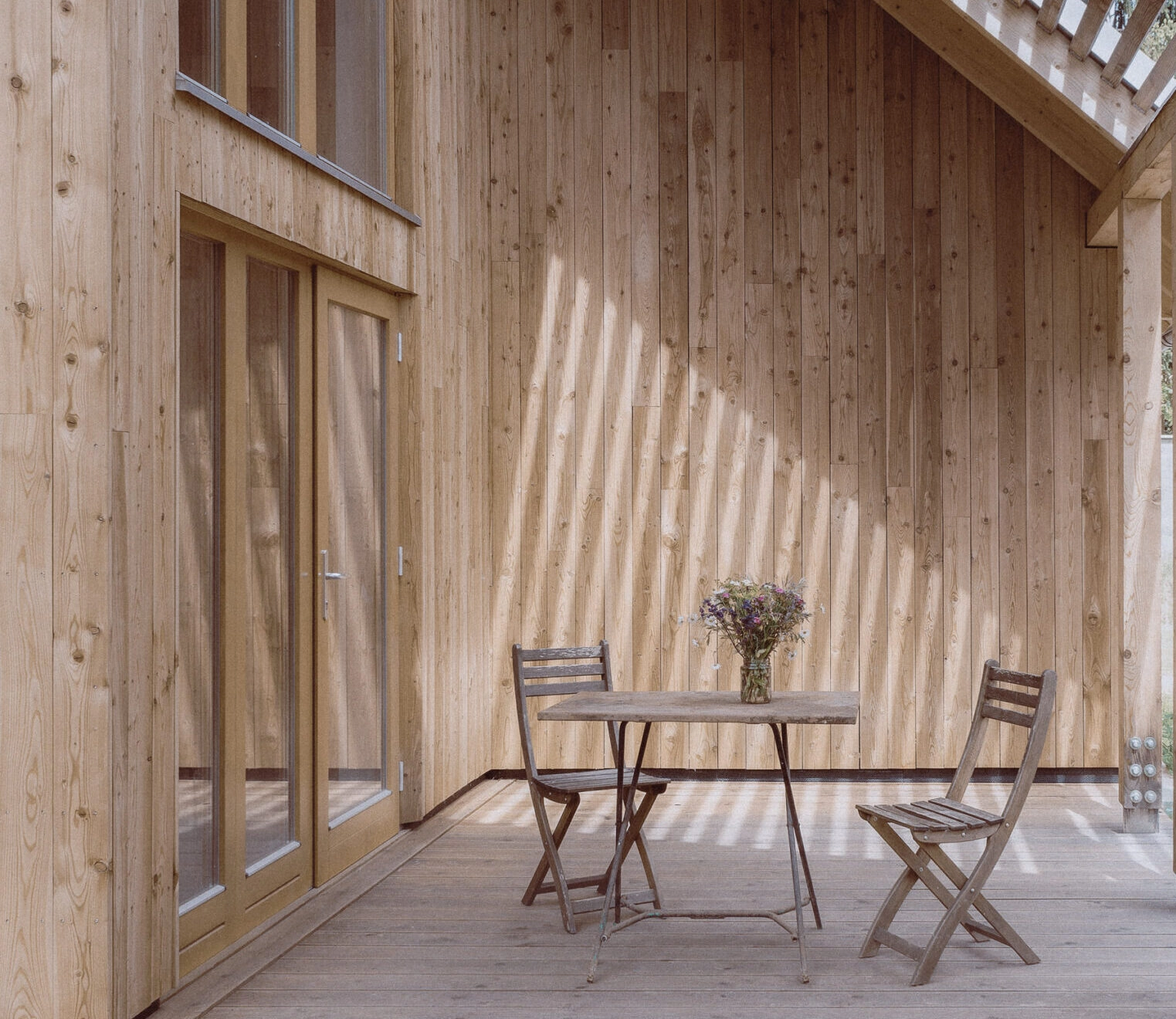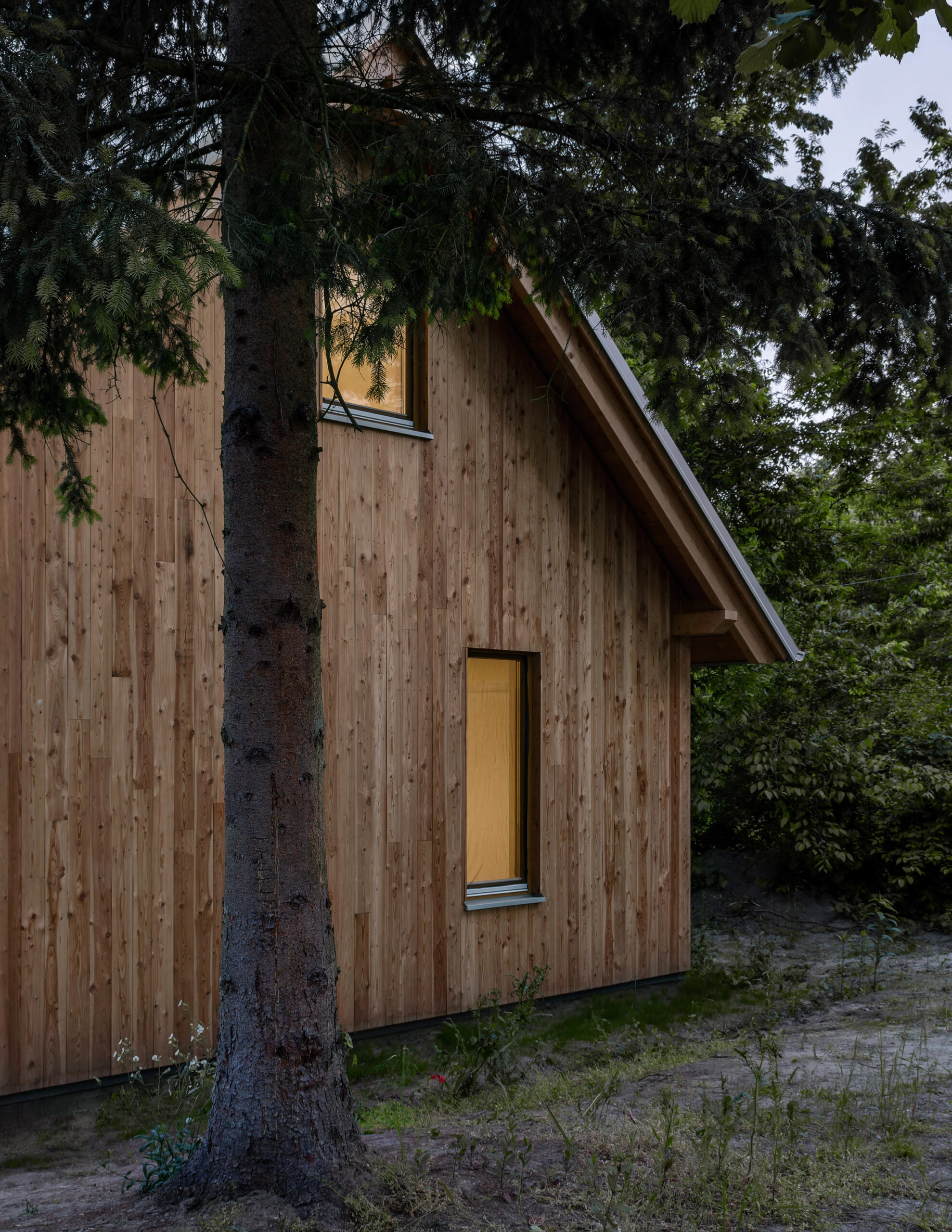 Bryła budynku nawiązuje do archetypu stodoły – jest kompaktowa, funkcjonalna i pozbawiona zbędnych detali. Wrażenie przestronności osiągnięto nie poprzez zwiększanie metrażu, lecz poprzez świadome projektowanie relacji między wnętrzem a zewnętrzem. Duży, L-kształtny taras stanowi naturalne przedłużenie części dziennej, tworząc dodatkową przestrzeń do życia i spotkań.