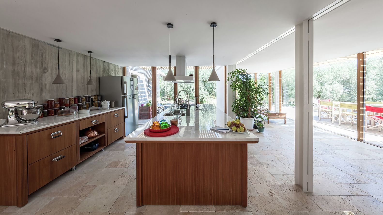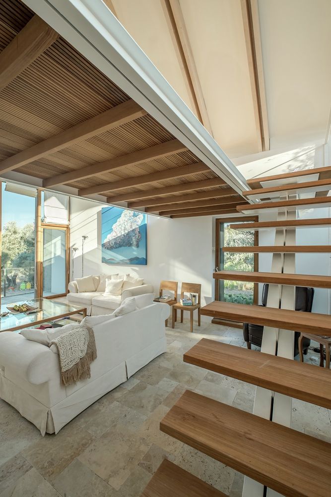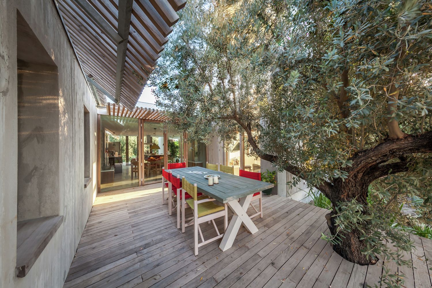 Dom zaprojektowano jako dom rodzinny, który wykorzystywany ma być przez cały rok. Ma przestronną kuchnię i strych, aby było wystarczająco dużo miejsca na rzeczy, które właściciele lubią robić najbardziej. T-House to dom wyraźnie powiązany z przyrodą. Szarość betonowych powierzchni i ciepłe odcienie drewna współgrają ze śródziemnomorską roślinnością i ukształtowaniem terenu. Cały budynek rozbito na kilka części, aby nie tworzyć dominującej w okolicy „masy”. Duże przeszklenia powiększają przestrzeń wewnętrzną i są delikatnie „owinięte” tarasami, które służą jako pokoje zewnętrzne ograniczone drzewami oliwnymi, zamiast ścianami.