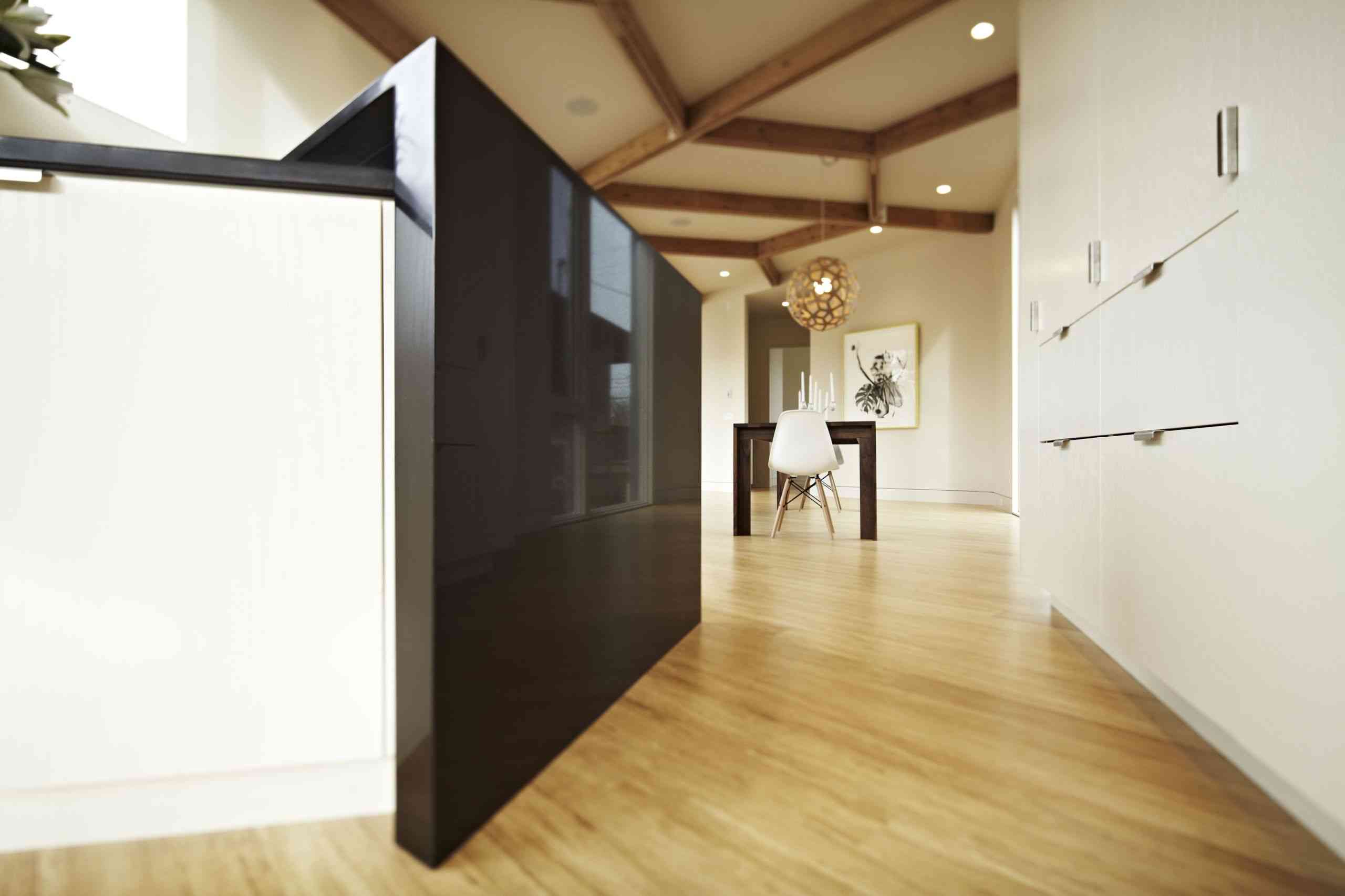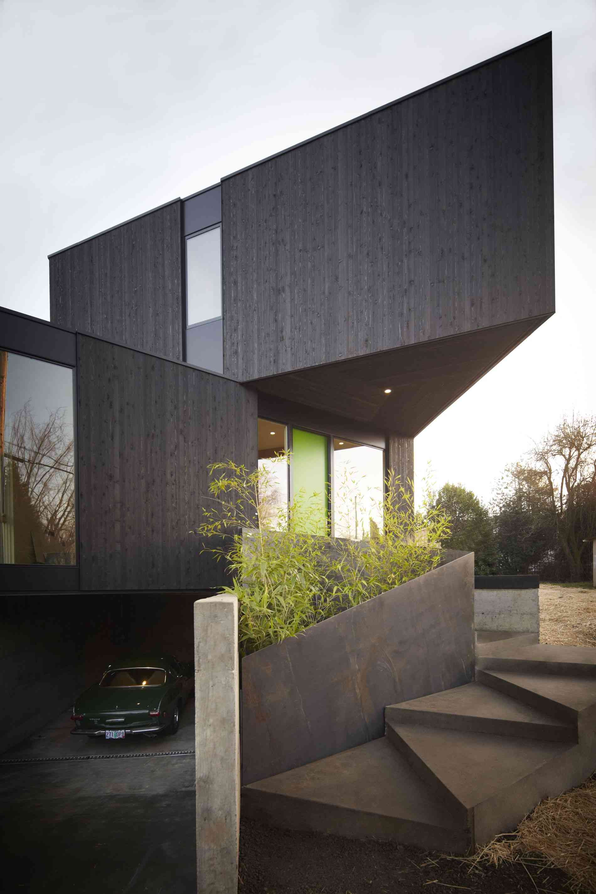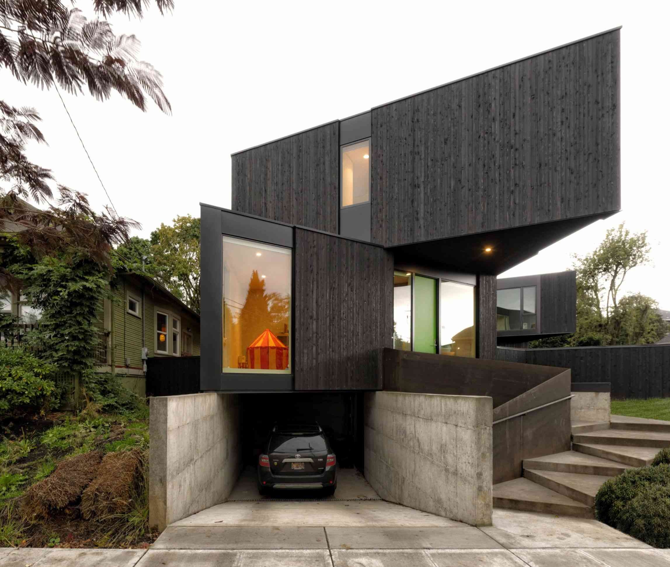 Transport i montaż domu przebiegły w niezwykle wydajny sposób – wszystkie elementy podzielono na sześć ciężarówek, które w jednym konwoju dostarczyły komponenty na wąską, miejską działkę o szerokości zaledwie 6 m. Dzięki przygotowanemu wcześniej fundamentowi instalacja konstrukcji zajęła tylko jeden dzień roboczy. Elewację wykończono czarnym cedrowym „ekranem” z dodatkową warstwą izolacji, a same moduły również zawierają izolację jako integralną część ścian. Wnętrze oparto na otwartym planie obejmującym salon, kuchnię i jadalnię, z dodatkowymi czterema sypialniami, trzema łazienkami i toaletą. Jasne wnętrza akcentują odsłonięte elementy konstrukcyjne oraz podłogi z twardego drewna.