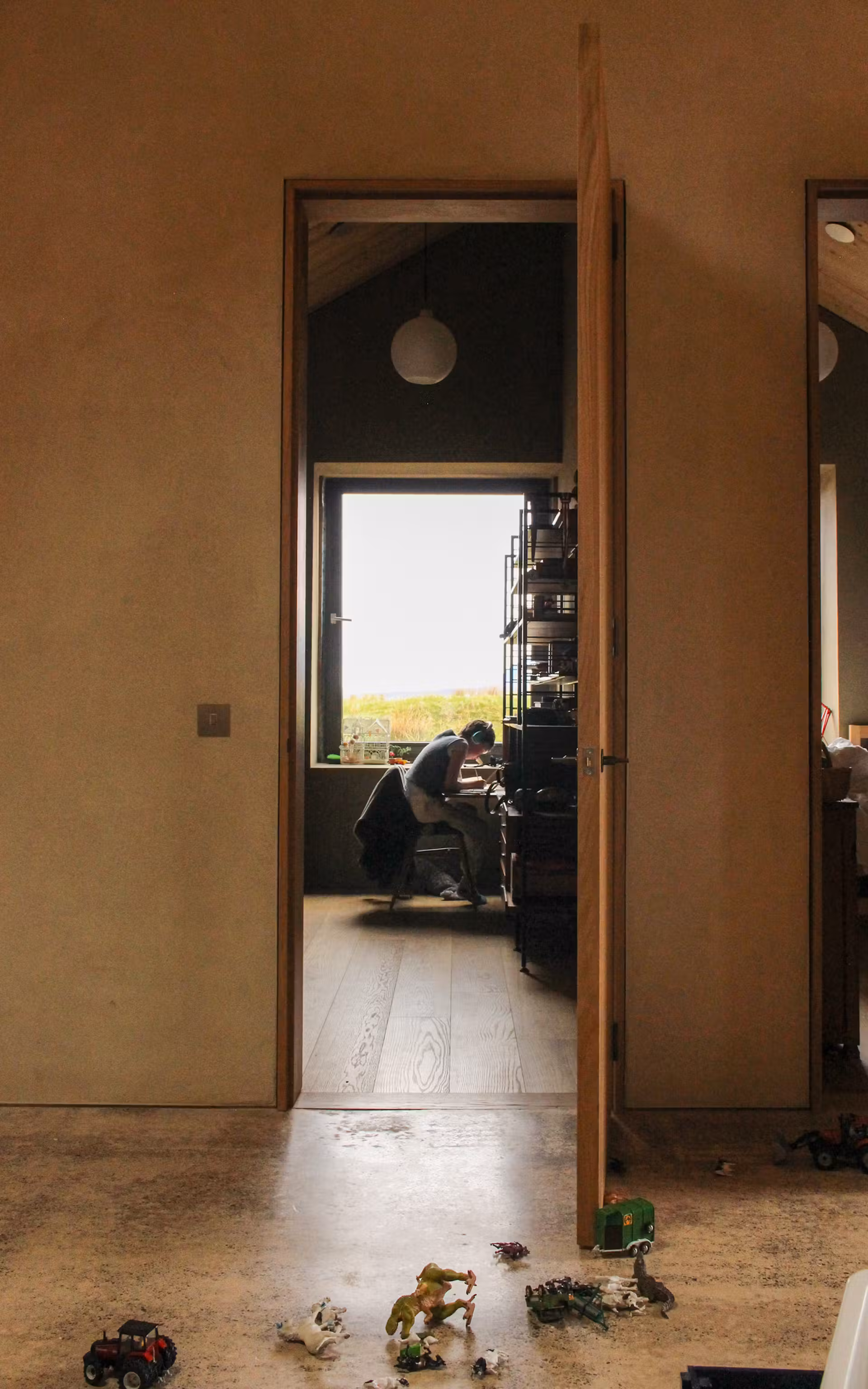 Wnętrza pozbawione są farby i stalowych elementów konstrukcyjnych. Ściany z bloków glinianych zostały otynkowane i pozostawione w naturalnym wykończeniu, a posadzki wykonano z lastryko z lokalnego żwiru. Taki wybór wynika nie tylko z estetyki, ale też z troski o zdrowie – gospodarze chcieli uniknąć emisji chemikaliów, co sprzyja zarówno dzieciom, jak i domowym zwierzętom. Minimalistyczna paleta materiałów z czasem nabiera patyny i tworzy wnętrza o ciepłym, przyjaznym charakterze.