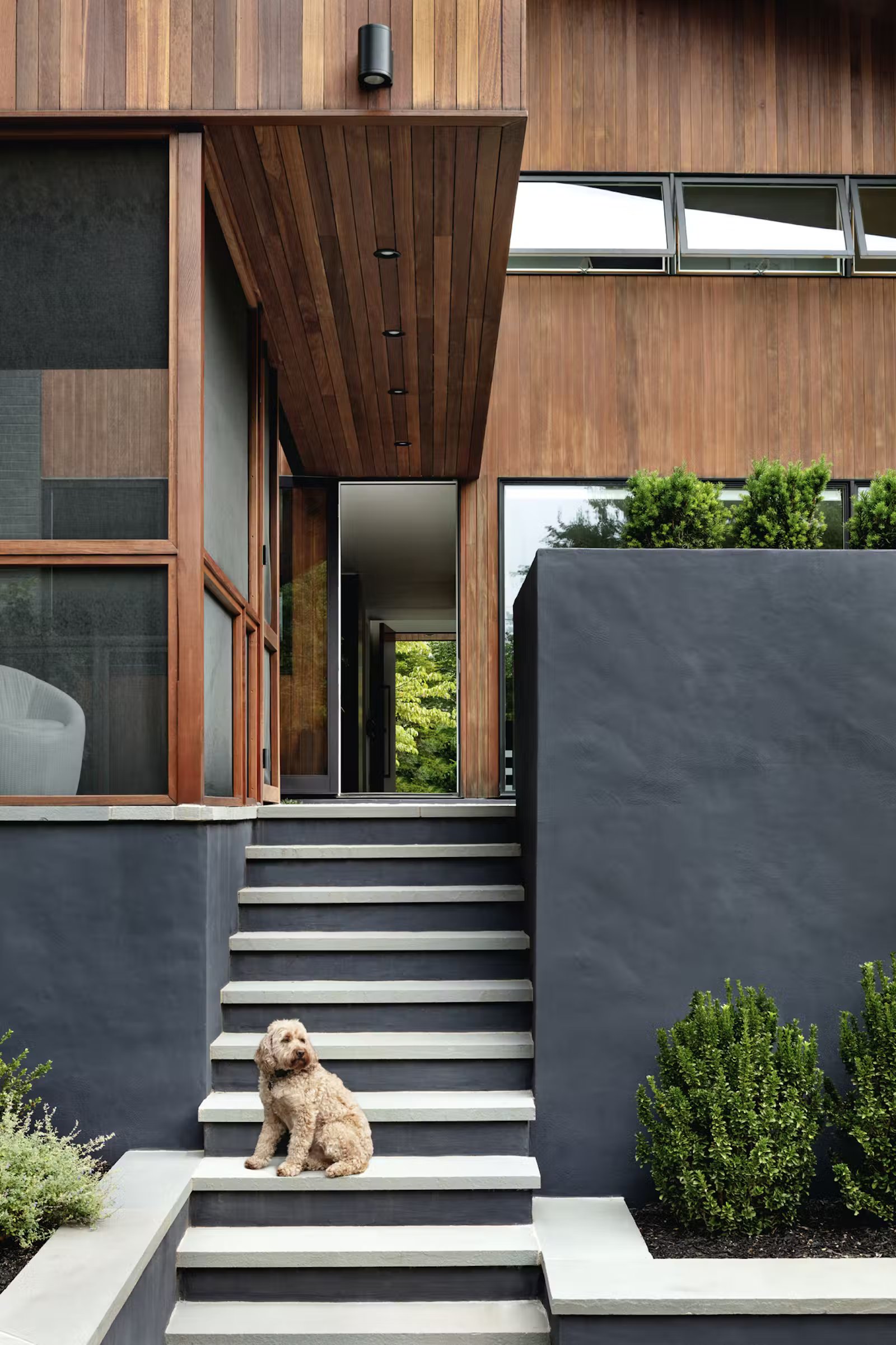 Po zakupie posiadłości w 2015 roku, para skontaktowała się z Davidem Thompsonem z kalifornijskiej pracowni Assemblege+, prosząc o pomoc w przeprojektowaniu budynku. Ich wizją było połączenie stylu kalifornijskiej nowoczesności z koncepcją domu otwartego na ogród. Kluczowym elementem projektu miała być centralna klatka schodowa, która wprowadzałaby naturalne światło do wnętrz i stanowiła funkcjonalne oraz estetyczne serce budynku.
