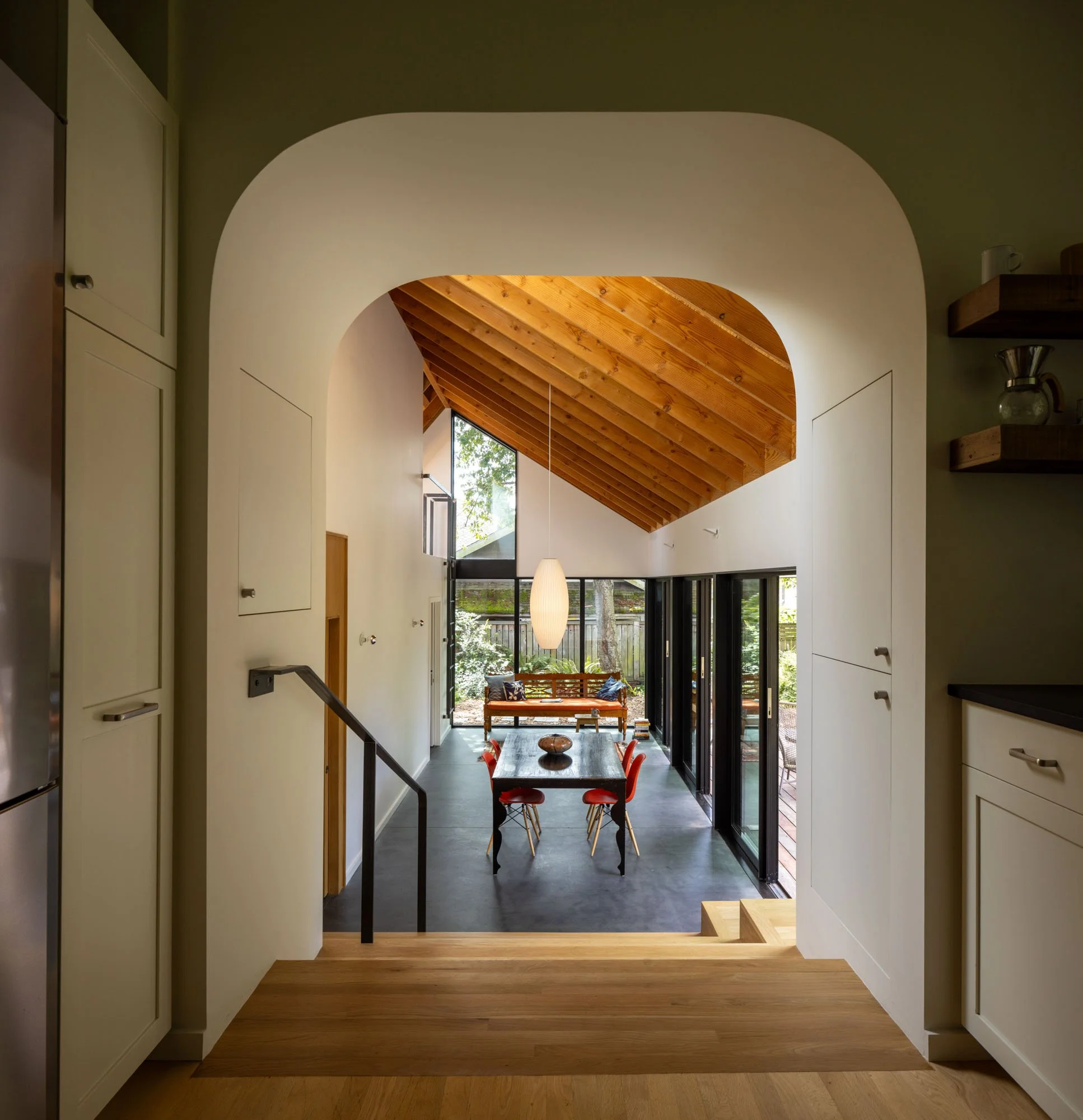 Do nowej części domu prowadzi łukowe przejście, które łączy istniejącą strefę dzienną z dodatkowym salonem. Kilka stopni prowadzi w dół, otwierając przestrzeń na nowy zadaszony taras i ogród. Tym samym codzienne życie mieszkańców zyskało płynne przejście między wnętrzem a naturą.