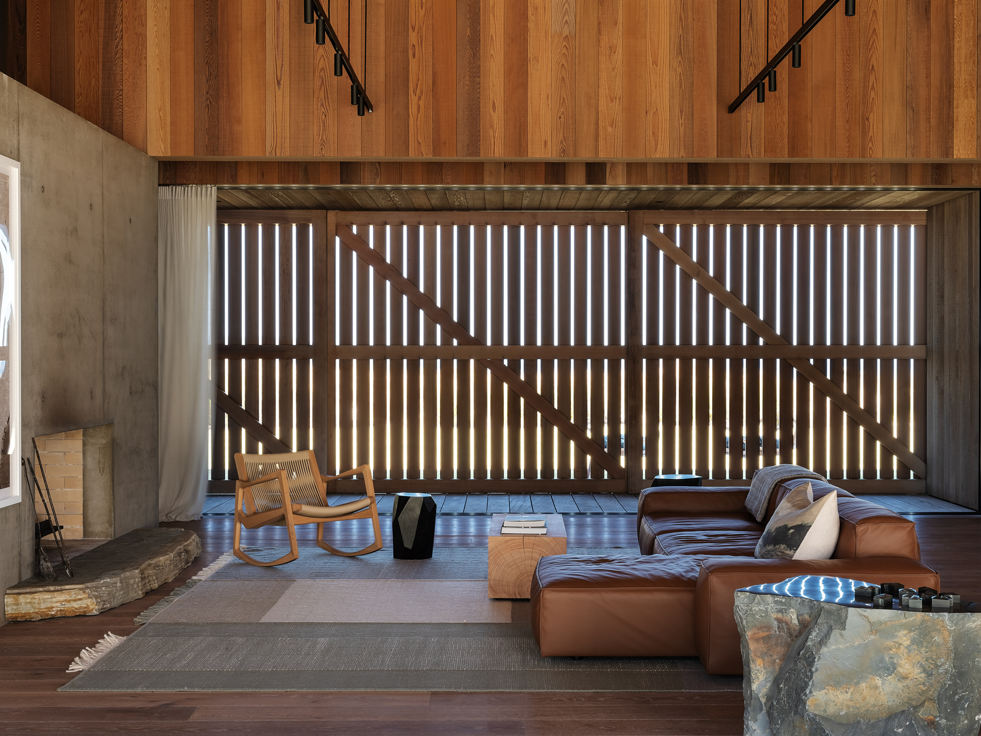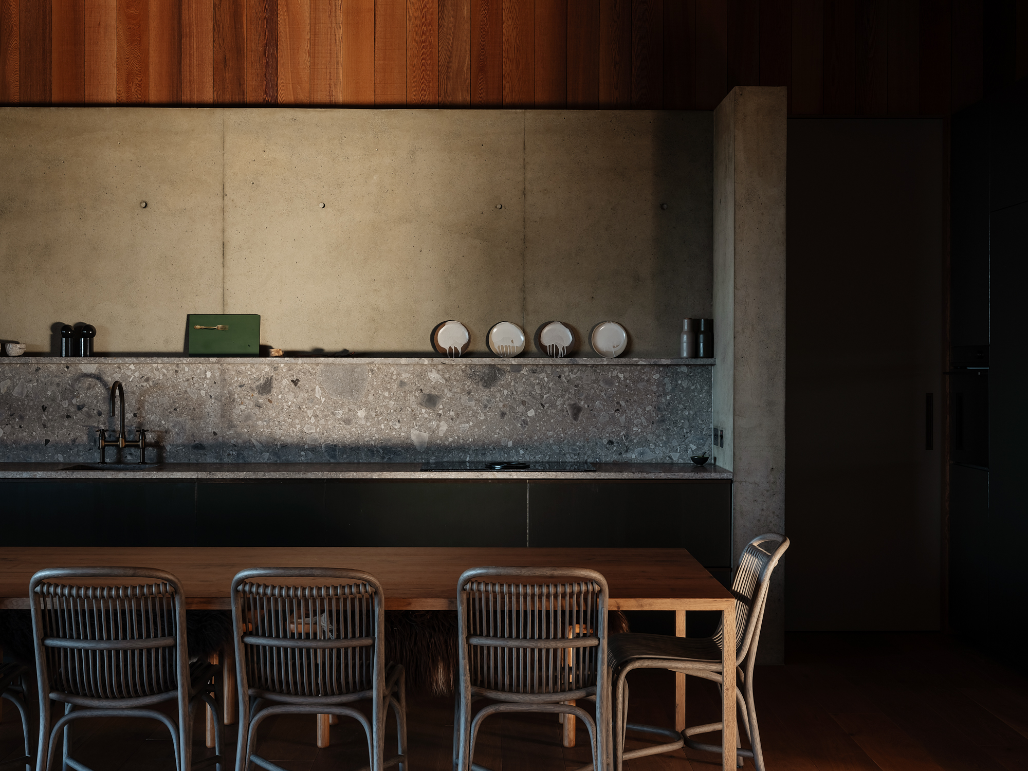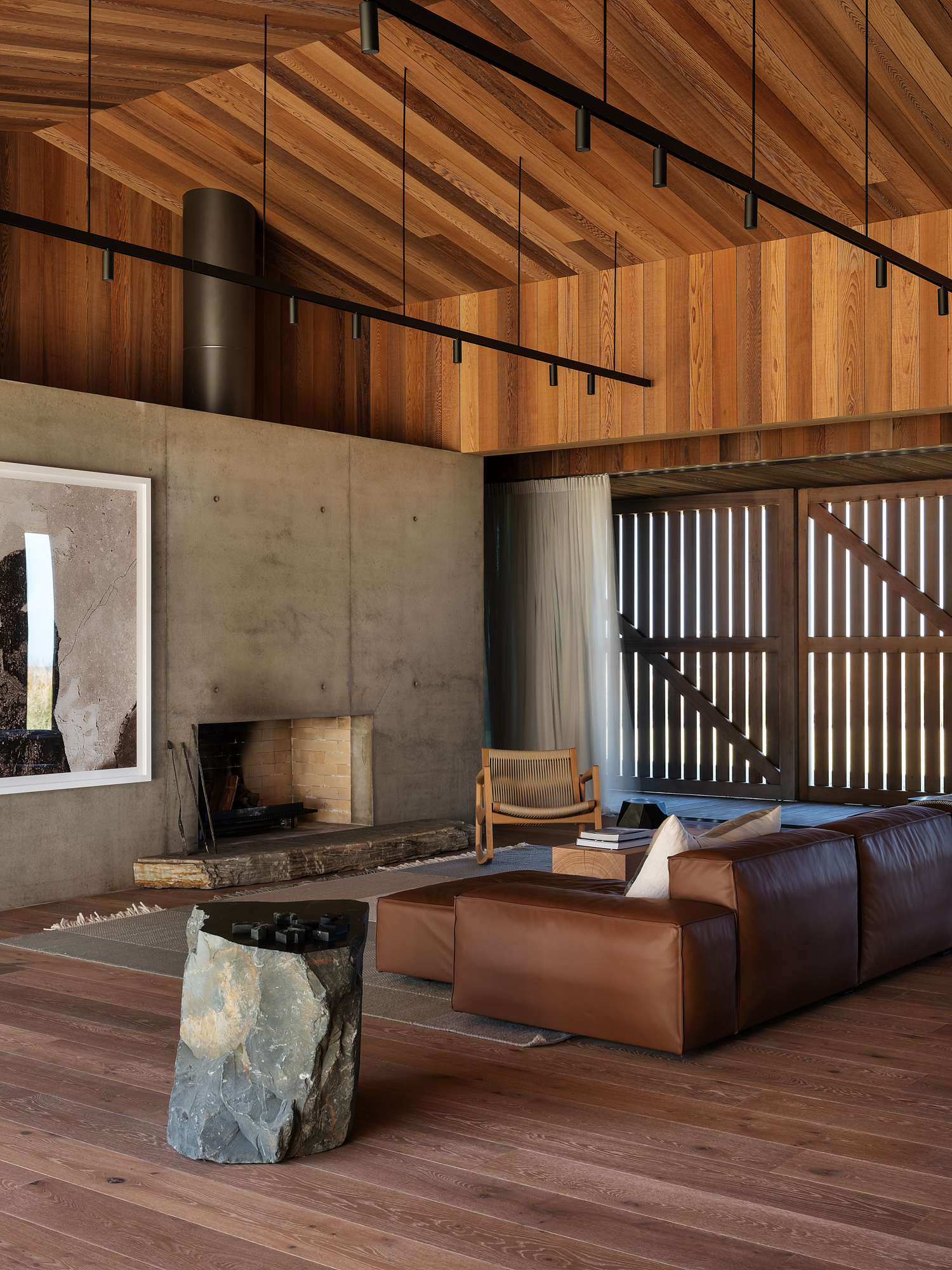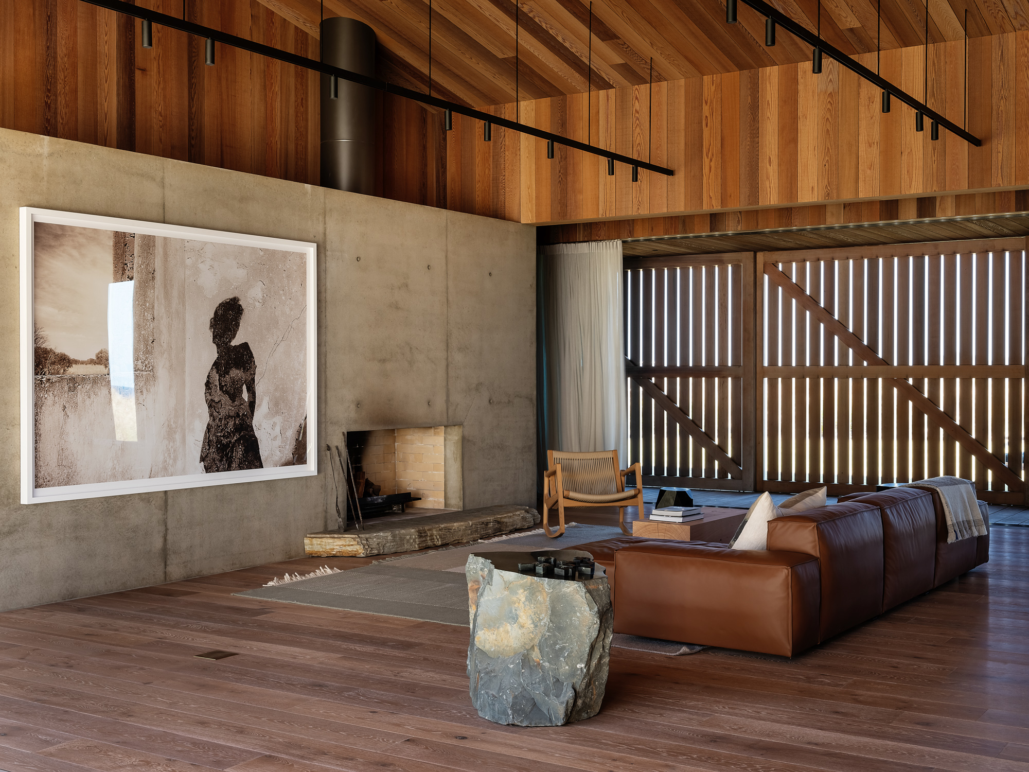 Aranżacją wnętrz zajęła się Sonja Hawkins, która dążyła do zachowania równowagi między prostotą architektury a przytulnością. Zastosowano naturalne materiały – len, kamień, skórę, drewno i wełnę – które budują organiczny klimat domu. Wyjątkowym akcentem jest autorska tapeta artystki Lisy Reihany, wprowadzająca subtelny wymiar artystyczny. Wnętrza łączą skalę odpowiednią do przyjmowania większych grup z intymnymi zakątkami, które sprzyjają wyciszeniu.