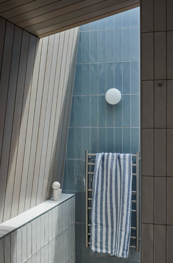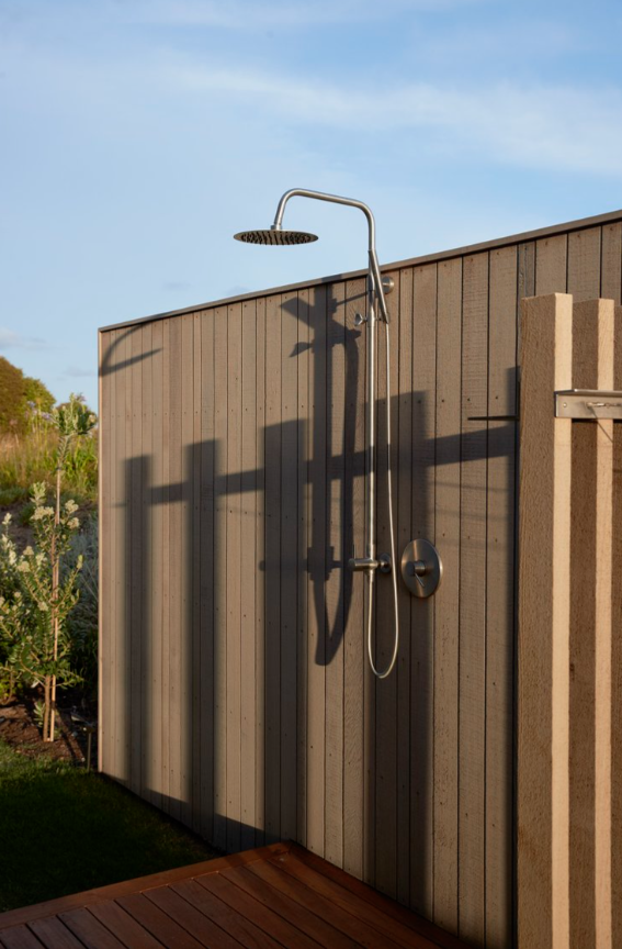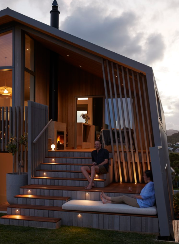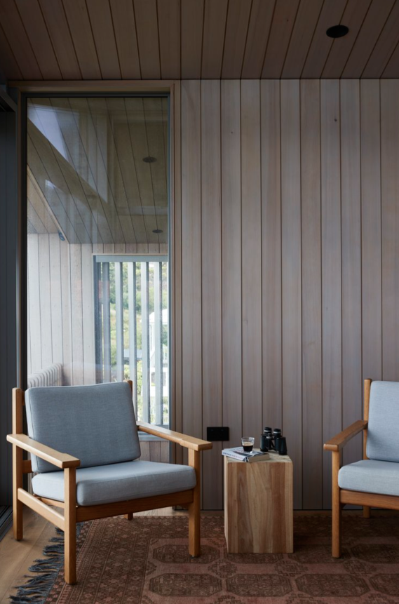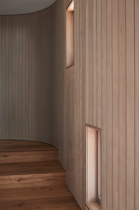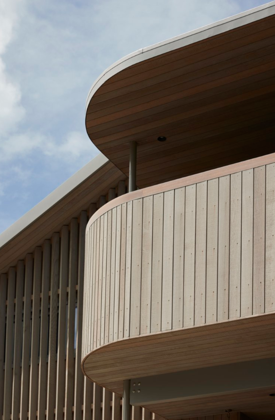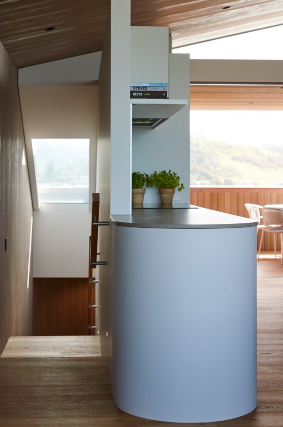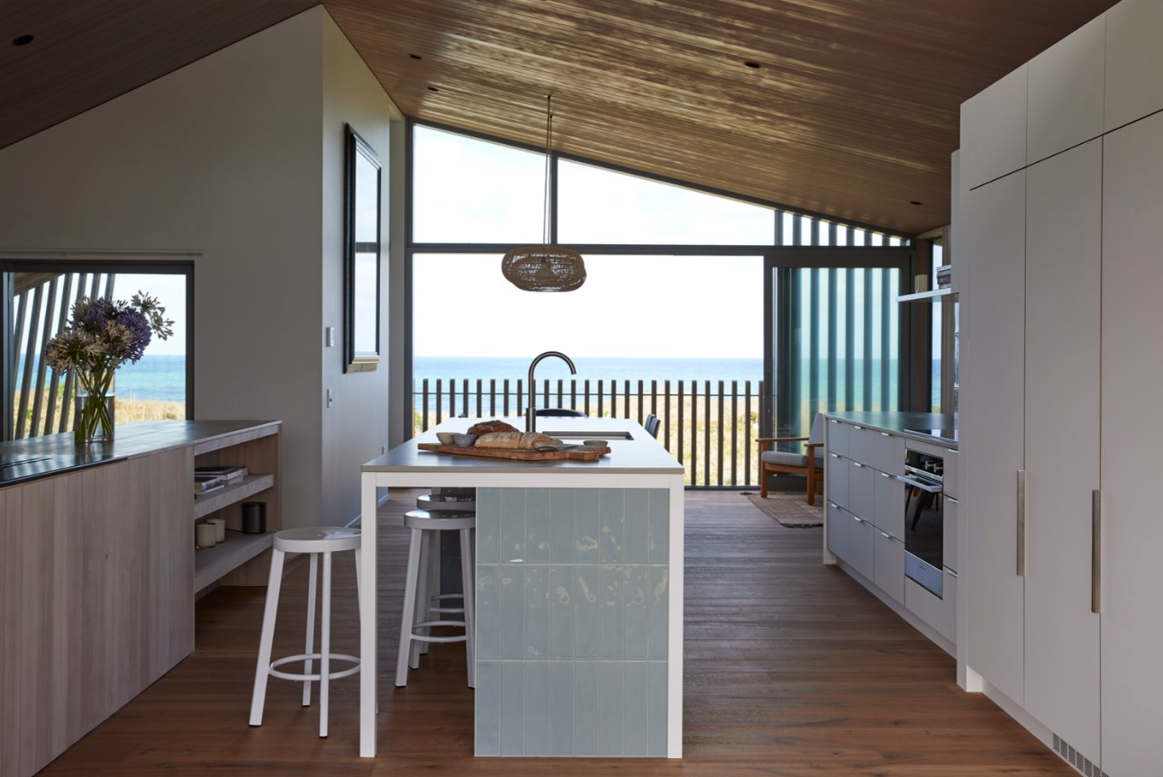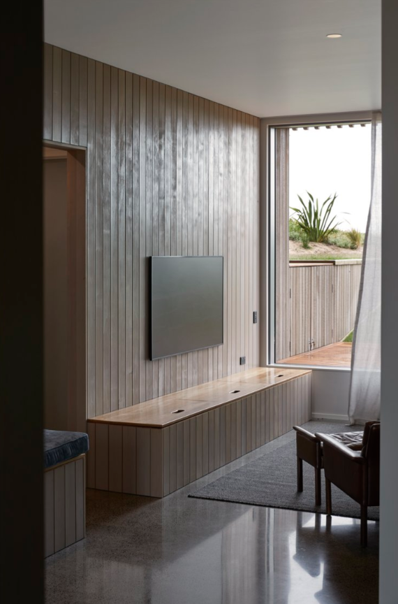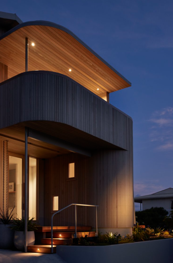 Elewację domu wykonano z aluminiowej blachy falistej i okładzin z zachodniego czerwonego cedru, co podkreśla naturalny, surowy styl i odporność na warunki atmosferyczne. Wnętrze zdominowane jest przez drewno cykuty zachodniej, które wnosi ciepło i harmonię. Całość utrzymana jest w plażowej estetyce z nutą nowoczesności.