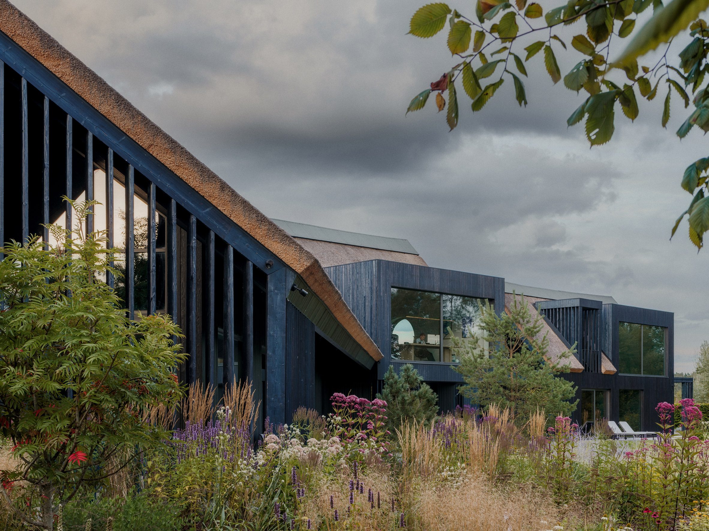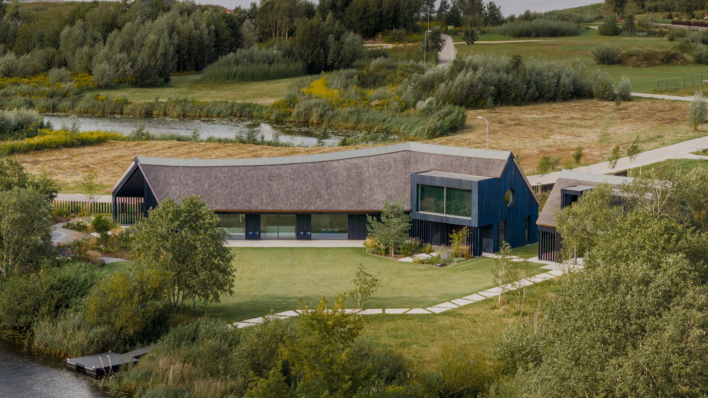 Bryła budynku jest prosta i wydłużona, nawiązująca do archetypu stodoły. Całość przykryta została grubą warstwą strzechy, która płynnie przechodzi z dachu na elewacje, tworząc jednolitą, organiczną formę. Ten zabieg sprawia, że budynek wydaje się niemal wyrastać z otaczającego krajobrazu i stapia się z nim wizualnie. Jednocześnie wykorzystanie tradycyjnego materiału podkreśla związek projektu z lokalną kulturą budowlaną.