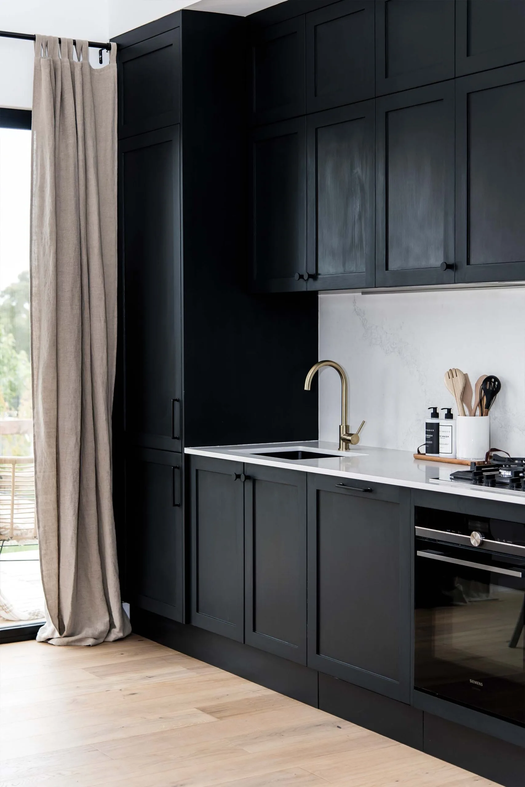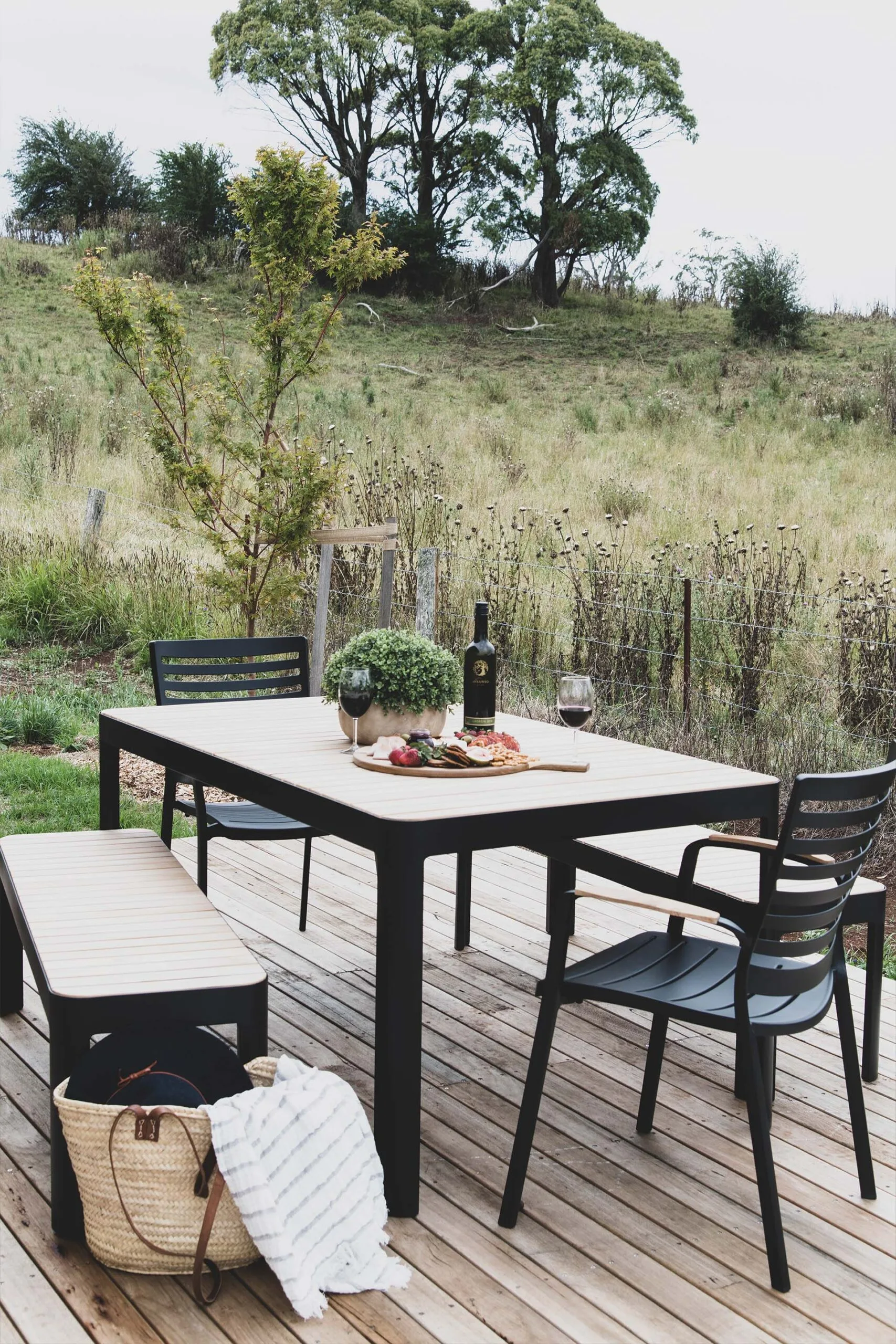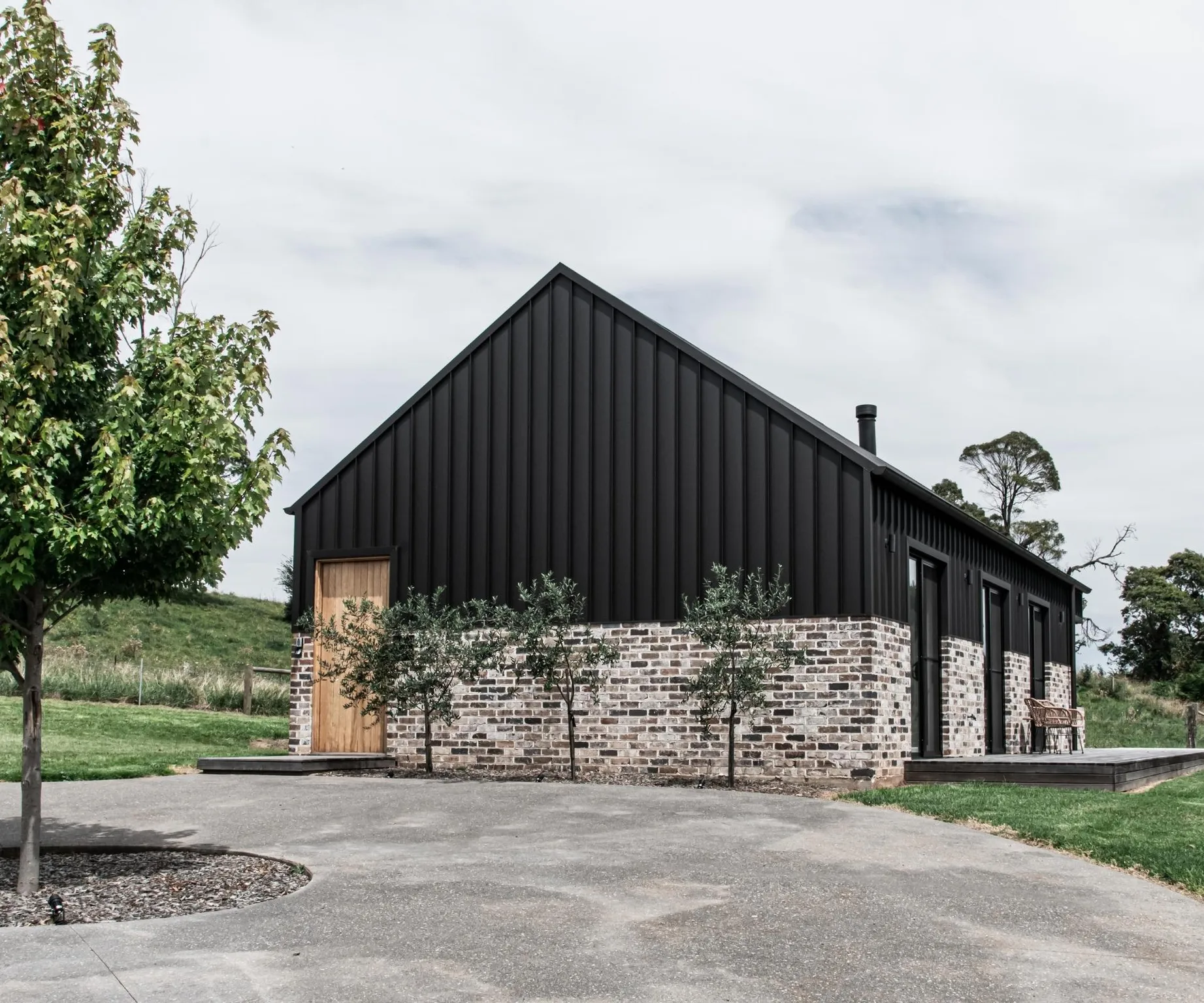 Choć The Barn to nowa budowla, od pierwszego spojrzenia widać, że została zaprojektowana z szacunkiem do miejsca. Elewacje z ciemnej blachy Colorbond w systemie Standing Seam zestawiono z cegłą z odzysku od Brickscape, co stworzyło surową, industrialną estetykę o mocnych liniach i wyrazistym charakterze. Bryłę otacza drewniany taras z miejscem na grill, przestrzenią do biesiadowania oraz efektownym, zagłębionym paleniskiem – jednym z największych atutów tej realizacji. Uzupełnieniem są starannie dobrane nasadzenia: dęby, oliwki i klony, które jesienią zapewniają widowiskowy spektakl kolorów.