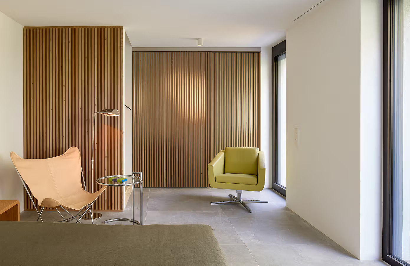 Projekt wnętrza opiera się na zasadzie otwartości i prostoty. Przestrzeń dzienna jest połączona z otoczeniem dzięki panoramicznym oknom i rozsuwanym drzwiom, które umożliwiają płynne przejście między wnętrzem a zewnętrzem. Wnętrze zostało zaprojektowane w duchu minimalizmu – dominują naturalne materiały, neutralne kolory i funkcjonalne rozwiązania.