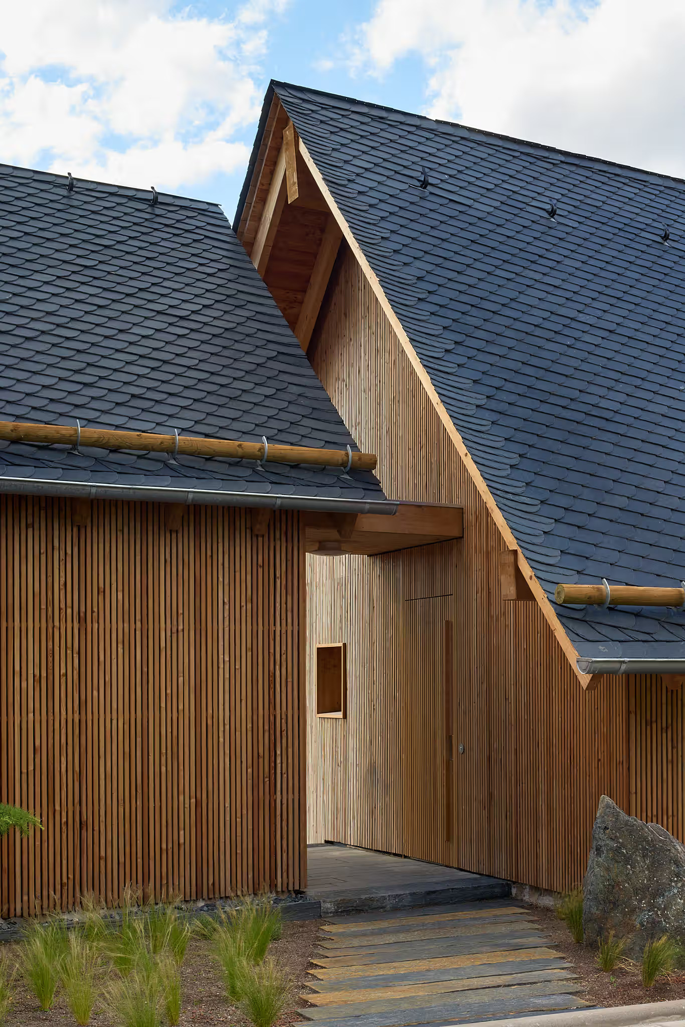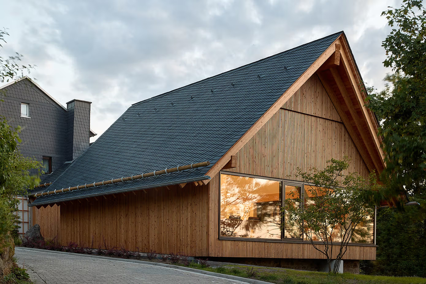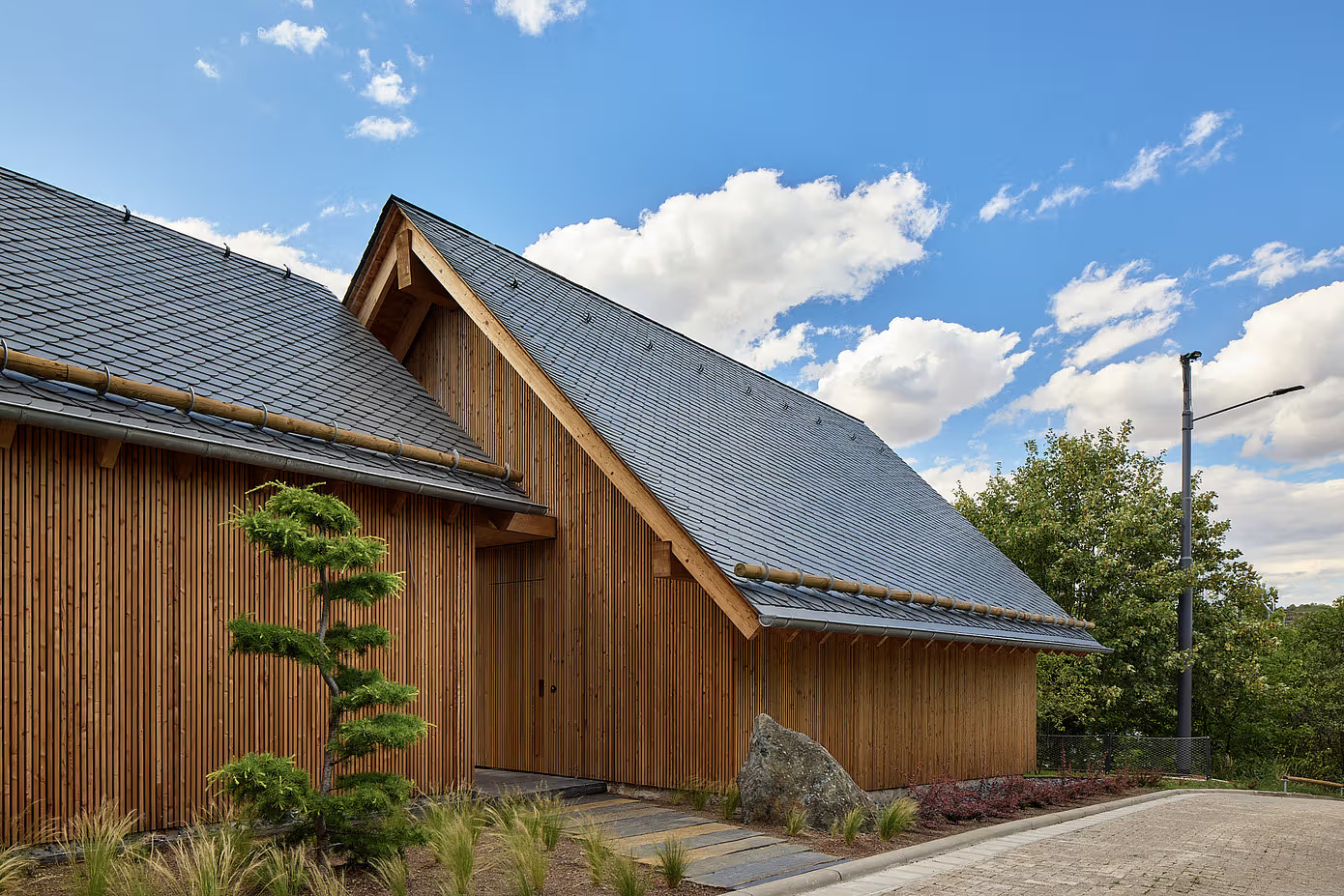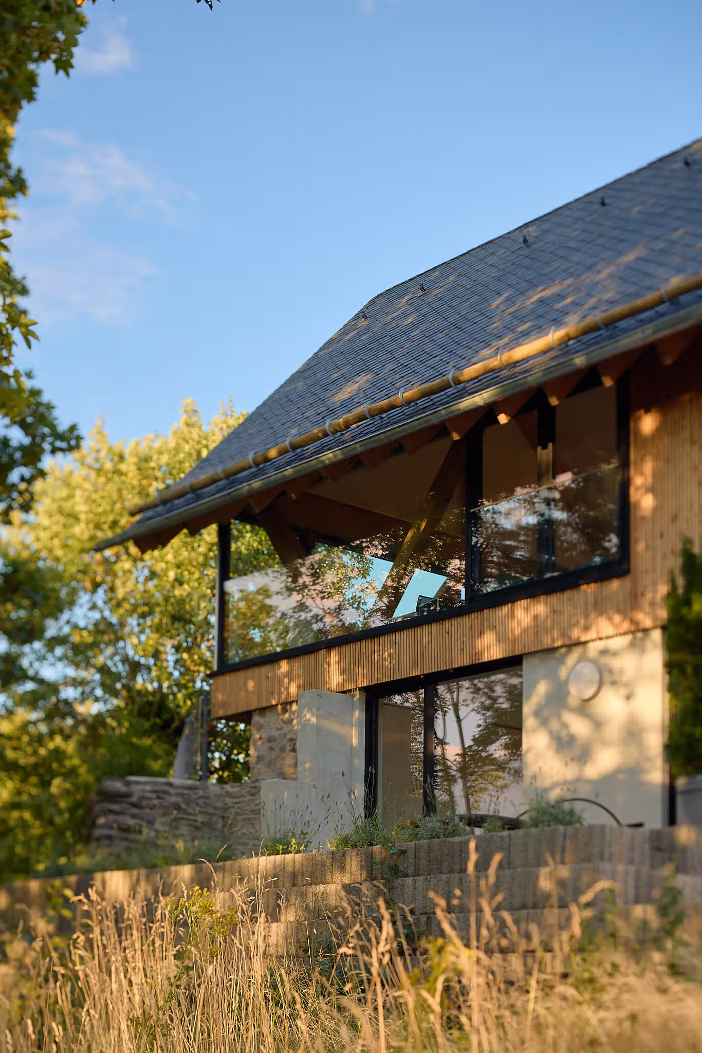 Budynek charakteryzuje się klasyczną, dwuspadową formą, która nawiązuje do tradycyjnych stodół, jednocześnie wprowadzając nowoczesne rozwiązania architektoniczne. Główna bryła domu jest wykończona naturalnym drewnem, które pod wpływem warunków atmosferycznych nabiera patyny, nadając budynkowi ponadczasowy wygląd. Surowe materiały, takie jak beton i szkło, kontrastują z ciepłym drewnem, tworząc spójną estetykę.