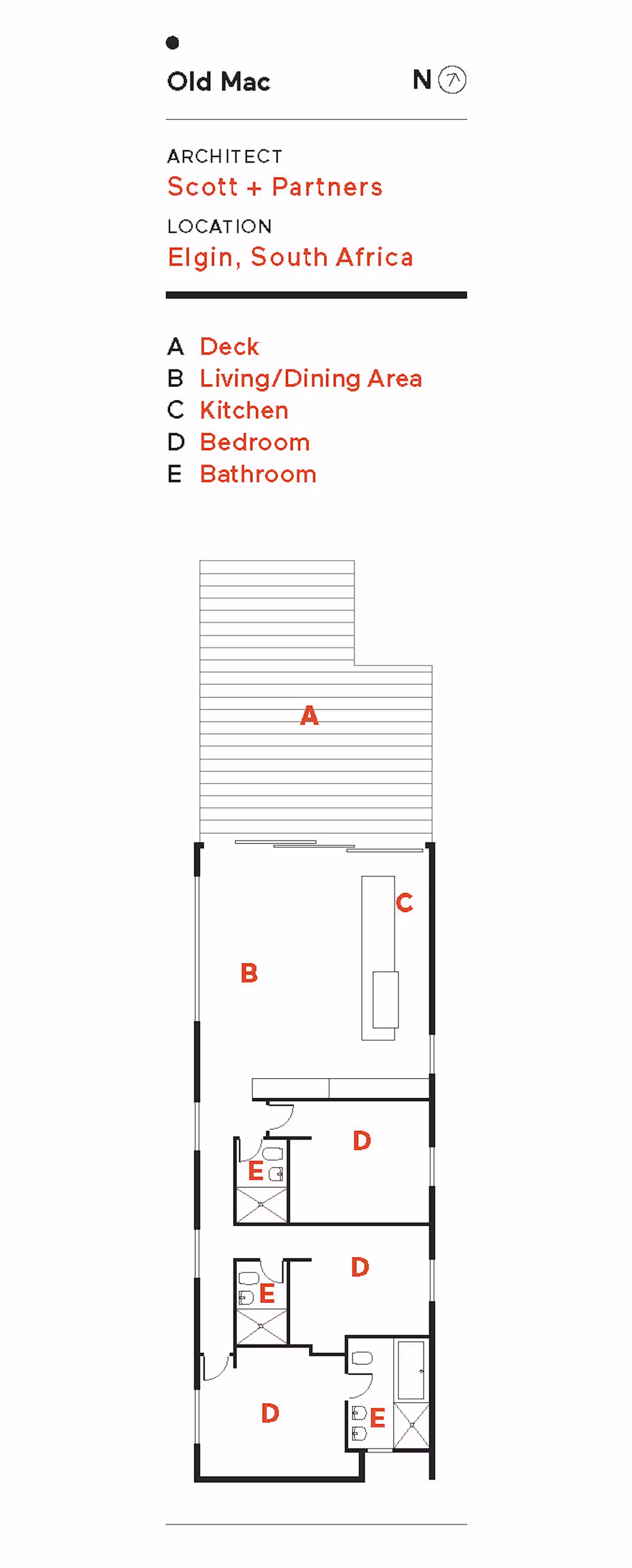 Jako współtwórca Daddy Long Legs Art Hotel w Kapsztadzie i Old Mac Daddy w Dolinie Elgin, gdzie goście śpią w przekształconych przyczepach Airstream, przedsiębiorca Jody Aufrichtig wie doskonale, jak ważna jest lokalizacja. Na dom wakacyjny dla siebie, żony Deirdre i czwórki dzieci wybrał wyjątkową działkę z widokiem na zachód, położoną między stawem a sadem jabłoniowym, niedaleko Old Mac Daddy.