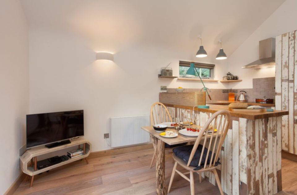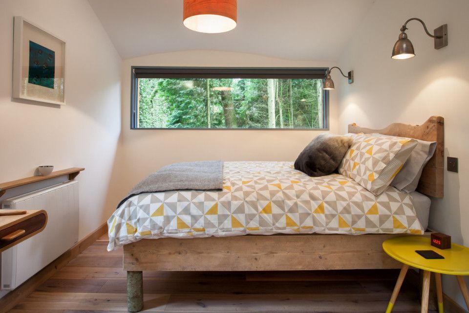 Z zewnątrz Birdhouse Treehouse zachwyca rustykalnym, swojskim charakterem, natomiast wnętrze utrzymane jest w estetyce nowoczesnej i minimalistycznej. Okrągłe okno w salonie znajduje swoje odzwierciedlenie w detalach architektonicznych i załamaniach sufitu, nadając przestrzeni spójność wizualną. Kuchnia łączy styl współczesny z elementami rustykalnymi — ręcznie wykonane szafki z odzyskanego, niemal stuletniego drewna podkreślają ekologiczny i rzemieślniczy charakter wnętrza. To idealny przykład, jak architektura bliska naturze może łączyć tradycję z nowoczesnością.