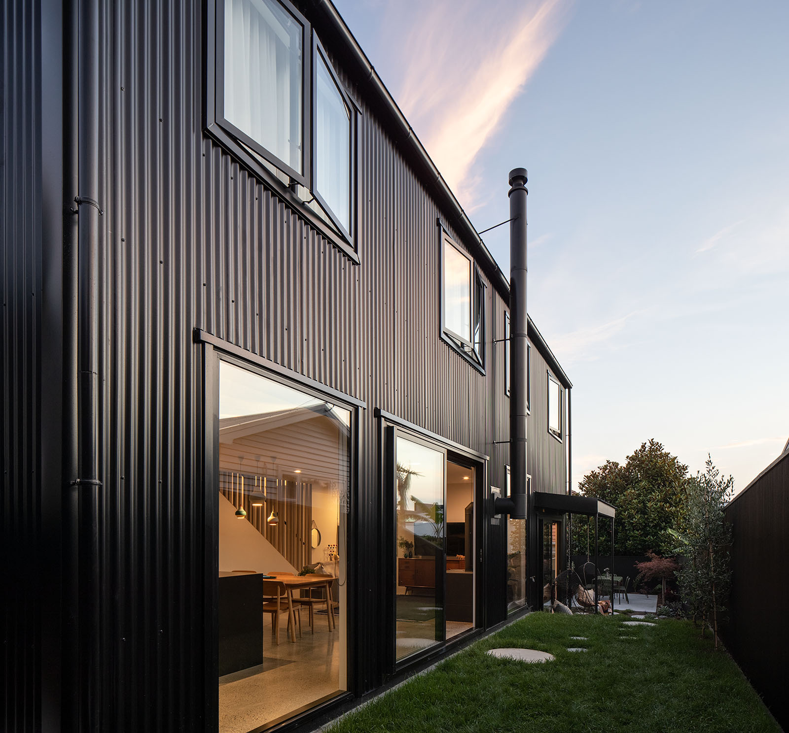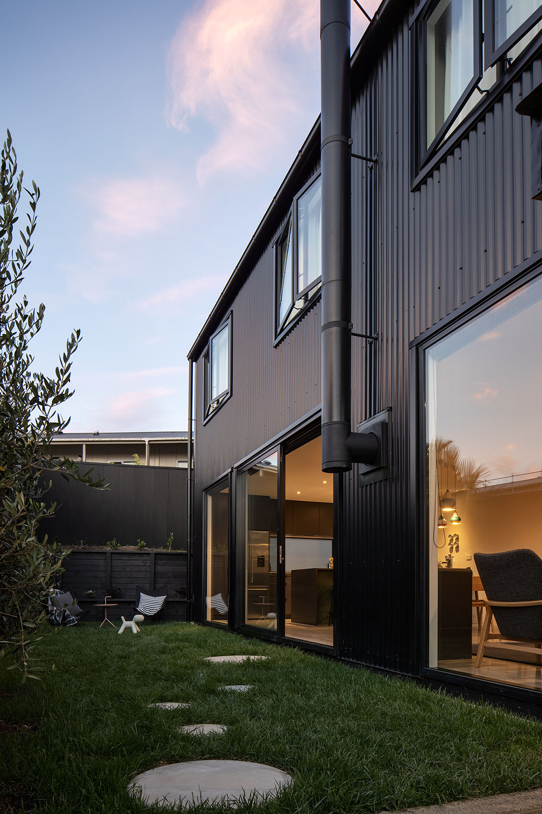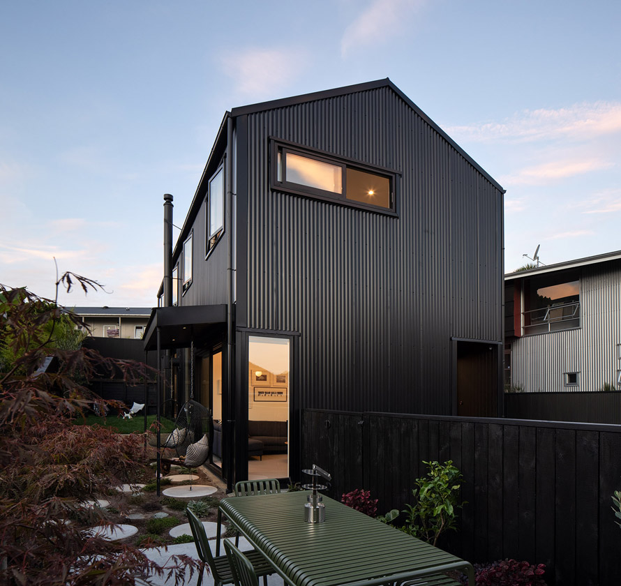 Z zewnątrz budynek wyróżnia się czarną sylwetką o eleganckim, dwuspadowym dachu – niczym czarny ptak spoglądający z góry na otoczenie, co stanowi subtelne nawiązanie do legendy o Maui i Tieke. Elewację wykonano z pionowej, metalowej blachy falistej w czerni, uzupełnionej aluminiową stolarką w tym samym kolorze. Smukły profil wpisuje się w gęstą, miejską tkankę Grey Lynn, jednocześnie kontrastując z sąsiednimi zabudowaniami i nadając miejscu unikalny charakter.