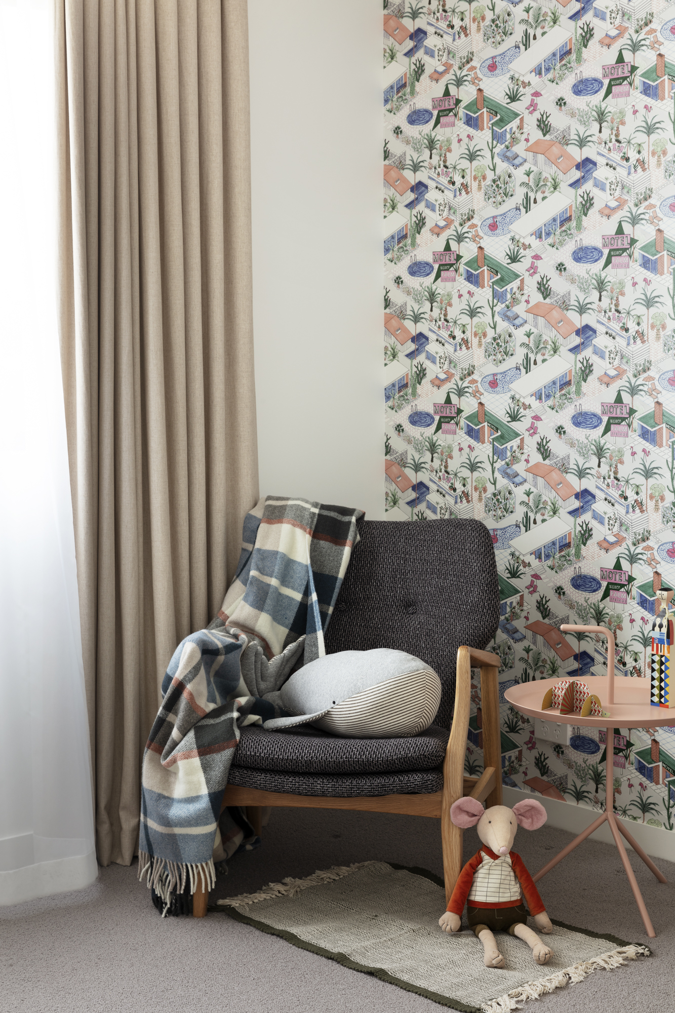 Wnętrza emanują lekkością, humorem i swobodą. Motywem przewodnim są okrągłe detale – od dekoracyjnego ekranu przypominającego zapis Morse’a, przez lampy Flos IC i wieszaki Eames „Hang it all”, po geometryczne płytki Mutina. Kolor odgrywa tu kluczową rolę, wprowadzając energię i zabawę do przestrzeni: czerń nawiązuje do elewacji, pastele dodają wdzięku, a zielenie i odcienie morza ożywiają przestrzeń i korespondują z naturą. Na tle tych akcentów dominuje neutralna baza – szarości, beton i drewno – nadająca wnętrzom spójności.