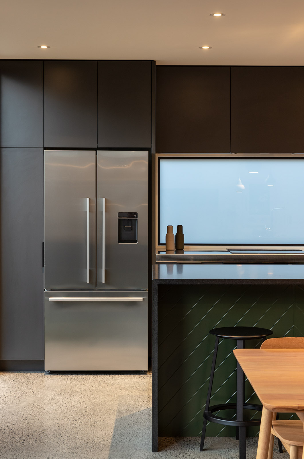 Kuchnia stanowi serce domu – zabudowę w ciemnoszarym melaninie zestawiono z wyspą o froncie w odcieniu morskiej zieleni, zdobionej chevronowym frezowaniem i wykończonej honowanym, czarnym granitem. Przy wyspie ustawiono stalowe stołki Hay Revolver, które nadają całości nowoczesny rytm.