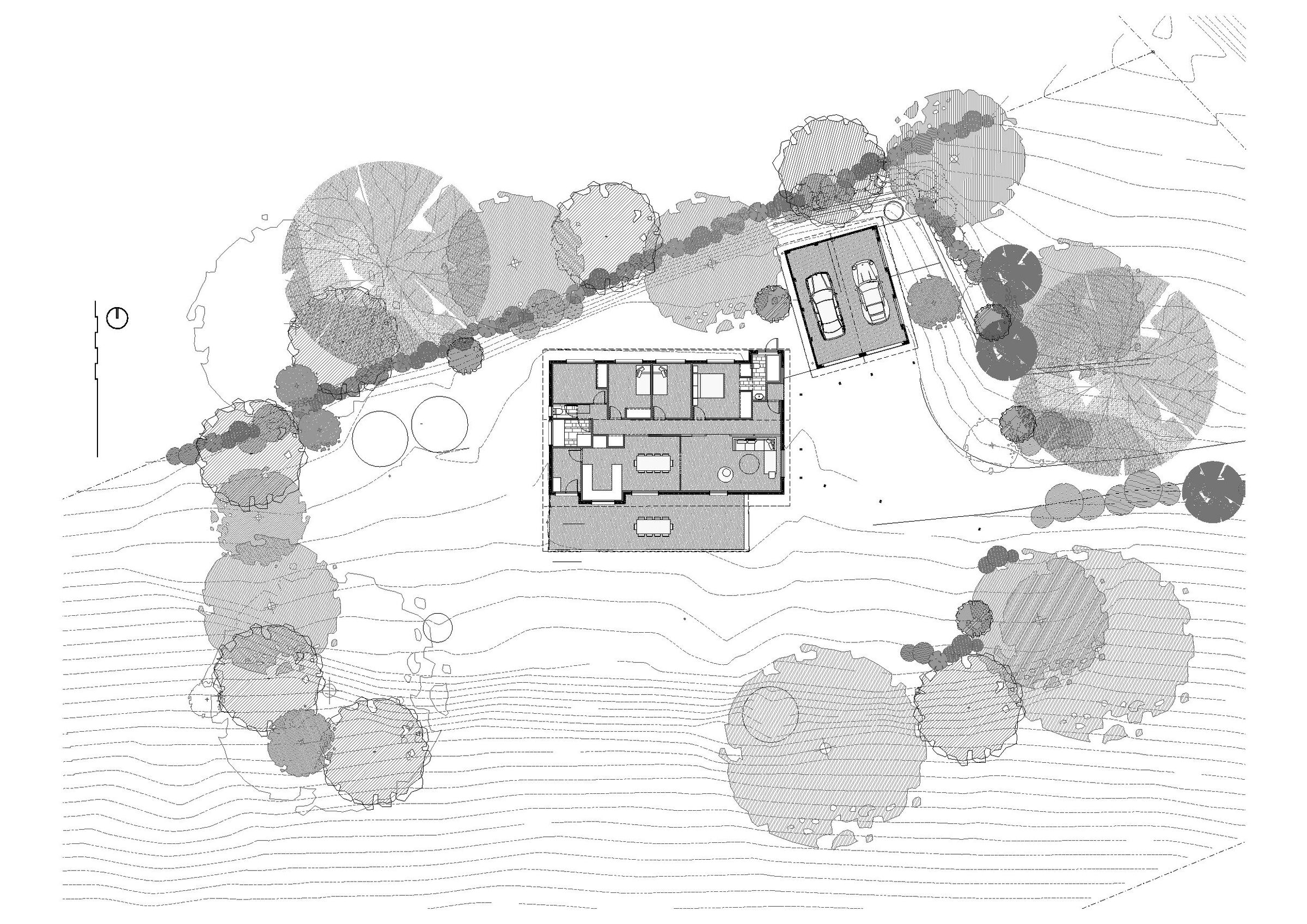 Stary dom był niedoświetlony, zimny i słabo wentylowany. Projekt architektoniczny koncentrował się na poprawie klimatu wewnętrznego, reorganizacji przestrzeni oraz lepszym połączeniu z otoczeniem. Zmieniono układ wnętrz, a nad kuchnią dodano podniesiony dach, wpuszczając do wnętrza więcej światła i świeżego powietrza. Przestrzenie zostały zoptymalizowane pod kątem dynamicznych potrzeb młodej rodziny, z elastycznym podziałem na strefy oraz minimalnym śladem zabudowy.