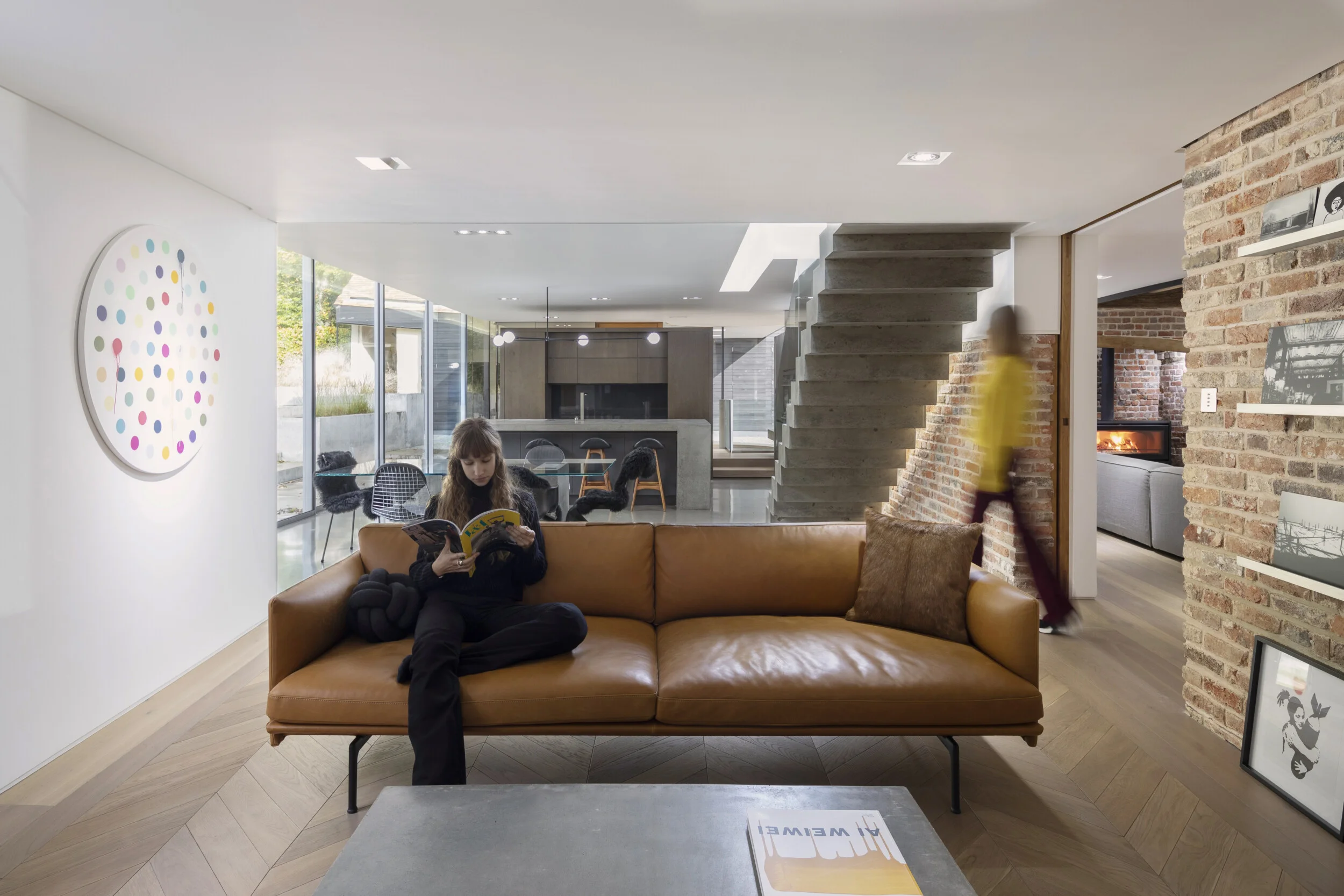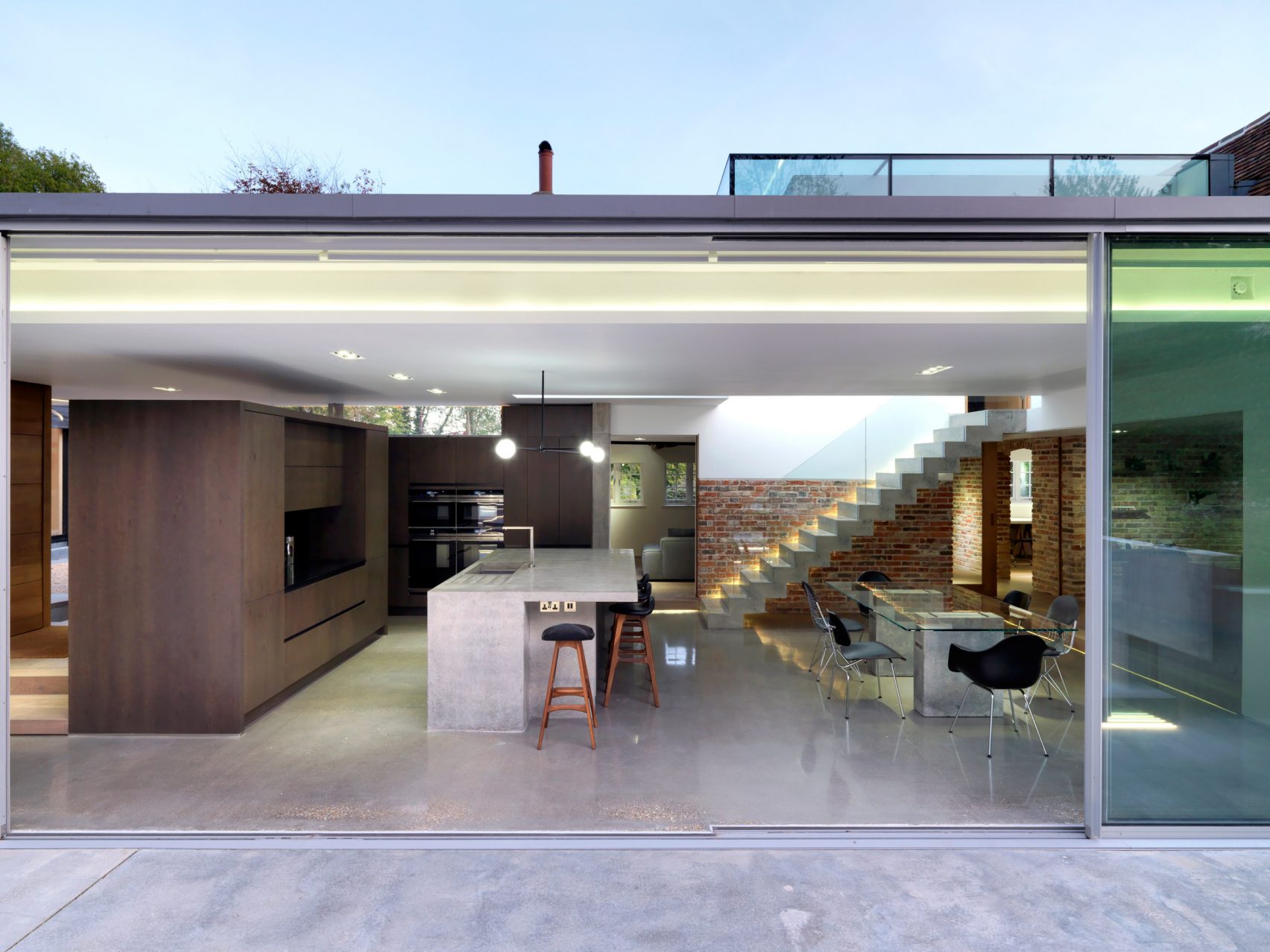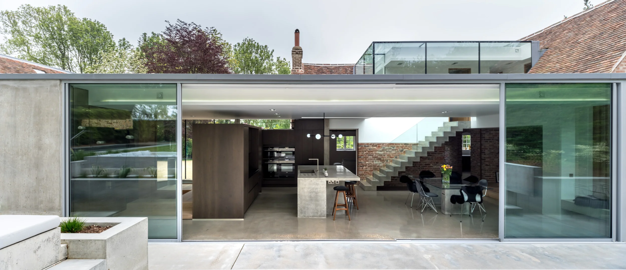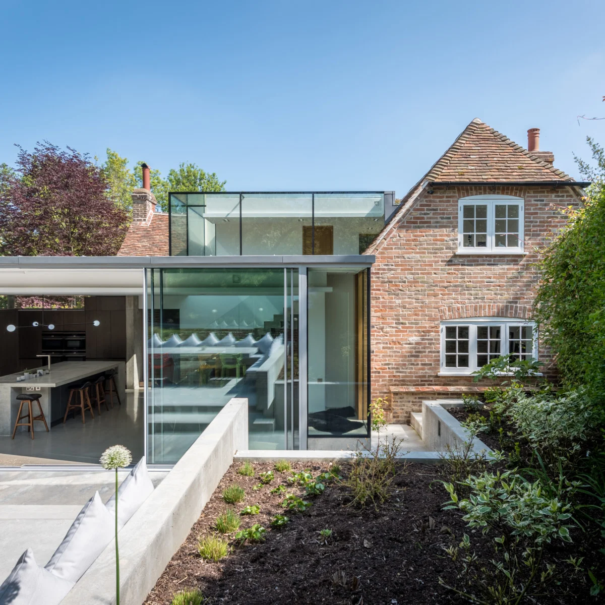 Frontowa fasada domu zachowuje historyczny urok i wpisuje się w otaczający ogród w stylu wiejskim. Z kolei nowoczesna rozbudowa od strony ogrodu stanowi zupełne przeciwieństwo – otwarta, wypełniona światłem przestrzeń łączy kuchnię i jadalnię, płynnie przechodząc w nowoczesny ogród z betonowymi elementami. Wnętrze domu kontrastuje tradycyjne detale, takie jak odbudowane ceglane ściany z zaprawą wapienną, z nowoczesnymi akcentami – polerowanymi betonowymi podłogami, schodami o minimalistycznej konstrukcji i przesuwanymi szklanymi drzwiami.