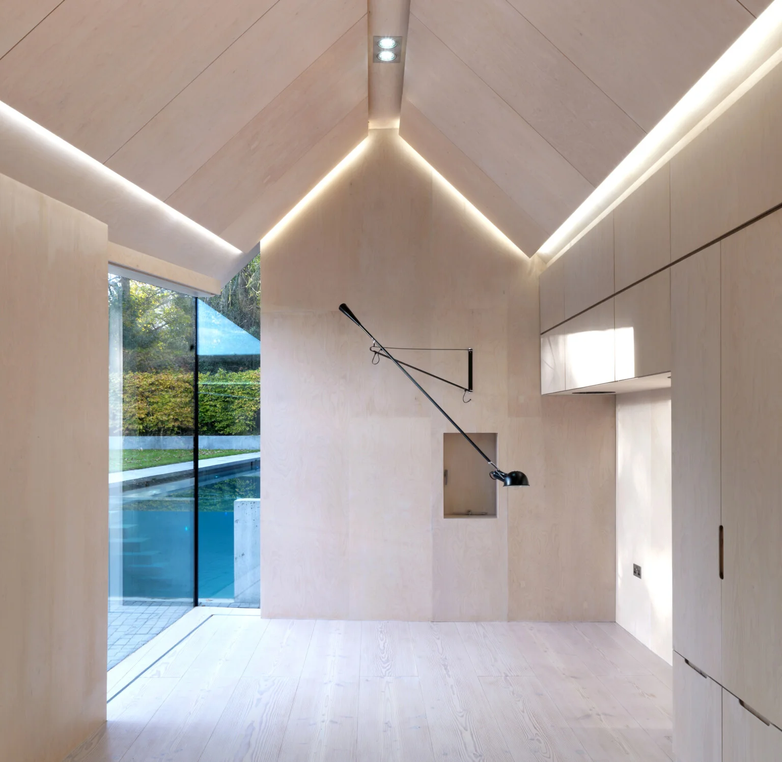 Rozbudowa obejmuje płaski dach pokryty zielonym sedum, który łączy główną część domu z aneksem. Aneks, wykończony litym drewnem modrzewiowym, pełni funkcję siłowni i sali kinowej. Wnętrze tego skrzydła zostało w całości pokryte sklejką, kryjącą sprytne rozwiązania, takie jak ukryte szafy, przesuwane drzwi i składane łóżka, które umożliwiają przekształcenie przestrzeni w miejsce noclegowe dla gości.