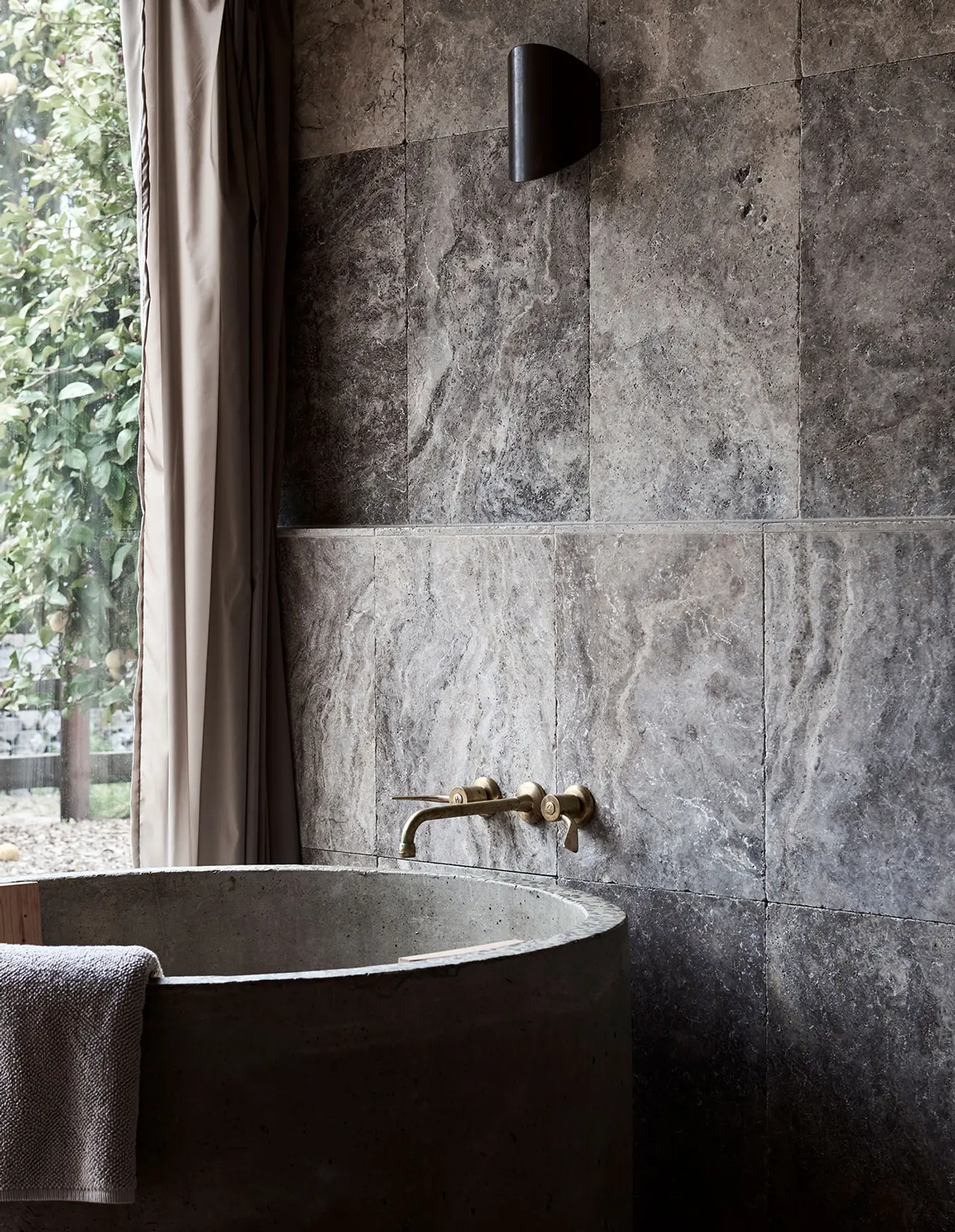 – trawertynowe płyty w łazience i na wyspie kuchennej,