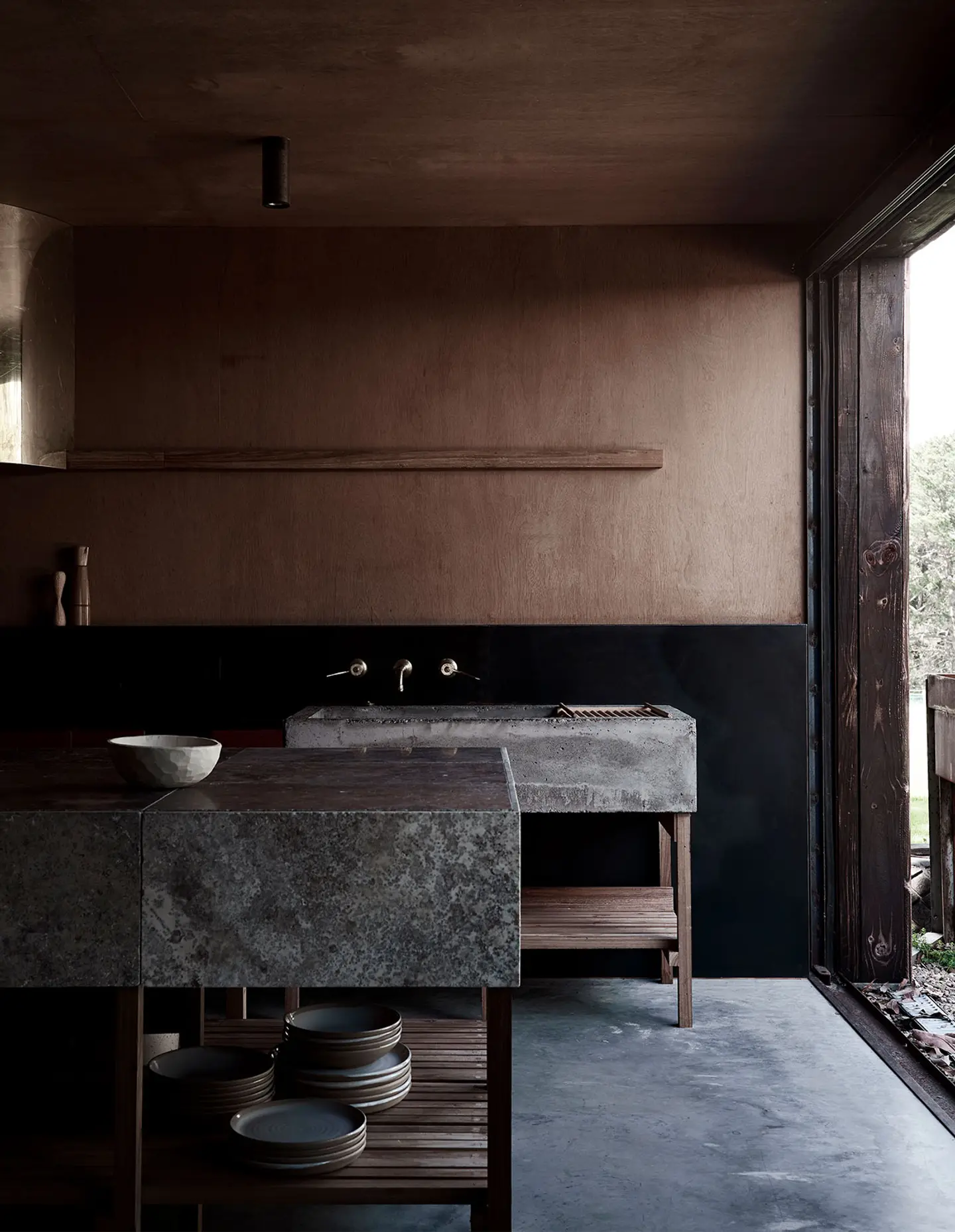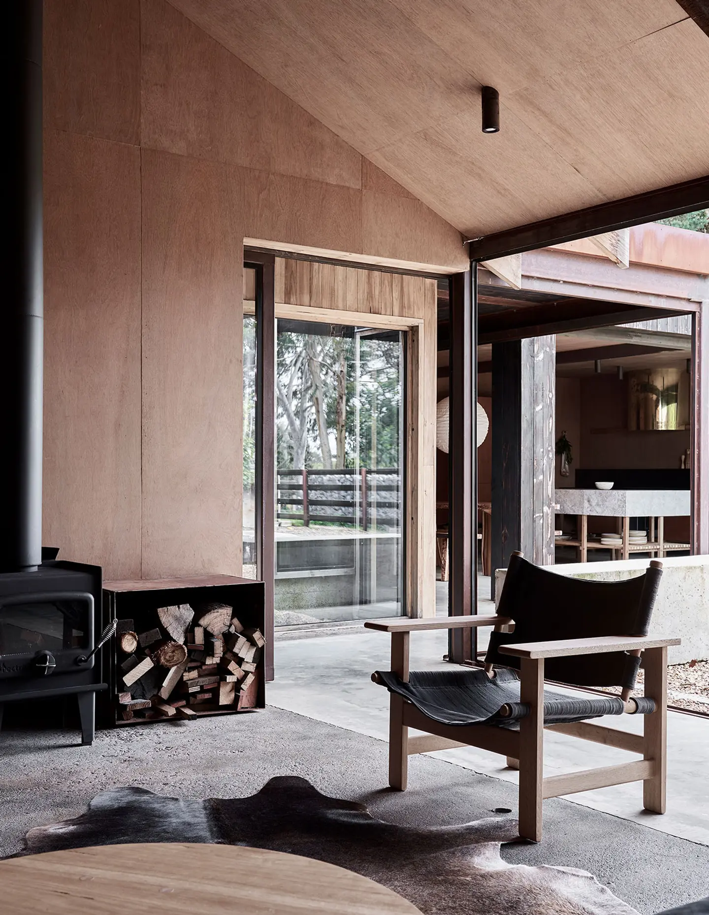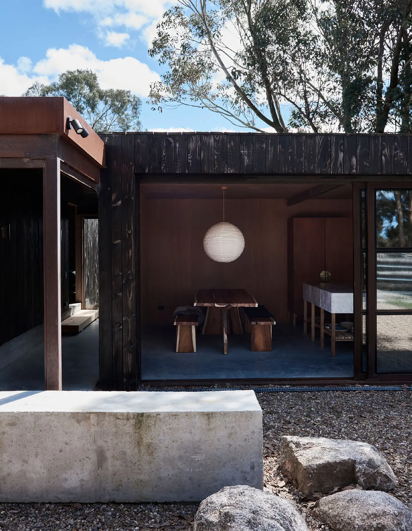Fasada z opalonego drewna Shou Sugi Ban nadaje całości głębi i ponadczasowej elegancji, a we wnętrzu królują naturalne materiały: