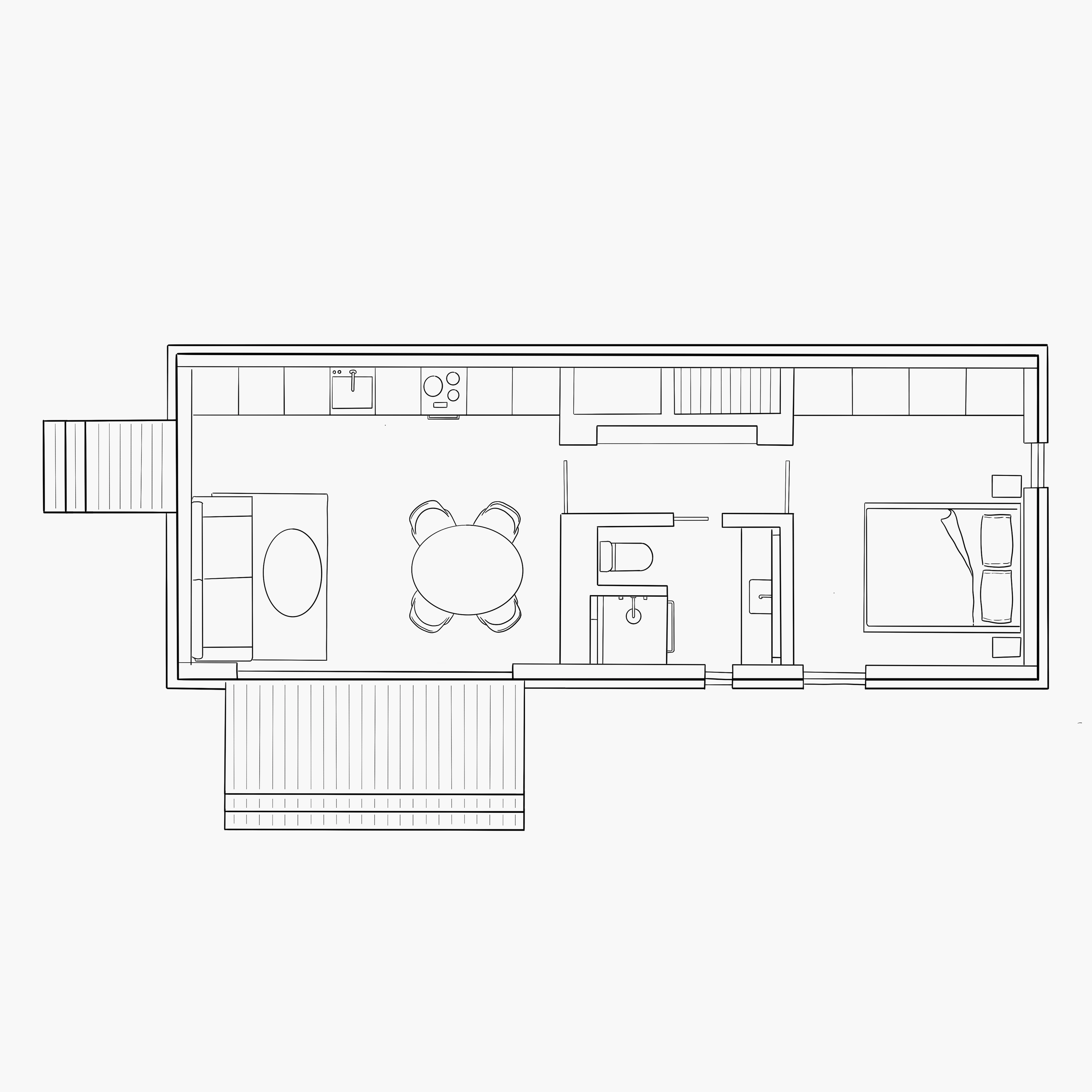 Dwell House został stworzony z myślą o osobach poszukujących kompaktowego, ale w pełni wyposażonego domu. Dzięki inteligentnemu wykorzystaniu przestrzeni, oferuje wygodne wnętrze, które składa się z otwartej części dziennej, nowoczesnej kuchni, łazienki oraz przytulnej sypialni. Duże, panoramiczne okna zapewniają doskonałe doświetlenie wnętrza oraz łączą przestrzeń mieszkalną z otoczeniem.