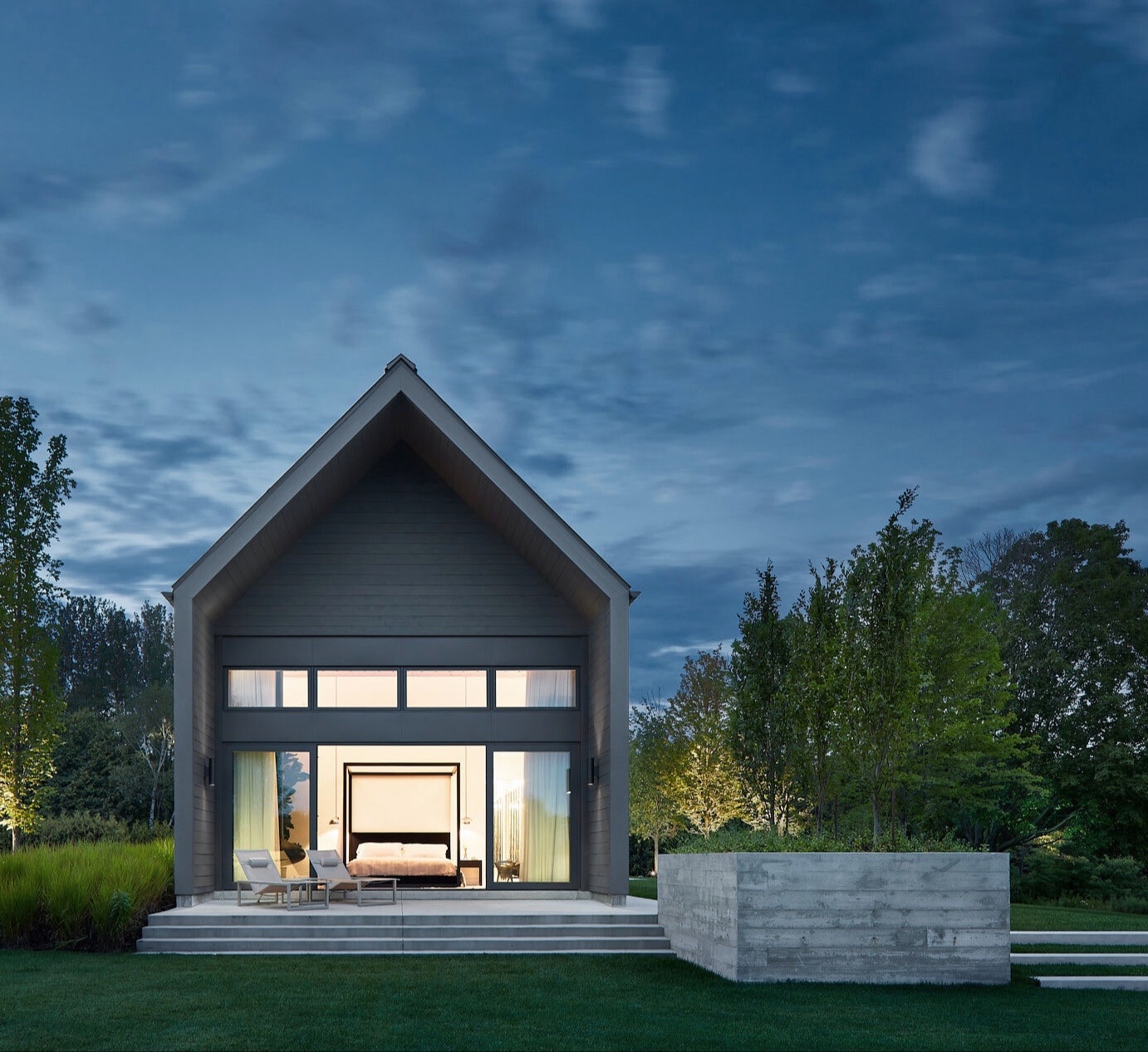Bryła głównego budynku ma aż 48 metrów długości i została zorientowana na wschód, by każdego poranka witać słońce. Elewację pokryto deskami z cedru bejcowanymi na ciemny grafit, a całość zwieńczono pasującym dachem z metalu. Dzięki temu dom zyskuje rustykalny charakter połączony z architektoniczną precyzją współczesnego designu. Surowa, minimalistyczna forma doskonale wpisuje się w otwarte krajobrazy Ontario, nie konkurując z naturą, lecz z nią współgrając.