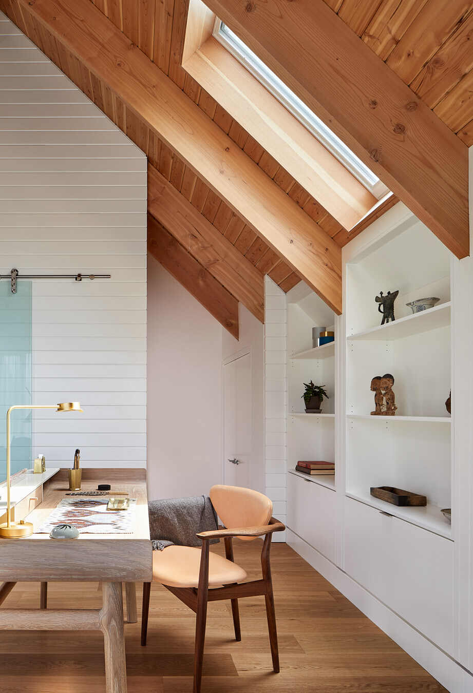 Czytelnia pod świetlikiem to ukryta oaza światła i wyciszenia. Ciepłe belki z cedru, biurko z litego dębu, rzeźbiarskie krzesło oraz mosiężna lampa tworzą przestrzeń zarówno funkcjonalną, jak i pełną charakteru. Wzdłuż domu rozlokowano dodatkowe sypialnie i łazienki – zaprojektowane z myślą o gościach i rodzinie.