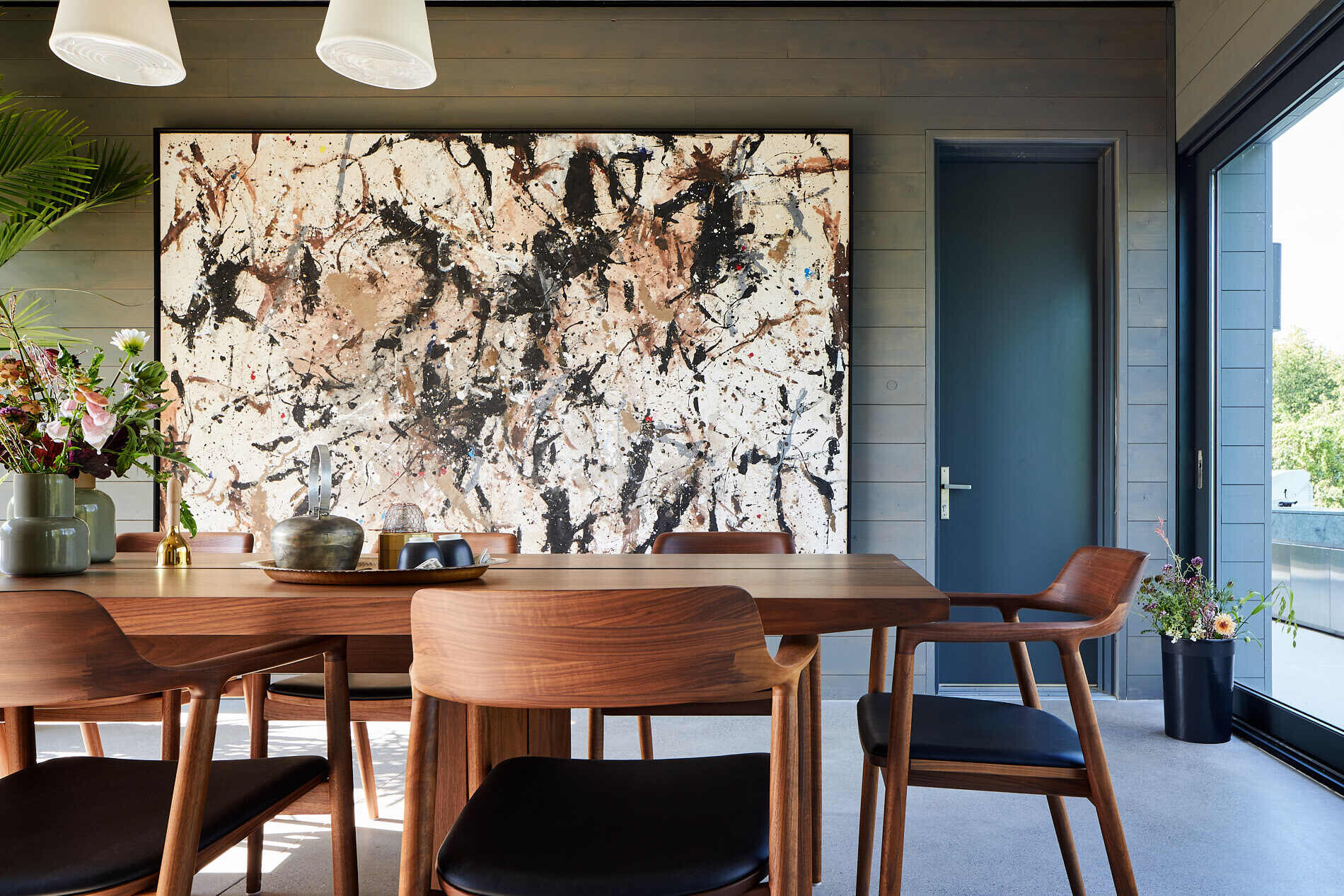 Wnętrze emanuje spokojem i harmonią – od polerowanego betonu na podłogach, przez jasny dąb i odsłonięte belki z daglezji, po dopracowane detale wykończenia. Pomieszczenia rozmieszczono liniowo, z naprzemiennym rytmem przestrzeni wspólnych i prywatnych. Na jednym krańcu znajduje się główna sypialnia z własnym, intymnym patio, a nad garażem zaaranżowano osobny loft – idealne miejsce do pracy twórczej lub wypoczynku w ciszy.