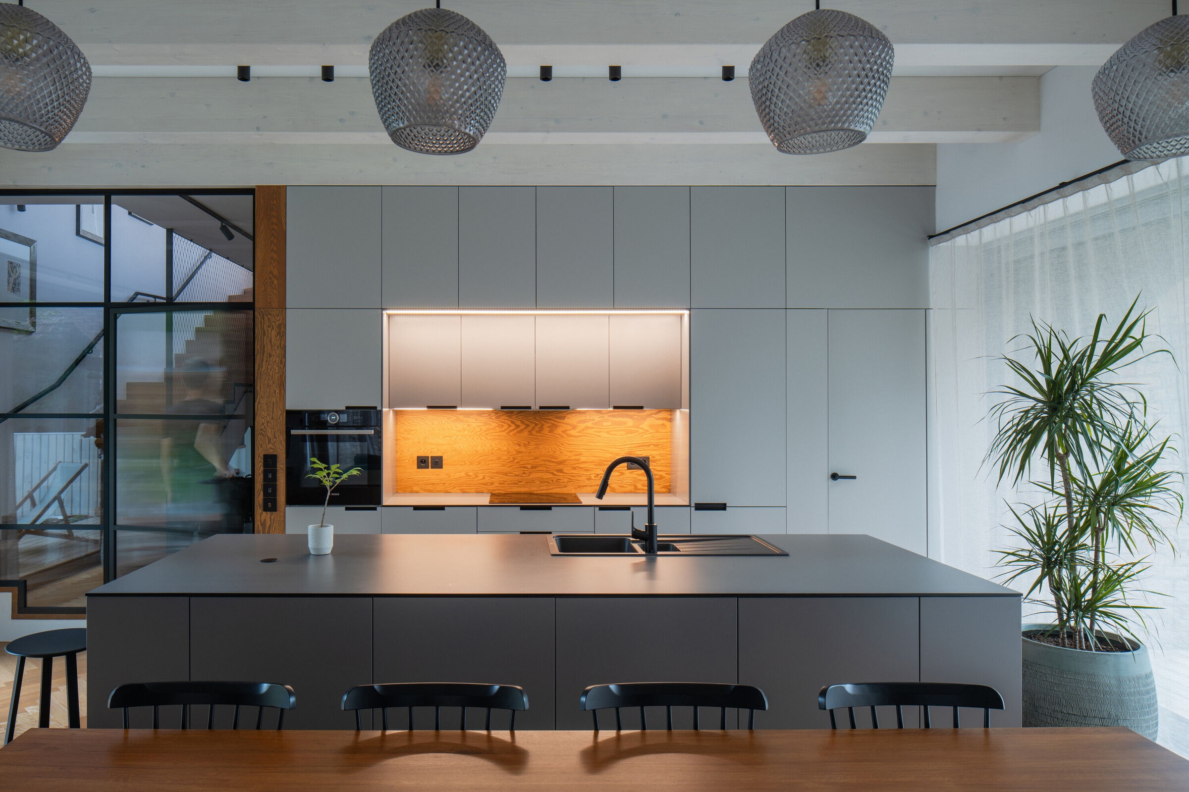 Ten wyjątkowy dom jest przykładem harmonii między tradycją a nowoczesnością. Stodoła podzieliła działkę na dwa ogrody o różnym charakterze, oferując przestrzeń zarówno do rekreacji, jak i praktycznych zastosowań. W ten sposób nowoczesny dom staje się częścią lokalnego dziedzictwa i naturalnego krajobrazu, opowiadając historię przeszłości w nowoczesnej formie.