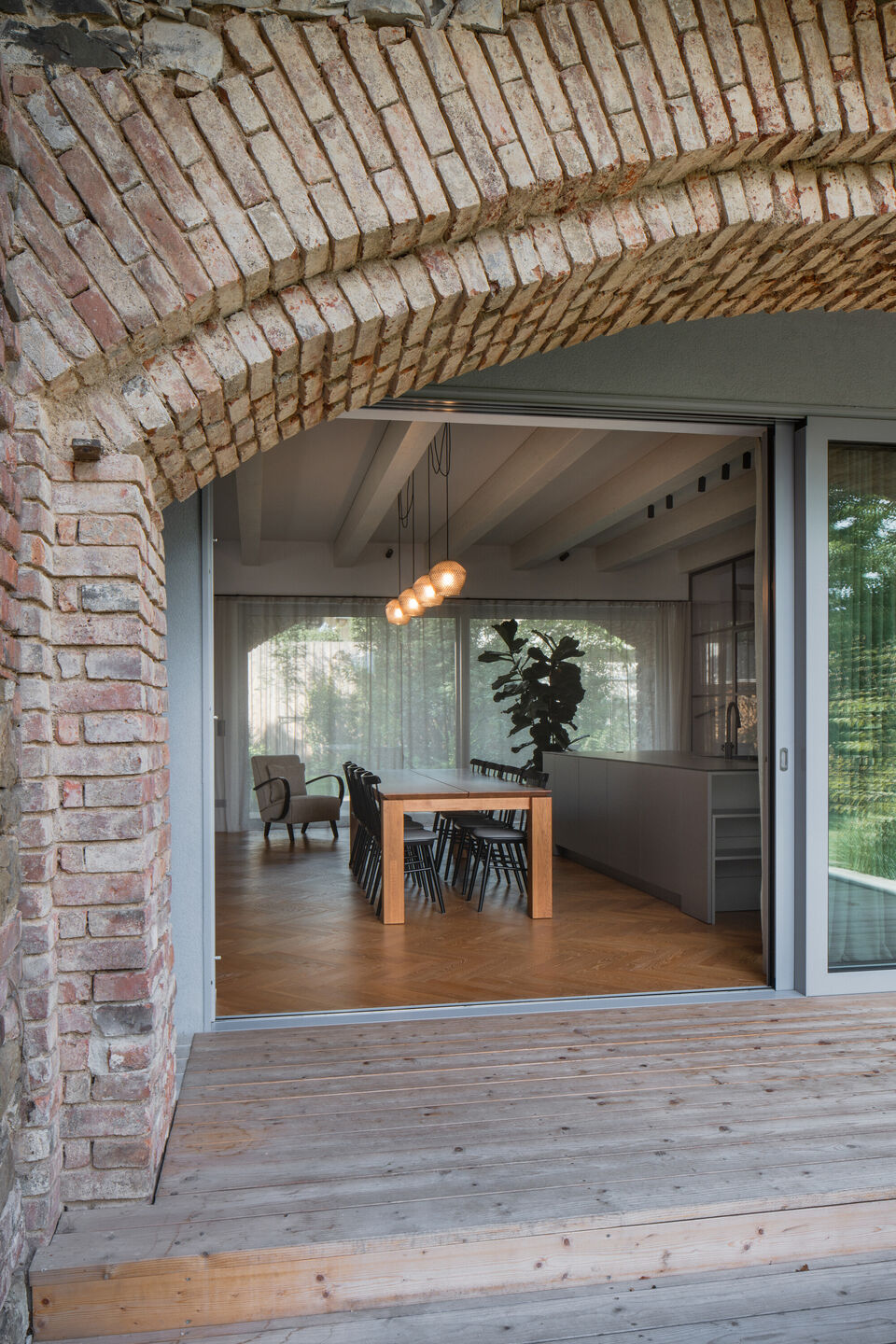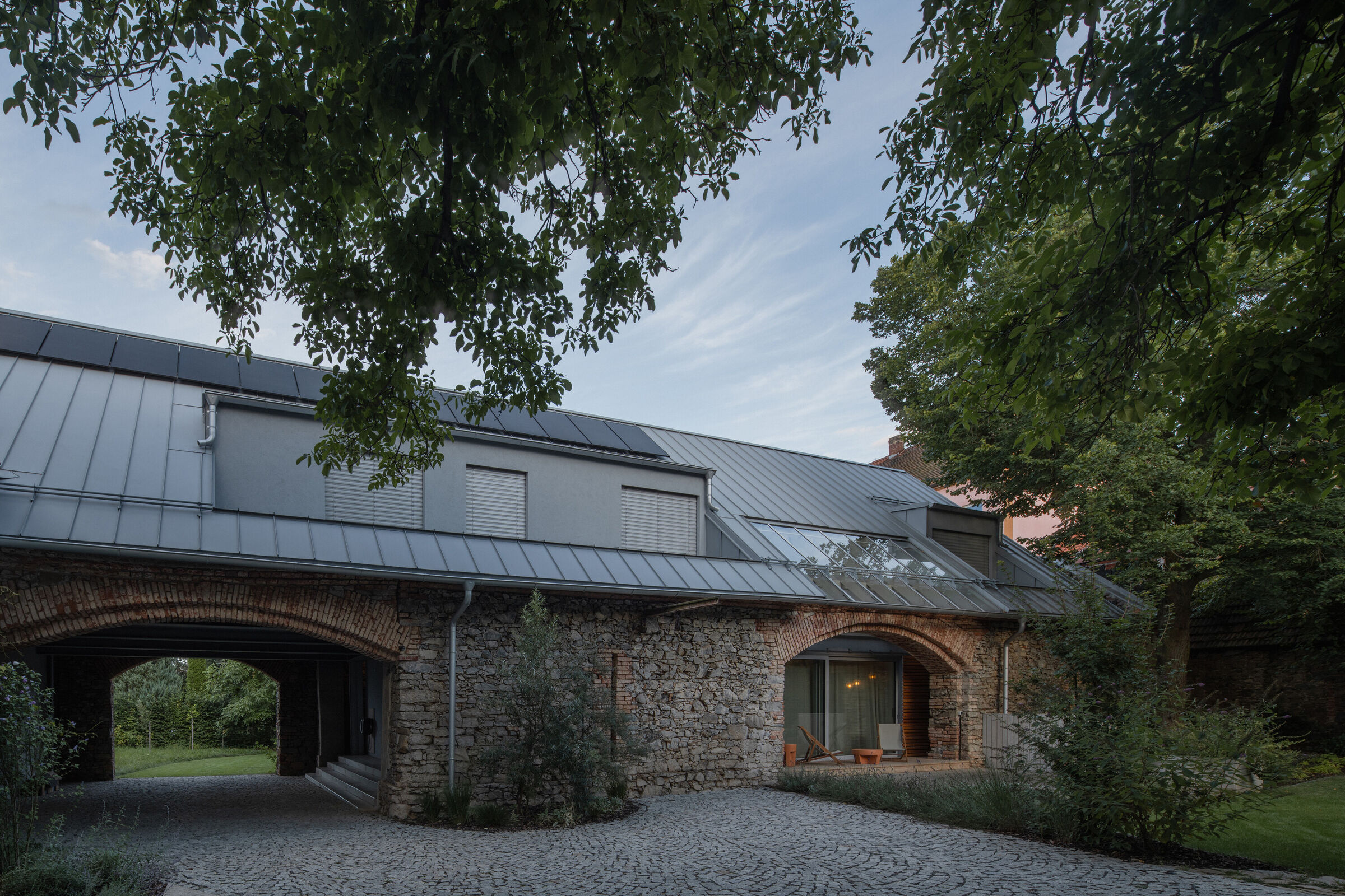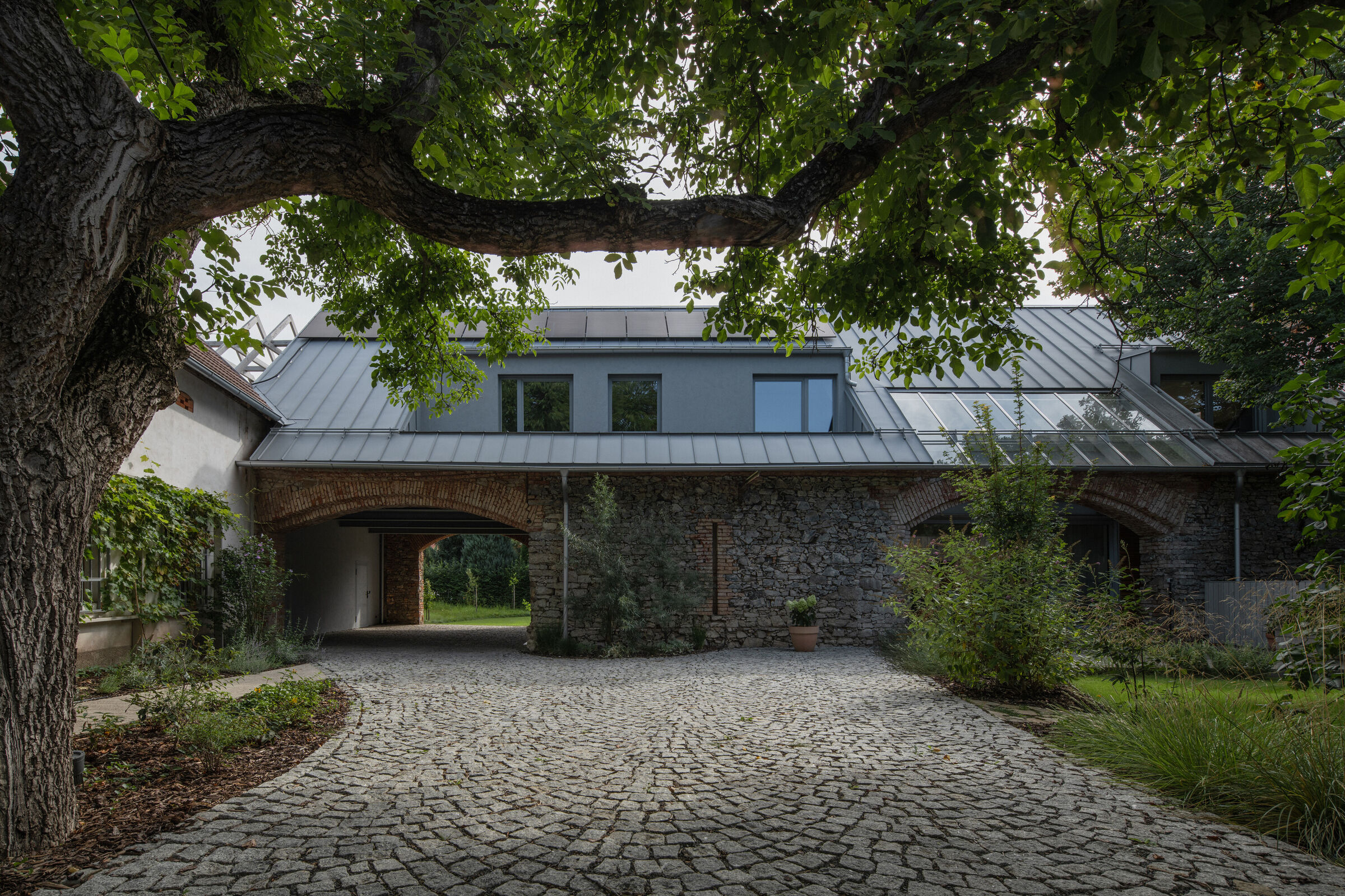 Václav i Marie, którzy dorastali w Dobříš, postanowili stworzyć miejsce, gdzie ich dzieci mogłyby odwiedzać babcię, pomagać jej w ogrodzie i jednocześnie budować własne wspomnienia. Oryginalna stodoła została odrestaurowana i wzmocniona, a w jej wnętrzu wstawiono drewnianą strukturę, która idealnie dopasowuje się do oryginalnych murów i łukowatych przejść, jednocześnie pozostając od nich niezależna.