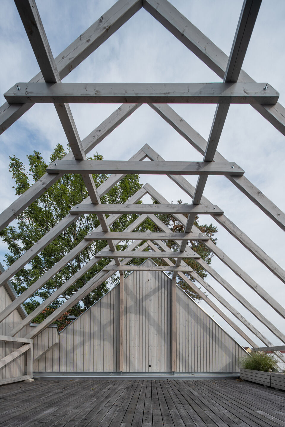 Drewniana konstrukcja została zaprojektowana z myślą o naturalnej wentylacji i dużej ilości światła. Wnętrze domu podzielono na dwie części: zachodnią z warsztatem i miejscem do przechowywania oraz południową z przestronnym salonem, kuchnią i jadalnią. Dwie tarasy, zlokalizowane po przeciwnych stronach budynku, umożliwiają korzystanie z różnych przestrzeni w zależności od pory dnia i słońca.