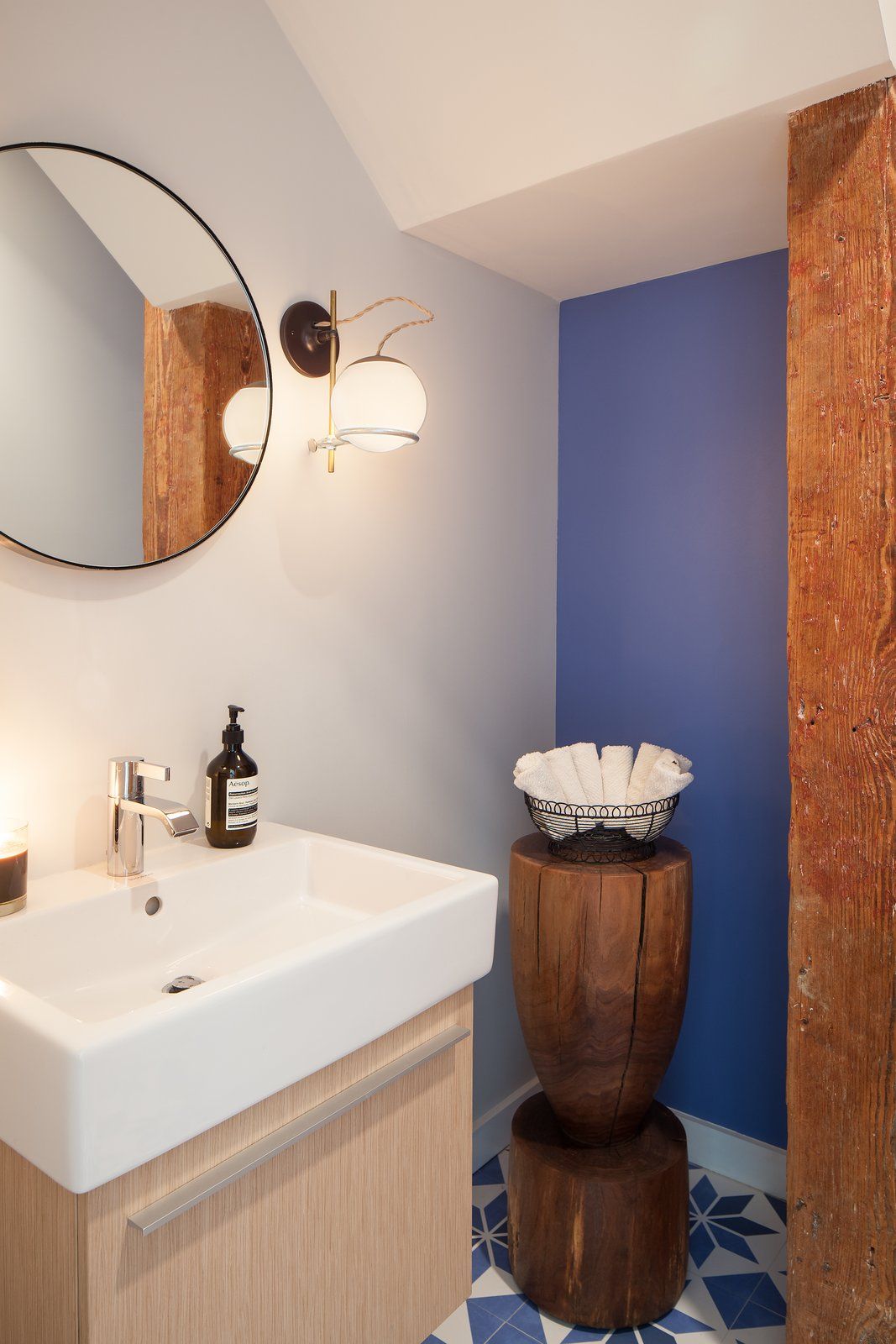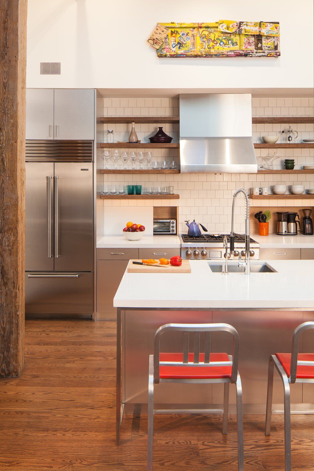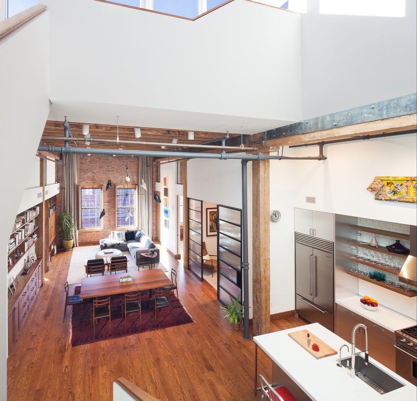 Projekt wnętrza skupiał się na zachowaniu autentycznego klimatu Williamsburga i przemysłowego dziedzictwa budynku. Odsłonięte ceglane ściany, widoczne konstrukcyjne belki oraz oryginalne drzwi przeciwpożarowe wkomponowane w aranżację łazienki podkreślają historyczny charakter przestrzeni. W ramach rozbudowy wzmocniono konstrukcję dachu, aby umożliwić pełne wykorzystanie powierzchni oraz stworzenie tarasu. Zaprojektowano nowe wewnętrzne schody, przegrody oraz wymieniono okna w kuchni, wpuszczając naturalne światło do wcześniej niedoświetlonej części wnętrza. Całość uzupełnia duża kuchnia oraz strefa kąpielowa z wanną z hydromasażem, tworząc spójny, nowoczesny loft, który – podobnie jak idea nowoczesna stodoła – łączy surową formę, funkcjonalność i wyrafinowany komfort.