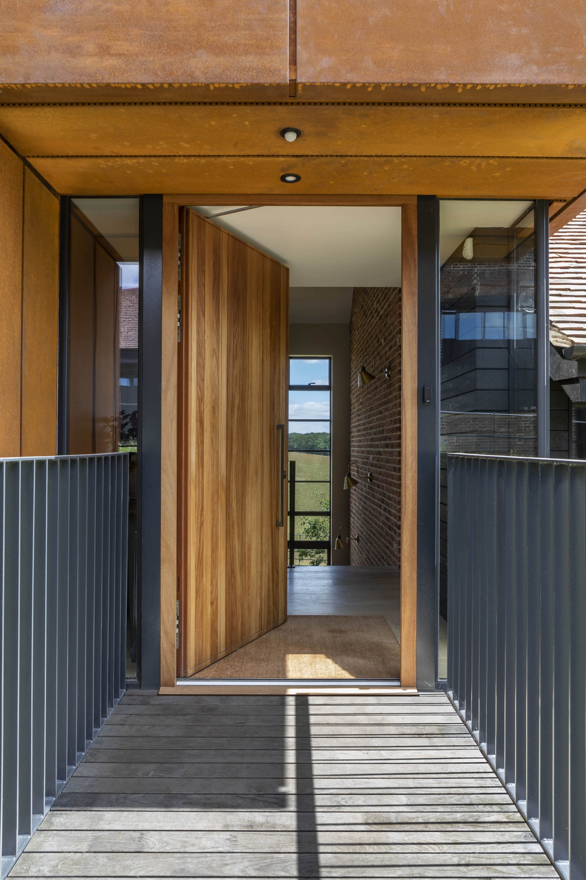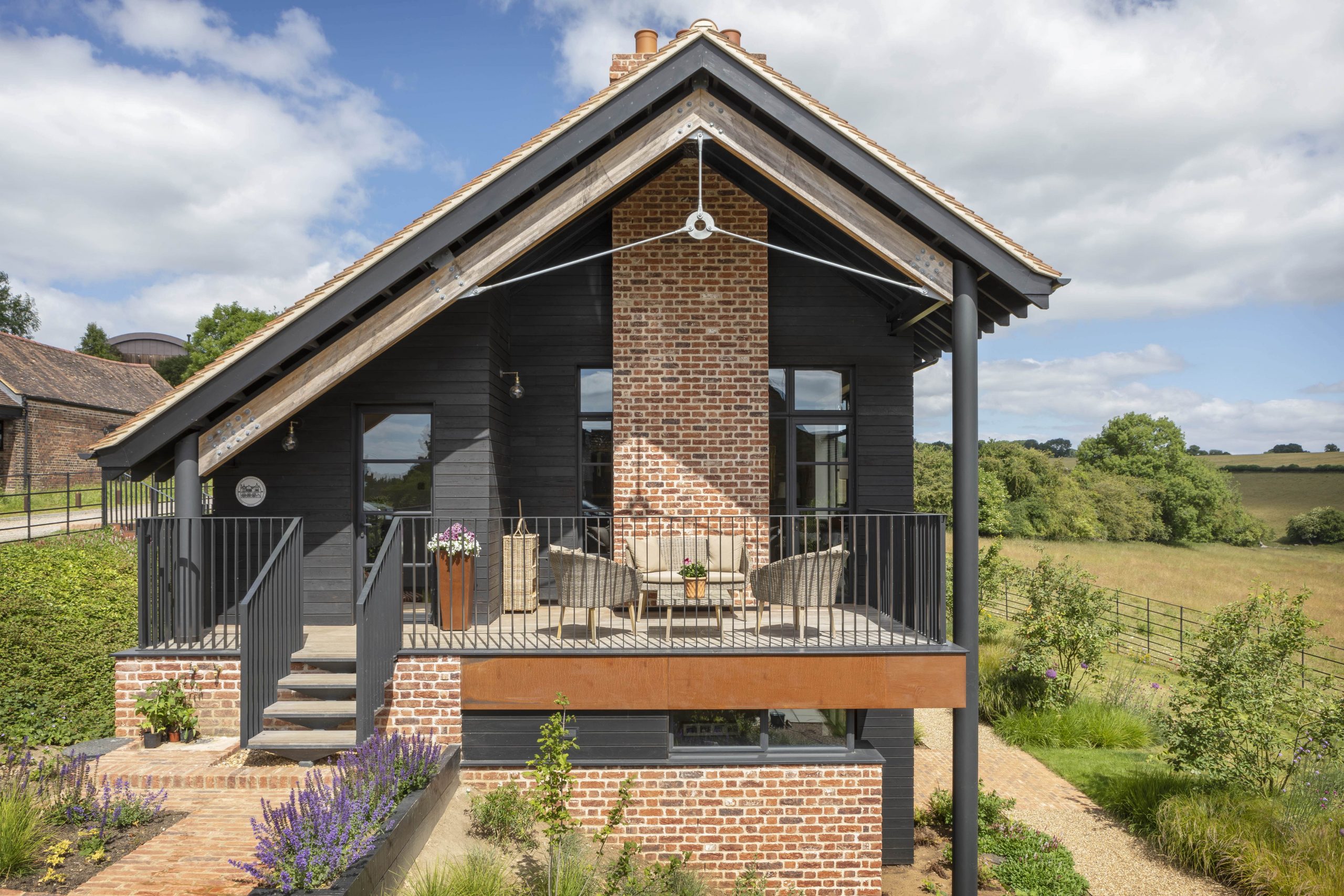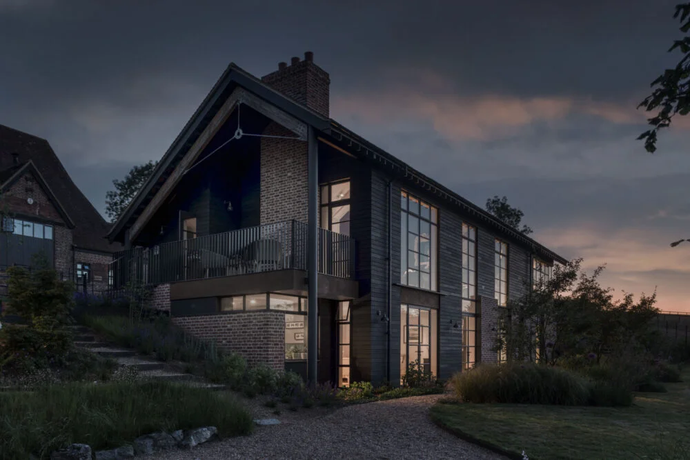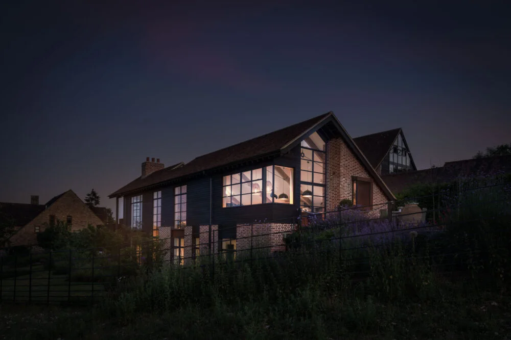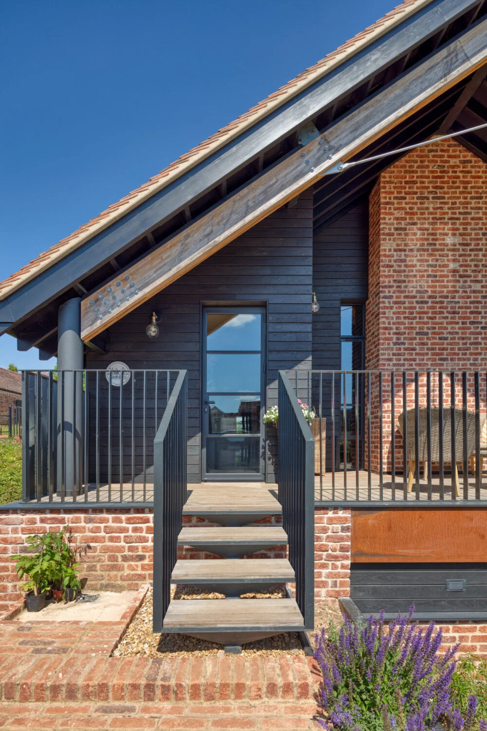 Projekt łączy lokalne materiały i nowoczesną formę: czerwona cegła Chiltern, czarne drewno, stal Corten i okna Crittall podkreślają industrialny charakter budynku. Dzięki temu powstała nowoczesna stodoła – idealne połączenie surowej estetyki z komfortem życia rodzinnego.