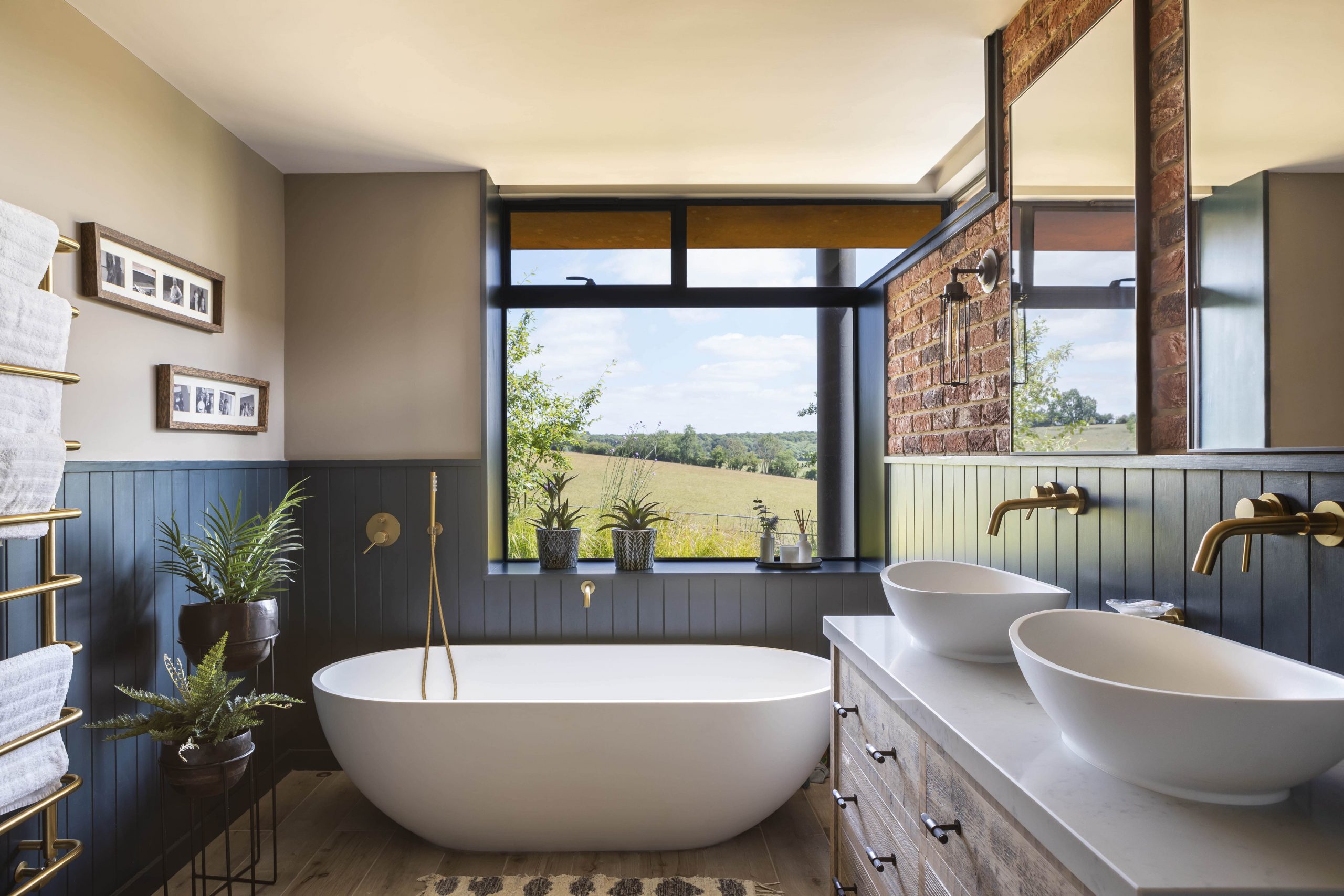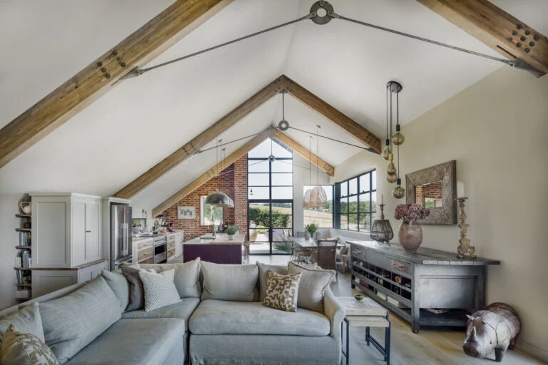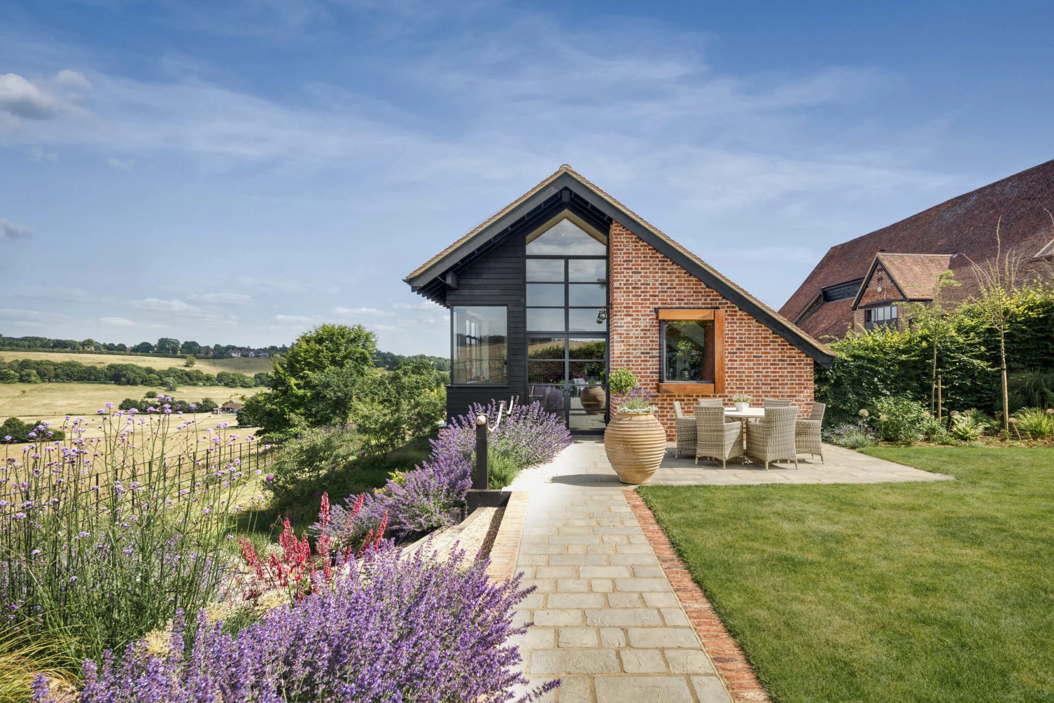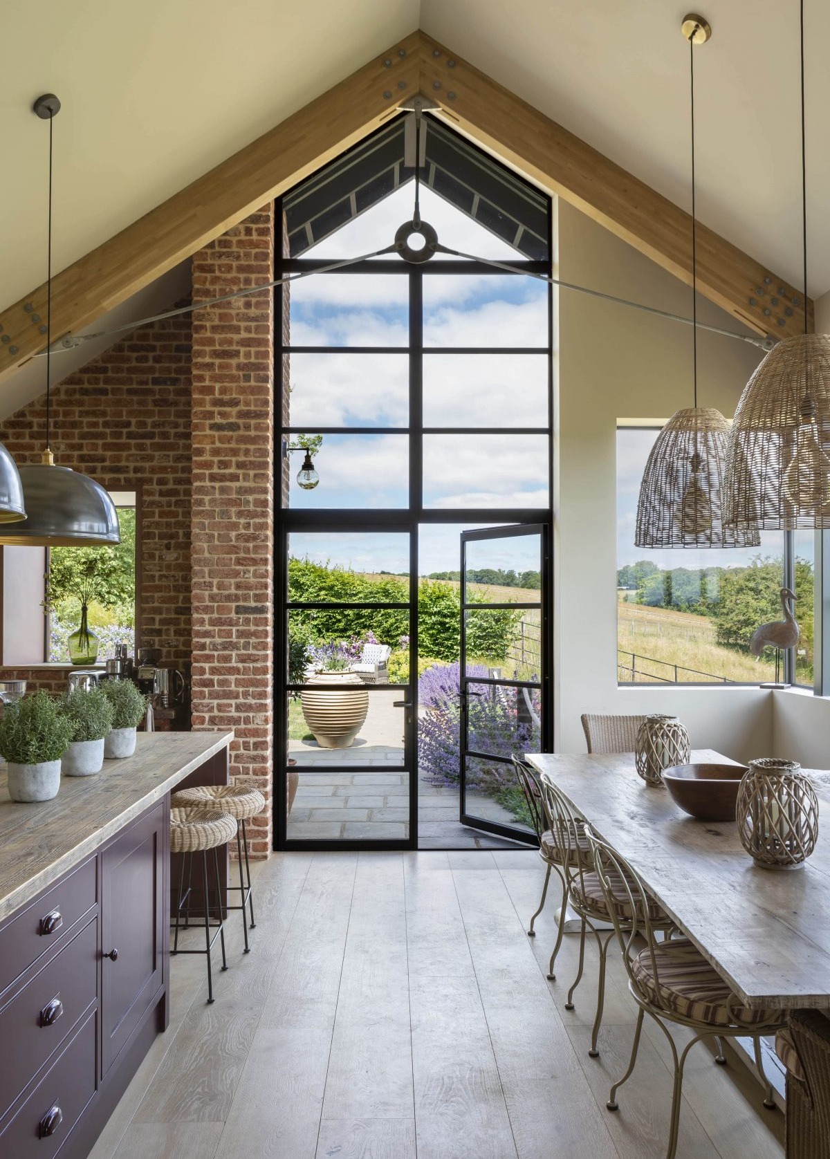 Projekt łączy lokalne materiały i nowoczesną formę: czerwona cegła Chiltern, czarne drewno, stal Corten i okna Crittall podkreślają industrialny charakter budynku. Dzięki temu powstała nowoczesna stodoła – idealne połączenie surowej estetyki z komfortem życia rodzinnego.