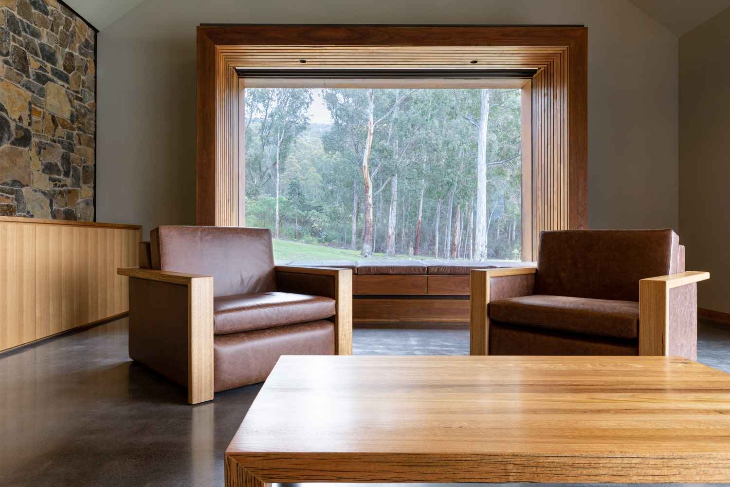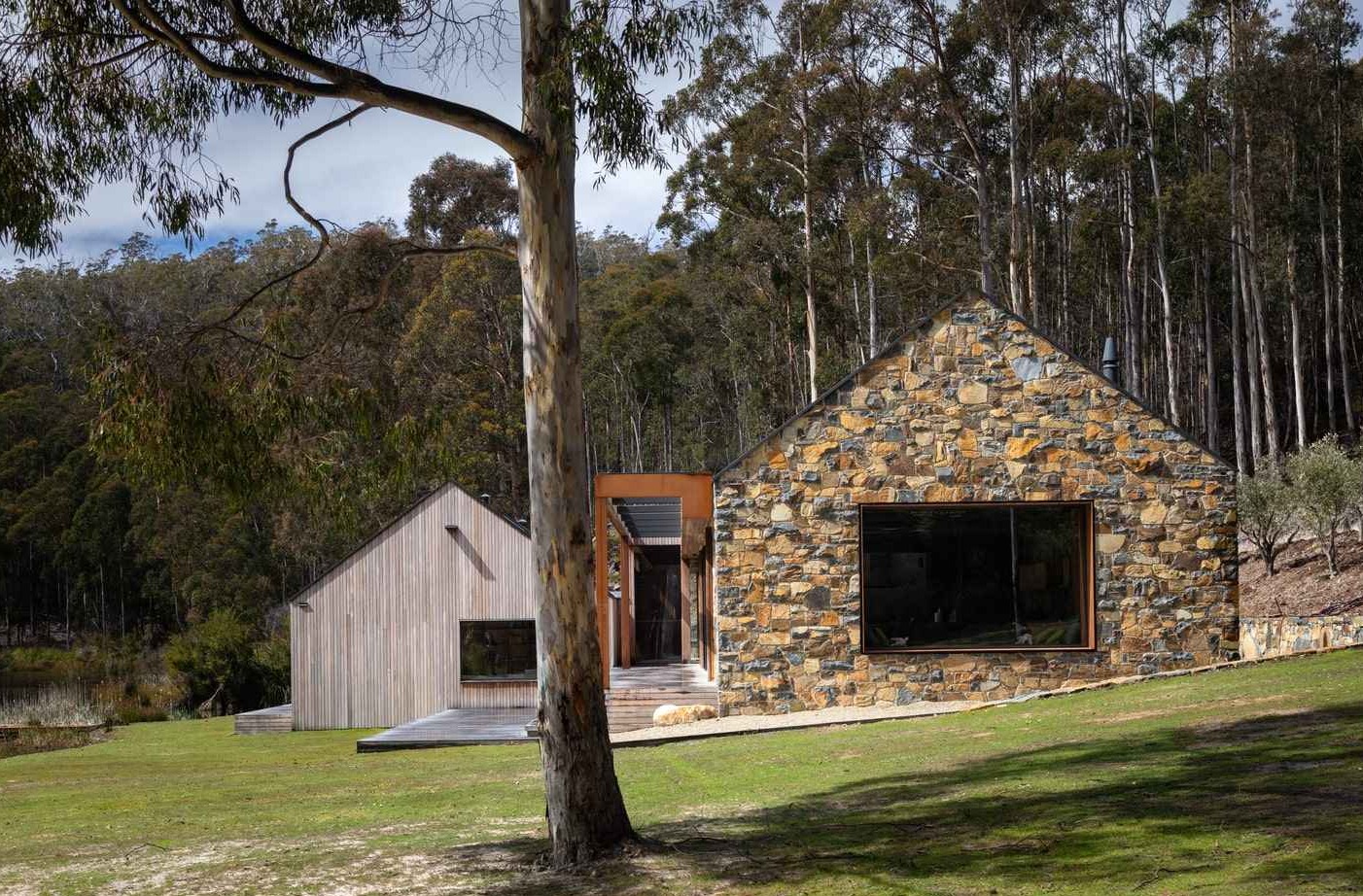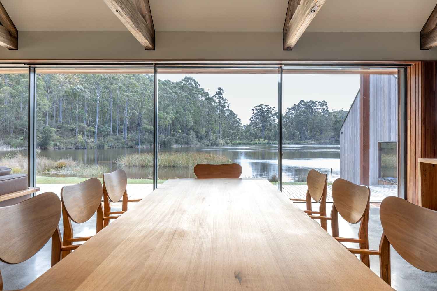 Rozdzielenie budynku na dwa poziomy pozwoliło dopasować się do konturów terenu i funkcjonalnie oddzielić część dzienną od strefy prywatnej. Skrzydło z sypialniami, wykonane z drewna, zbliża się do brzegu jeziora, tworząc bardziej intymną przestrzeń w stylu domku letniskowego lub hangaru na łodzie. Południowe światło przenika przez liście eukaliptusów i wprowadza ciepły klimat do wnętrz. Energia cieplna pozyskiwana jest z jeziora dzięki geotermalnej pompie ciepła z pętlą wodną, natomiast 72 panele fotowoltaiczne zaspokajają zapotrzebowanie na prąd i pozwalają oddawać nadwyżki energii do sieci. Dom zaprojektowano jako niemal całkowicie samowystarczalny – pod względem energii, wody i komfortu cieplnego.