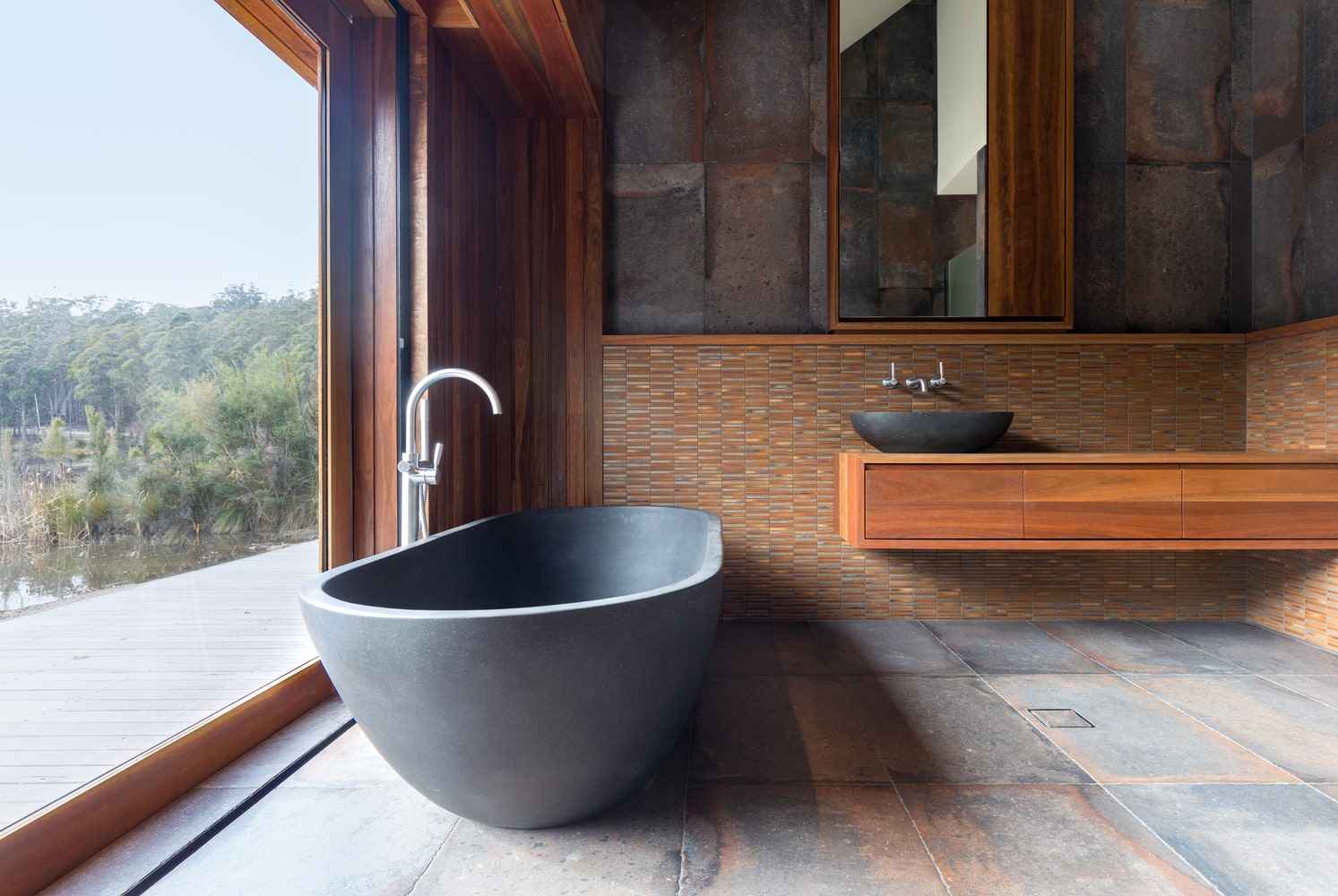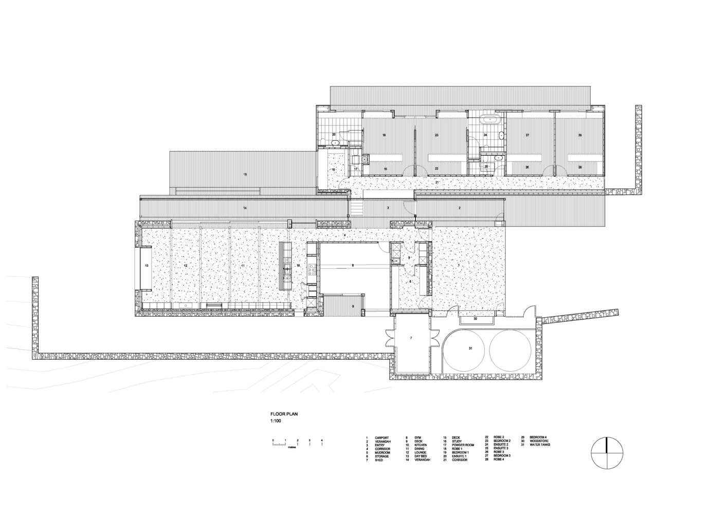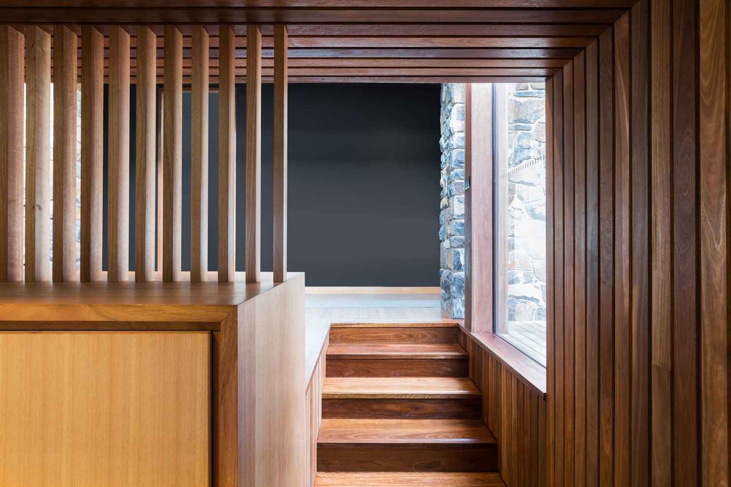 Rozdzielenie budynku na dwa poziomy pozwoliło dopasować się do konturów terenu i funkcjonalnie oddzielić część dzienną od strefy prywatnej. Skrzydło z sypialniami, wykonane z drewna, zbliża się do brzegu jeziora, tworząc bardziej intymną przestrzeń w stylu domku letniskowego lub hangaru na łodzie. Południowe światło przenika przez liście eukaliptusów i wprowadza ciepły klimat do wnętrz. Energia cieplna pozyskiwana jest z jeziora dzięki geotermalnej pompie ciepła z pętlą wodną, natomiast 72 panele fotowoltaiczne zaspokajają zapotrzebowanie na prąd i pozwalają oddawać nadwyżki energii do sieci. Dom zaprojektowano jako niemal całkowicie samowystarczalny – pod względem energii, wody i komfortu cieplnego.