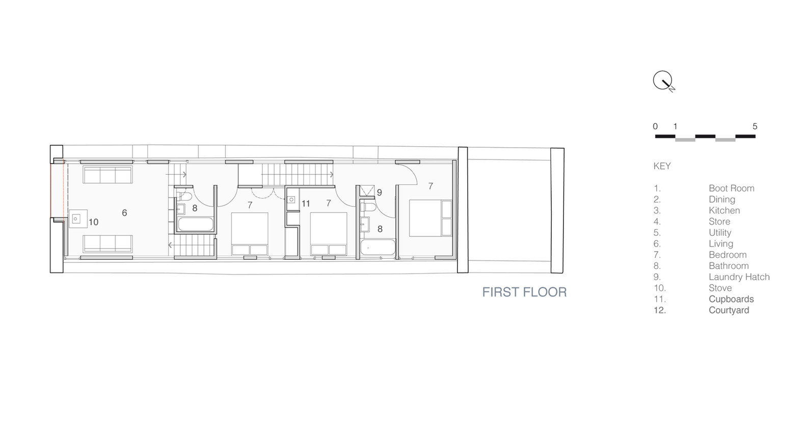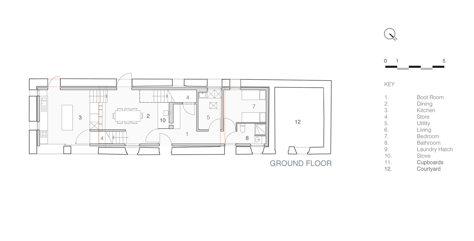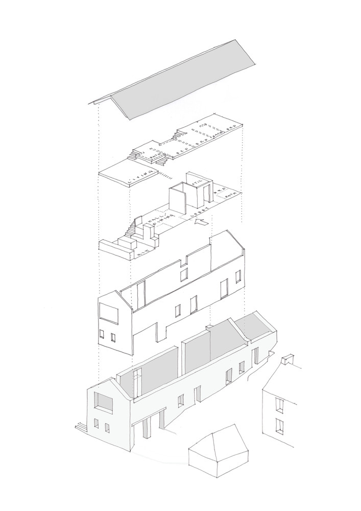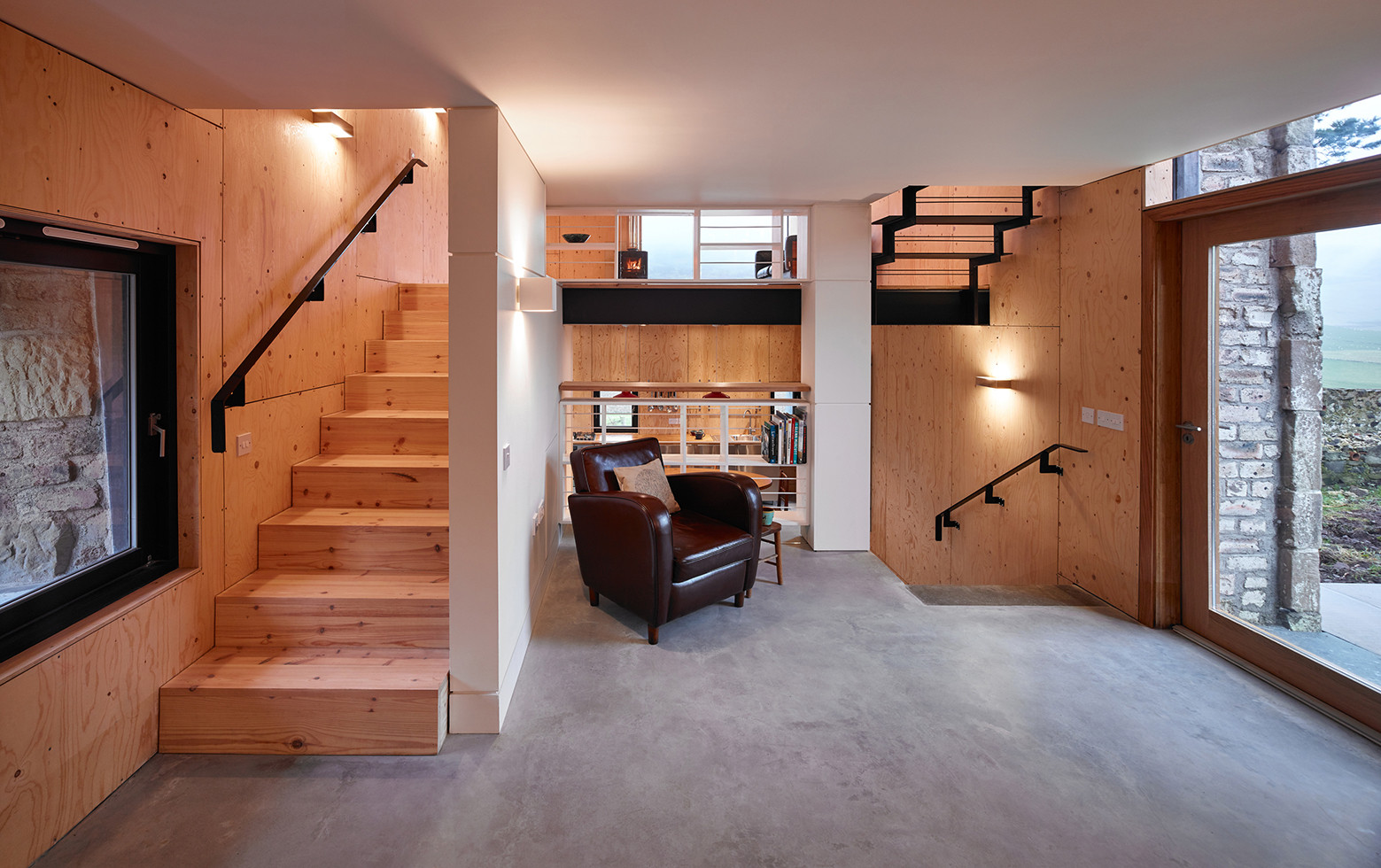Choć otoczony jest innymi nieużywanymi zabudowaniami gospodarczymi, The Mill pozostaje wyjątkowo wyeksponowany – zarówno przez swoje położenie, jak i przez wydłużoną formę, przypominającą nowoczesną stodołę. Architekci zdecydowali się na prostą, solidną przestrzeń mieszkalną z maksymalnym dostępem do światła i widoków. Wnętrze zorganizowano na kilku poziomach. Kuchnia, jadalnia i salon mają własną tożsamość, choć wpisują się w otwarty plan przestrzenny. Świetlik dachowy oraz wcięcia w murach wpuszczają światło do niższych kondygnacji i tworzą poczucie przestronności. Oryginalne kamienne ściany zostały wzmocnione i uzupełnione o nowe drewniane oraz stalowe elementy, z zachowaniem ich autentycznego wyglądu.