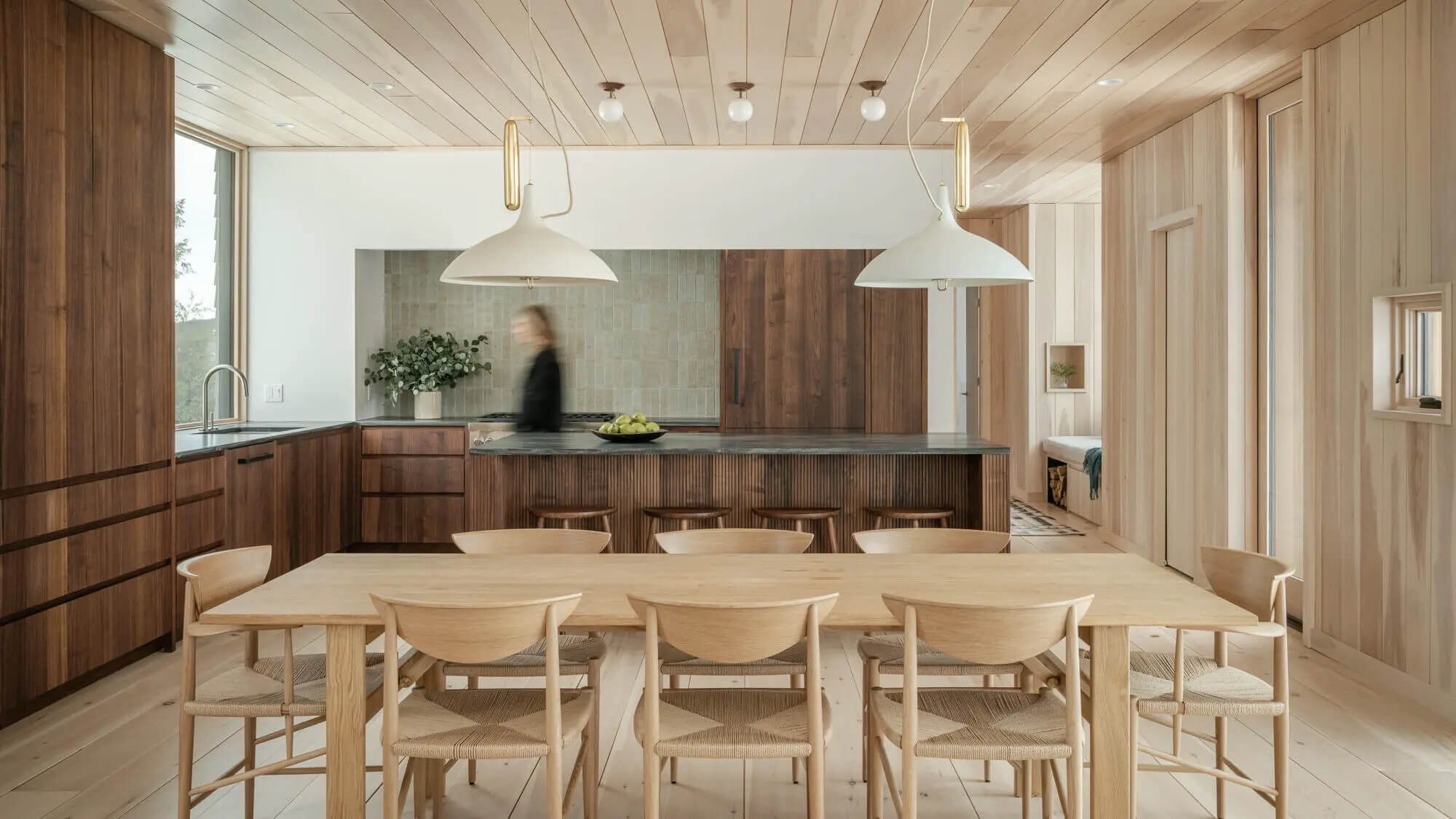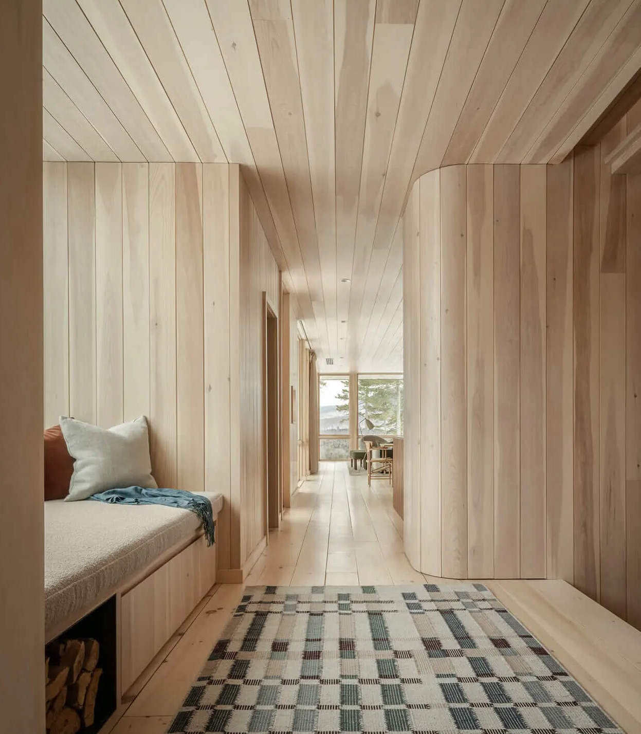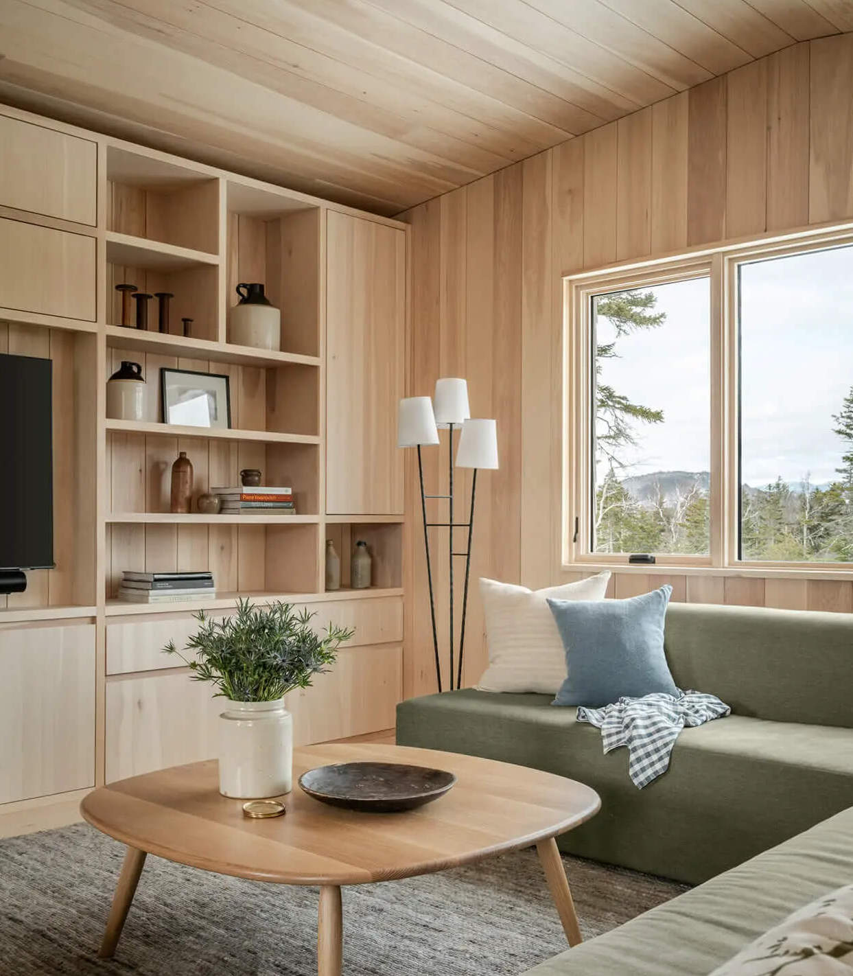 Zewnętrzne materiały nawiązują do tradycji Nowej Anglii, zapewniając jednocześnie trwałość i estetykę. Gonty z białego cedru wschodniego, dach metalowy na rąbek stojący oraz bocznica z czerwonego cedru zachodniego gwarantują odporność na trudne warunki górskie. Wnętrze domu to funkcjonalna i przytulna przestrzeń, zaprojektowana z myślą o komforcie przez cały rok. System ekranów przeciwdeszczowych, solidna izolacja i niezwykła szczelność podnoszą standardy energooszczędności.