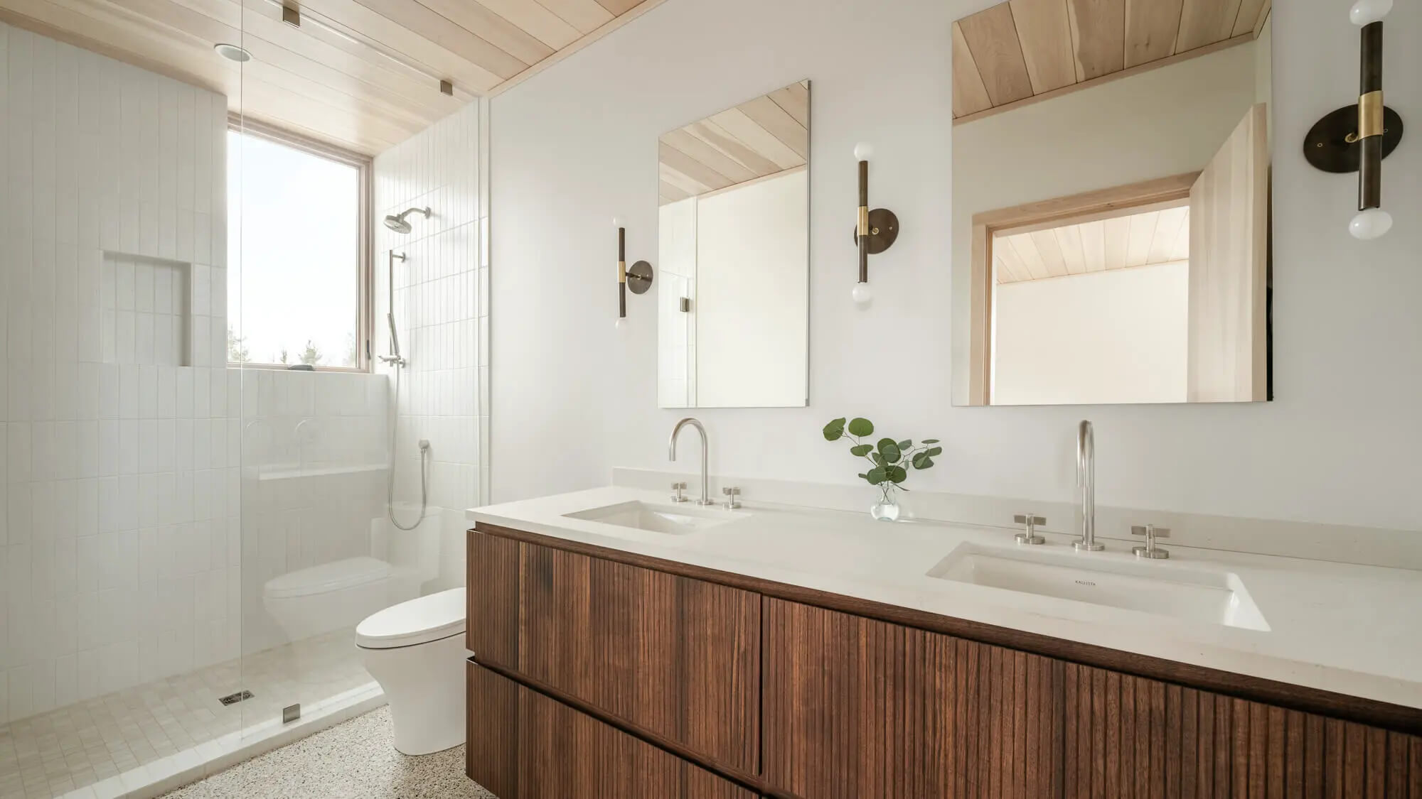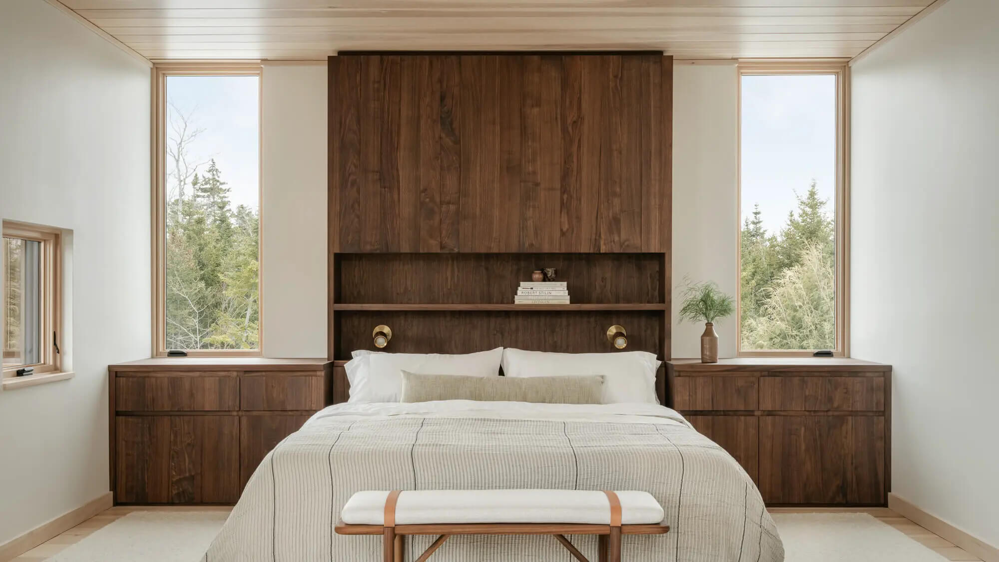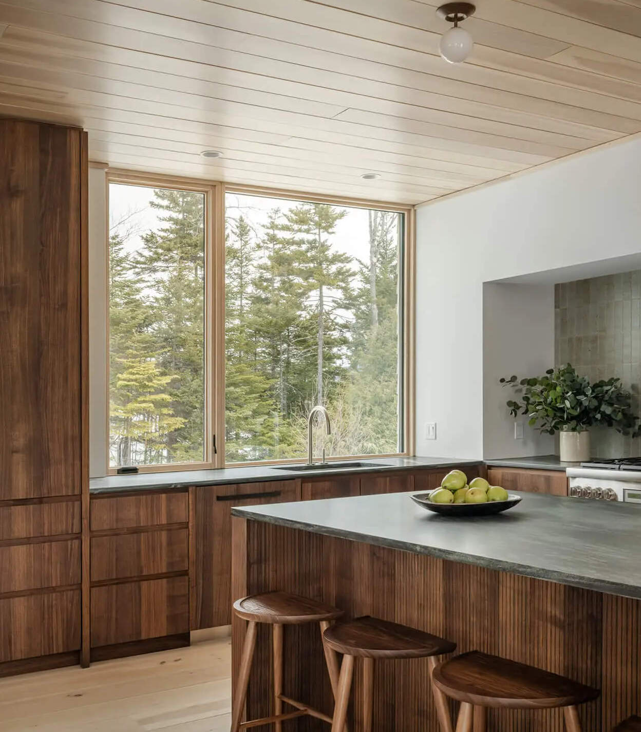Zewnętrzne materiały nawiązują do tradycji Nowej Anglii, zapewniając jednocześnie trwałość i estetykę. Gonty z białego cedru wschodniego, dach metalowy na rąbek stojący oraz bocznica z czerwonego cedru zachodniego gwarantują odporność na trudne warunki górskie. Wnętrze domu to funkcjonalna i przytulna przestrzeń, zaprojektowana z myślą o komforcie przez cały rok. System ekranów przeciwdeszczowych, solidna izolacja i niezwykła szczelność podnoszą standardy energooszczędności.