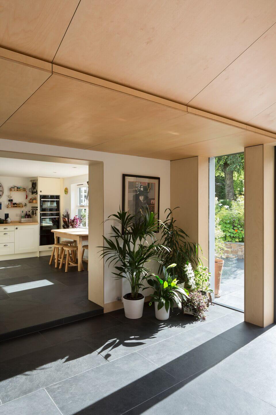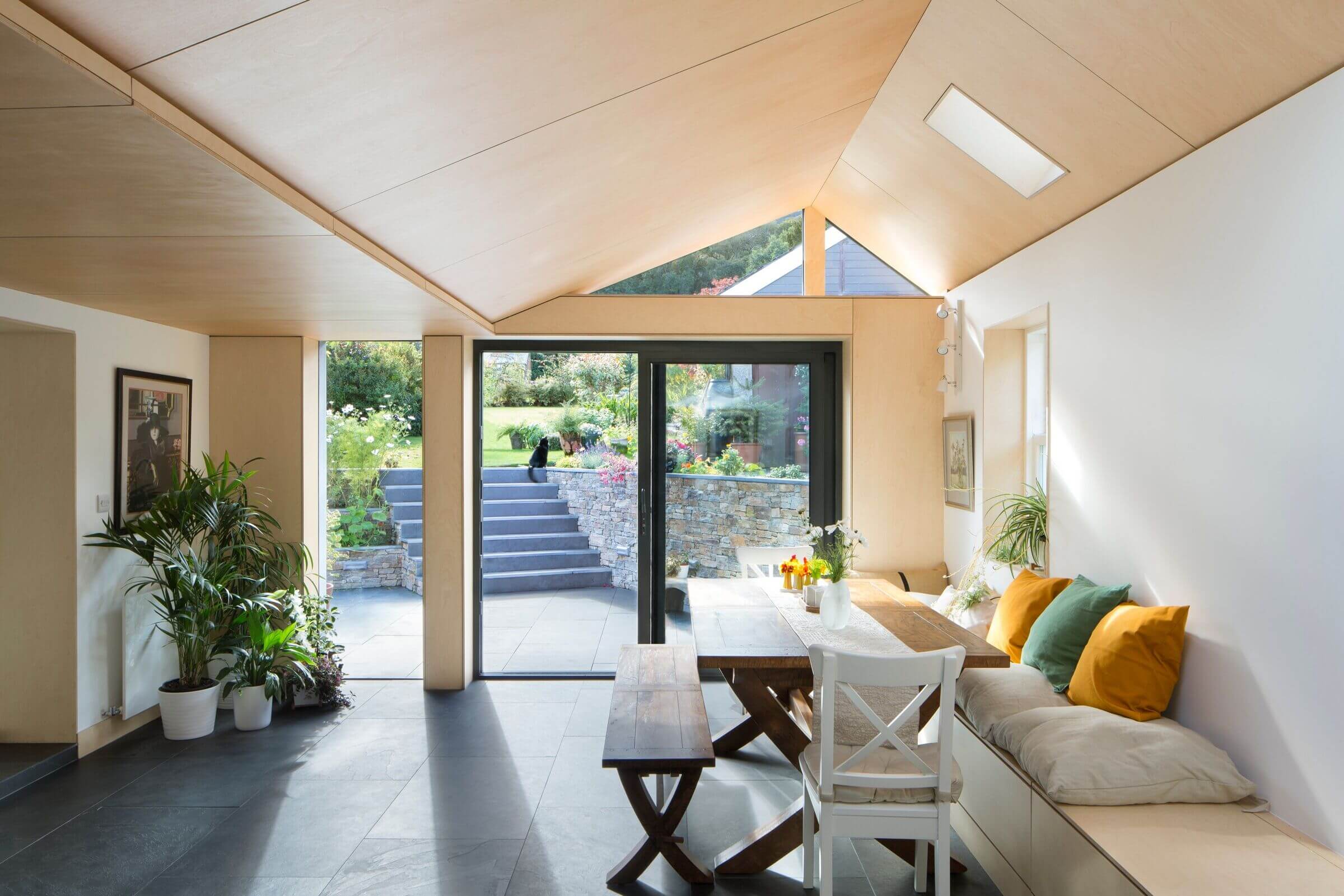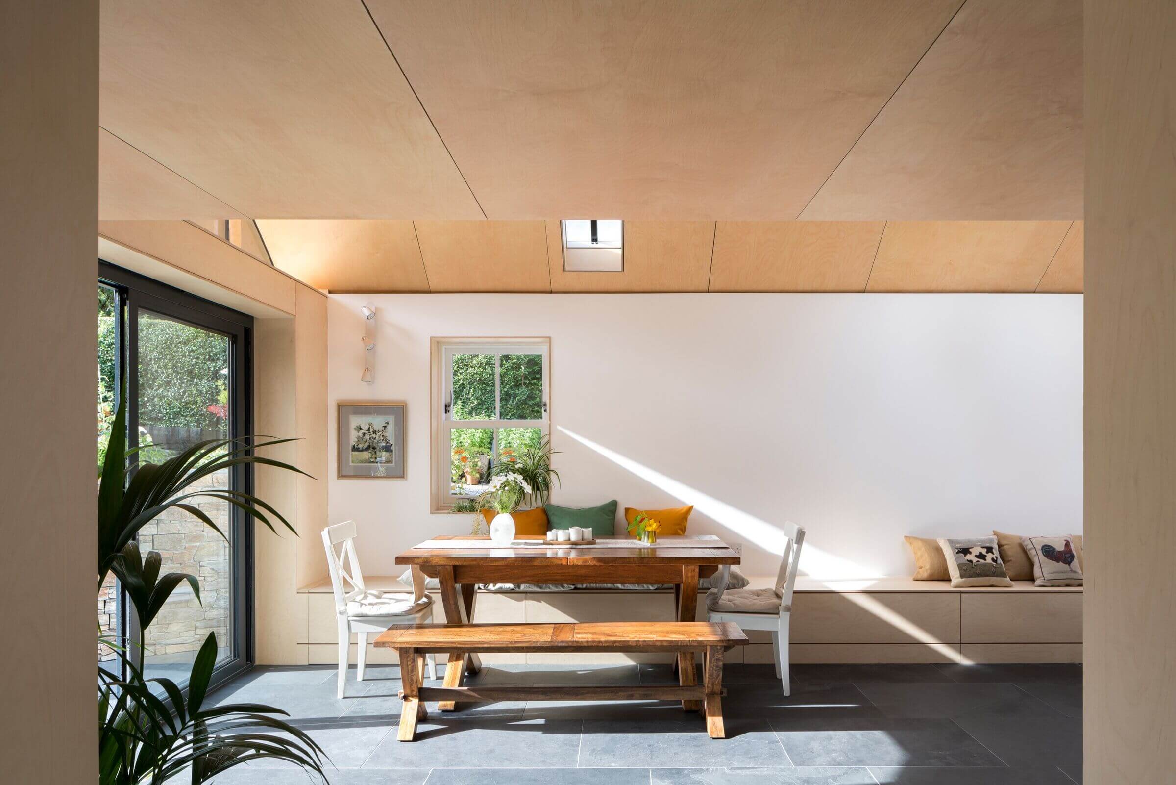 Układ domku został dostosowany do potrzeb klientów, przenosząc kuchnię do dawnej dobudówki, która teraz łączyła wnętrze z ogrodem i nowym, zagłębionym tarasem. Klienci zależało na stworzeniu ciepłego wnętrza, dlatego na suficie oraz jako elementy mebli do zabudowy użyto sklejki brzozowej. Podłoga z łupków biegnąca od wewnątrz na taras sprawia, że przestrzeń zewnętrzna wydaje się integralną częścią domu. Architekci współpracowali z wykonawcami, by upewnić się, że wszystkie materiały, w tym dach łupkowy z pobliskiego opuszczonego domu, pochodziły z lokalnych źródeł. Do budowy dobudówki wykorzystano izolację, aby zminimalizować dodatkowy pobór energii. Dom wyposażono w pompy ciepła, co sprawiło, że cała przestrzeń była jeszcze bardziej energooszczędna.