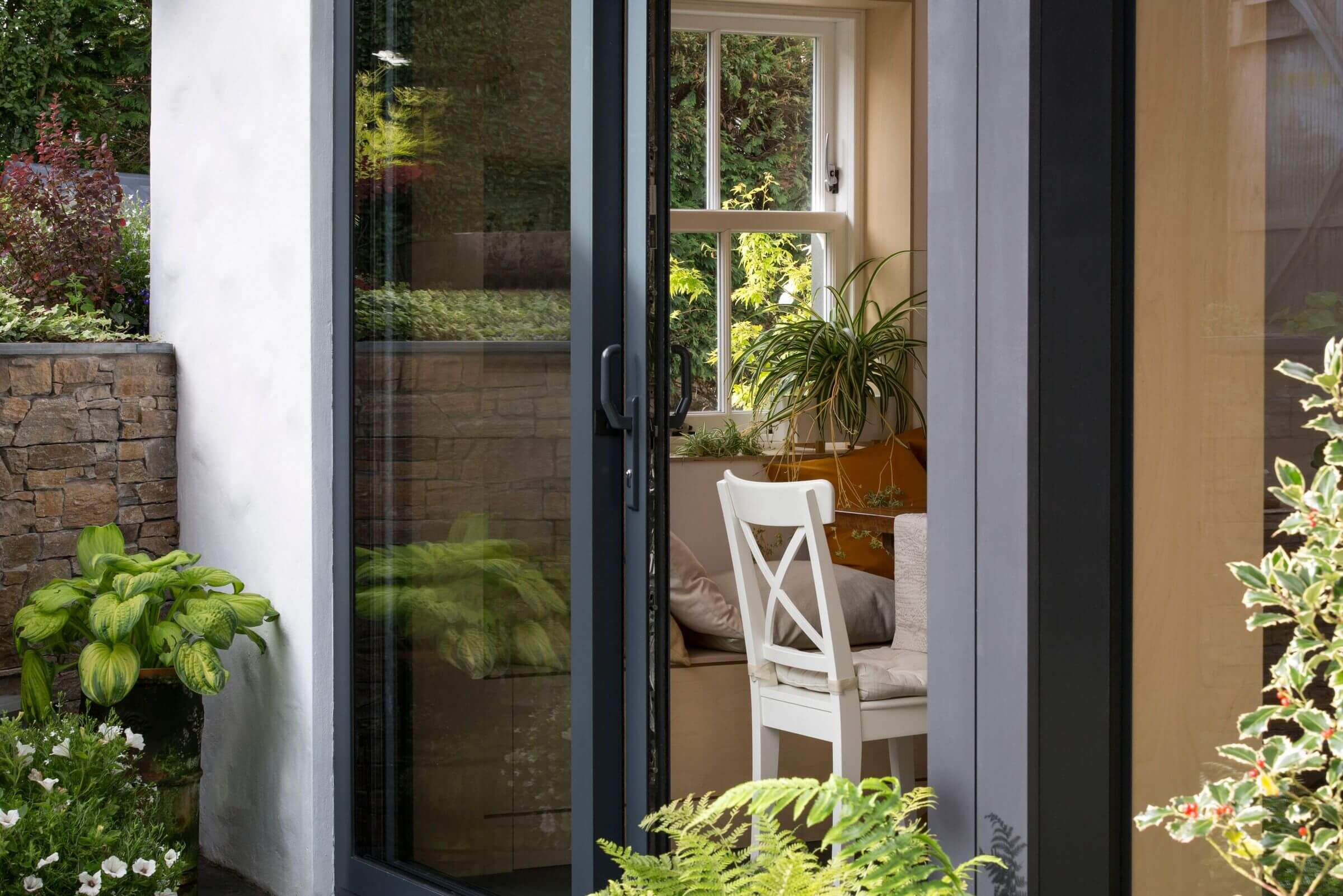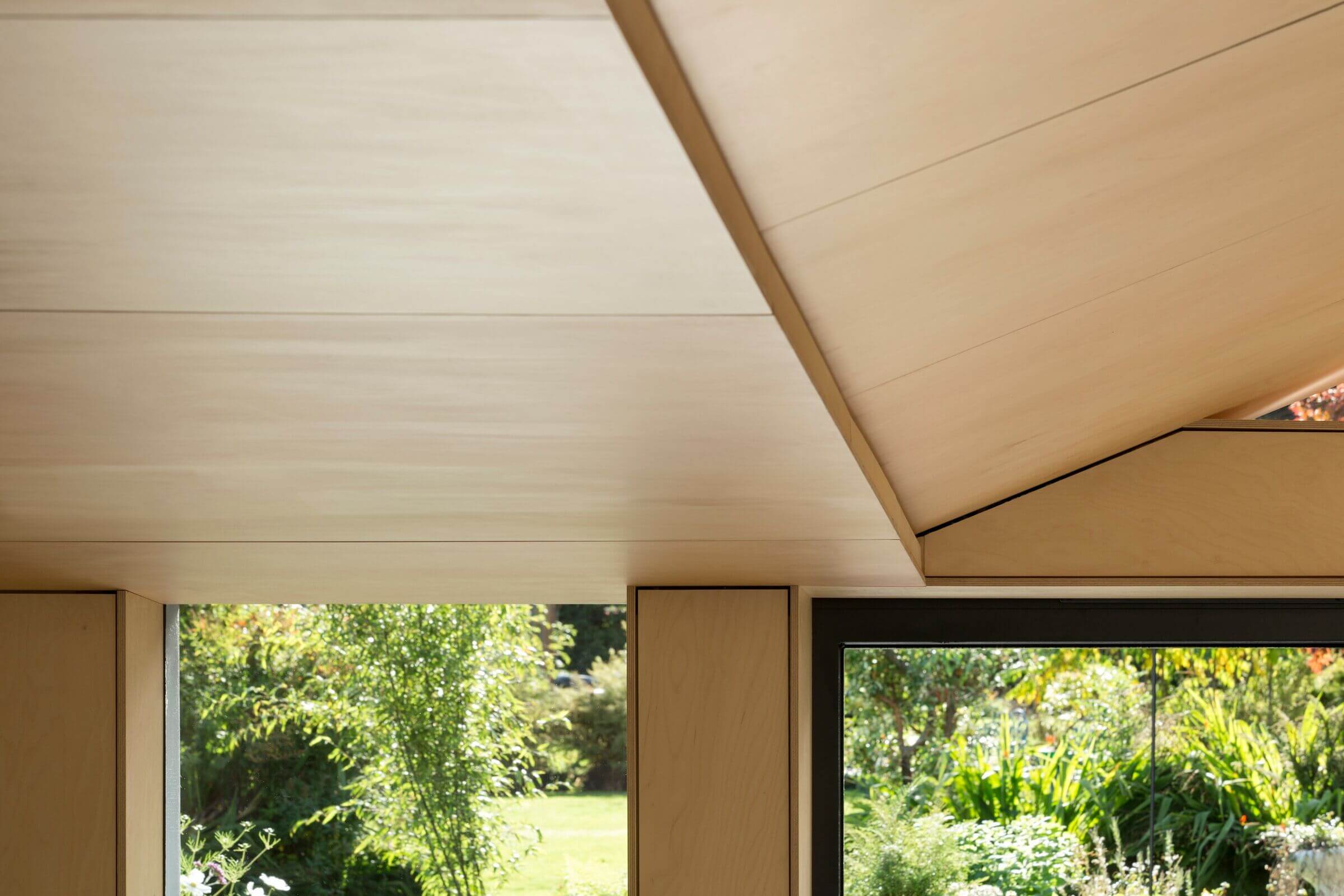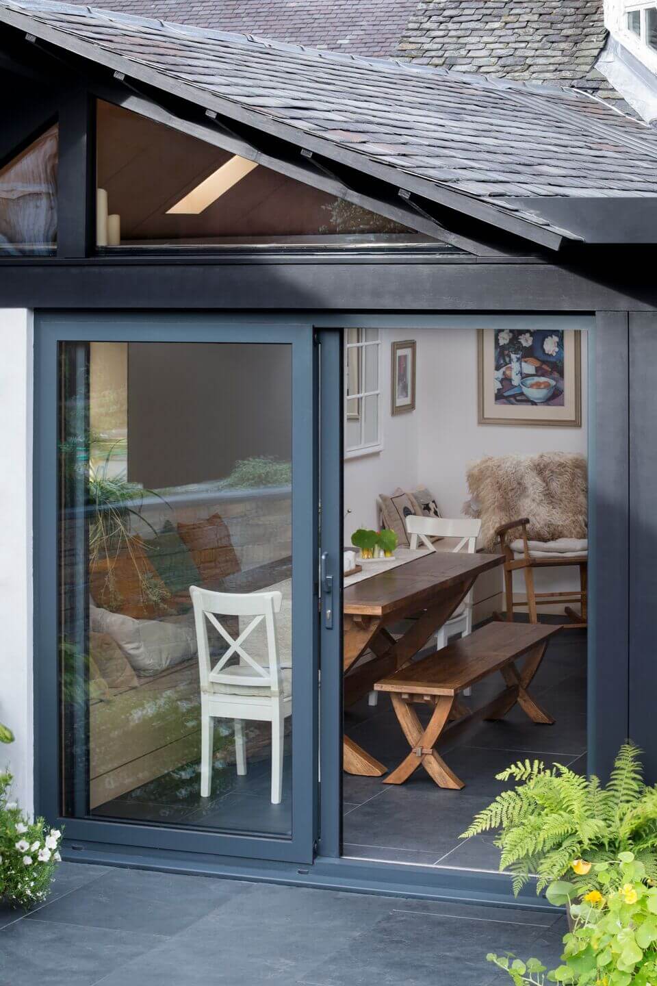 Układ domku został dostosowany do potrzeb klientów, przenosząc kuchnię do dawnej dobudówki, która teraz łączyła wnętrze z ogrodem i nowym, zagłębionym tarasem. Klienci zależało na stworzeniu ciepłego wnętrza, dlatego na suficie oraz jako elementy mebli do zabudowy użyto sklejki brzozowej. Podłoga z łupków biegnąca od wewnątrz na taras sprawia, że przestrzeń zewnętrzna wydaje się integralną częścią domu. Architekci współpracowali z wykonawcami, by upewnić się, że wszystkie materiały, w tym dach łupkowy z pobliskiego opuszczonego domu, pochodziły z lokalnych źródeł. Do budowy dobudówki wykorzystano izolację, aby zminimalizować dodatkowy pobór energii. Dom wyposażono w pompy ciepła, co sprawiło, że cała przestrzeń była jeszcze bardziej energooszczędna.