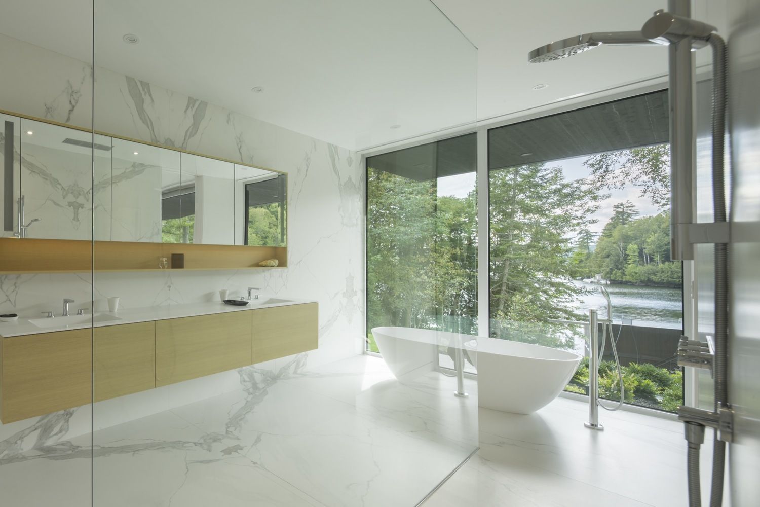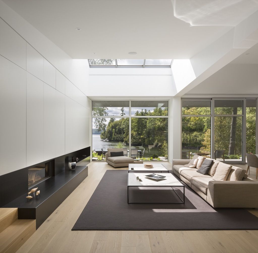 Surowy wygląd części zewnętrznej domu stanowi kontrast dla obszernych, przestronnych i jasnych wnętrz całego domu. Duże okna wykuszowe, świetliki oraz nieskazitelnie białe ściany dosłownie zalewają wnętrze światłem i oferują zapierające dech w piersiach widoki na jezioro. Sufity o różnych wysokościach zmieniają swą wysokość stosownie do pomieszczeń, miejscami przekraczając 7 metrów. Wszystkie pokoje domu ustawione są tak, by tworzyły pojedynczy rząd. W tej luksusowej rezydencji znajdziemy więc sypialnię główną z łazienką, dwa nowoczesne apartamenty z łazienkami i niedużym, sąsiadującym z nimi salonem, saunę i salę do ćwiczeń. Korytarz, który łączy główne wejście z wyjście na taras na parterze, prowadzi też do garażu, pralni i spiżarni, która z kolei łączy się z kuchnią ukrytymi drzwiami.