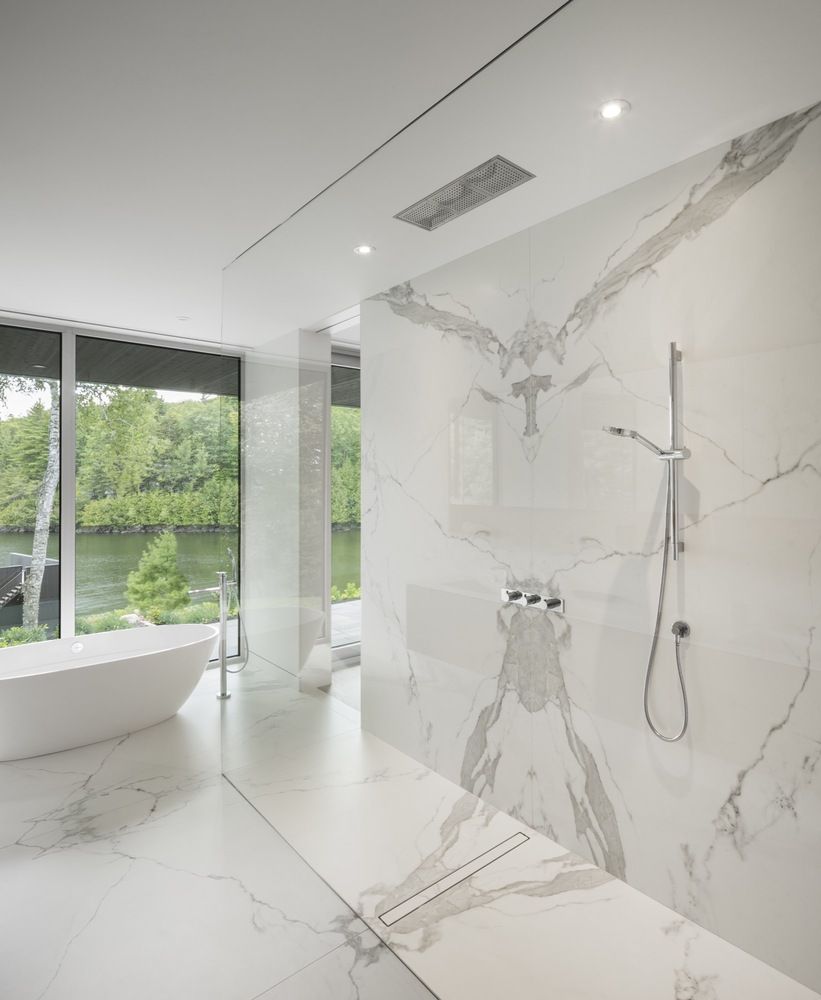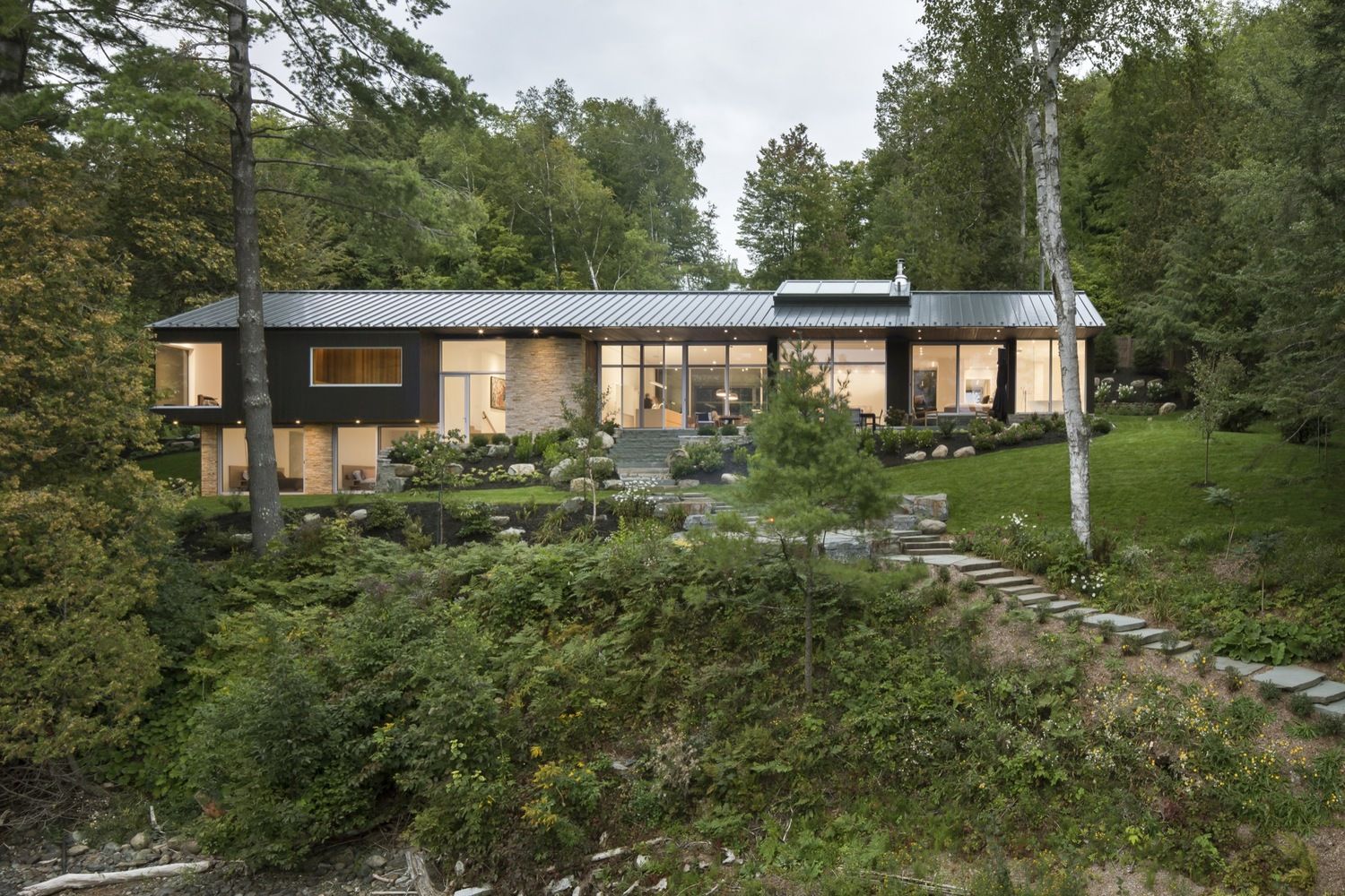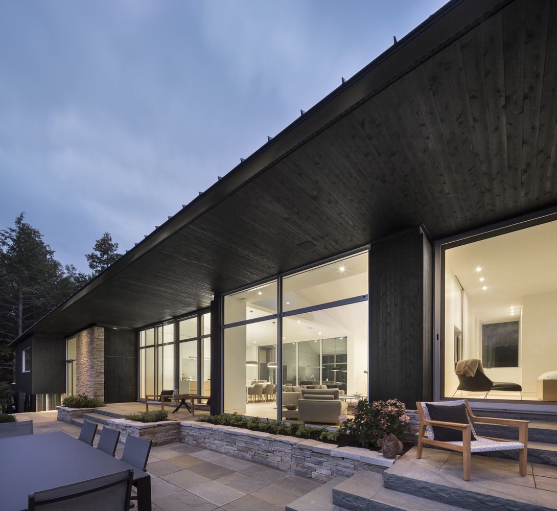 Projekt o nazwie Slender House Residence stanął w pięknym regionie Eastern Townships w pobliżu amerykańskiej granicy w kanadyjskim Quebecu. Dom ma kształt smukły i podłużny, a ulokowany jest na stromym brzegu jeziora Memphremagog, otwierając się na spokojną, ustronną zatoczkę. Czarna stodoła o powierzchni ponad 400 metrów kwadratowych została solidnie zakotwiczona w skale, dzięki licznym murom oporowym i kamiennym tarasom. Potężne, masywne elementy granitowe, pozyskiwane lokalnie, służą jako podstawa, na której stanął dom o ostrych krawędziach z długim dachem. Od strony ulicy dach o długości blisko 34 metrów wydaje się być piątą fasadą budynku.